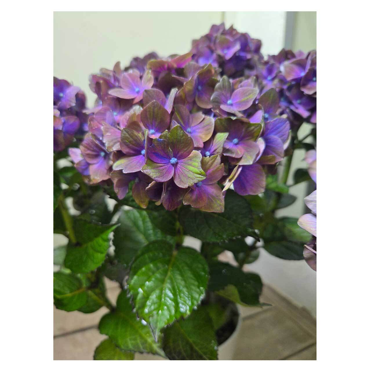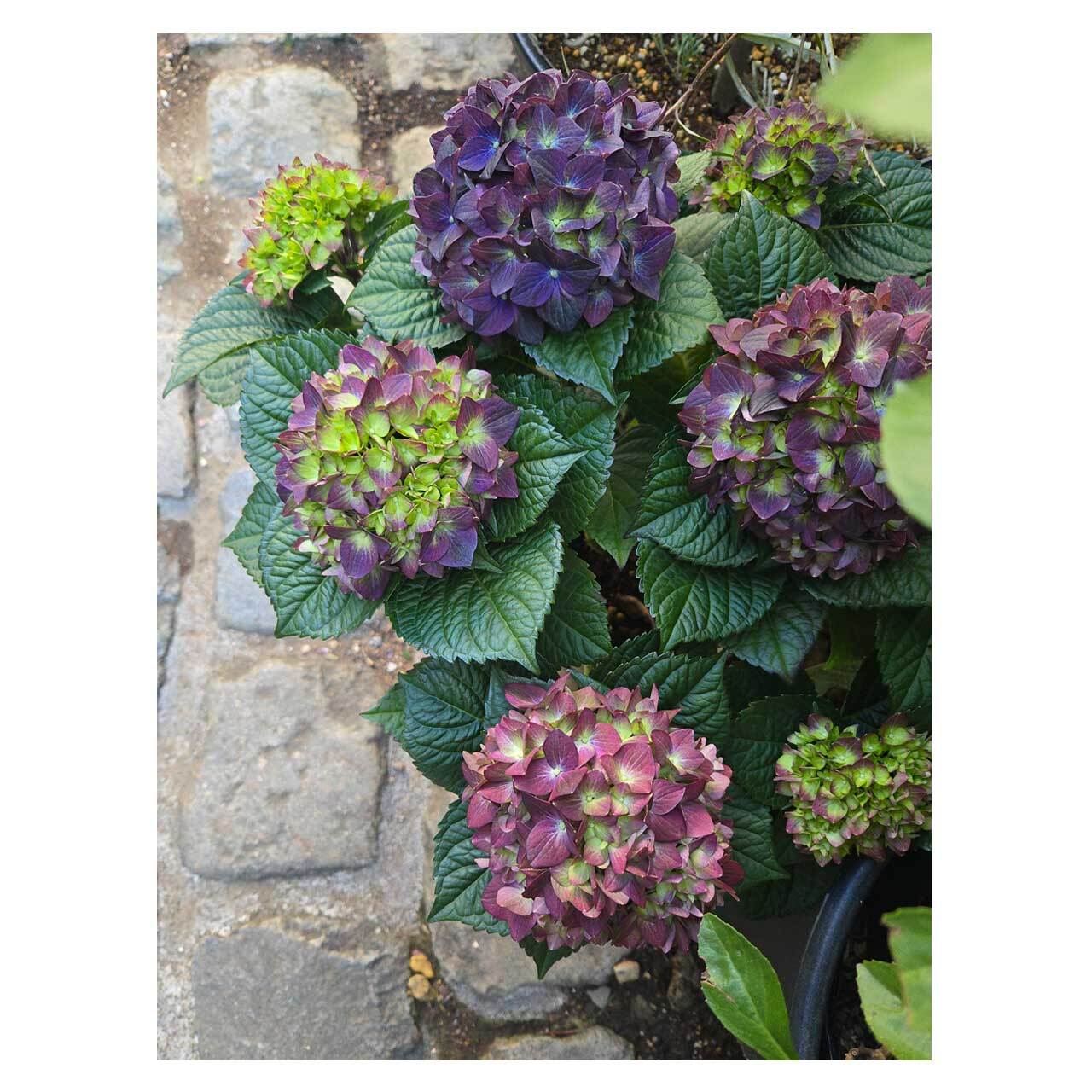 黄緑~赤紫~紫と、濃い花色が入り混じる アジサイ マジカルチョコレート(パープル)。シックな色あいで目を惹きます。