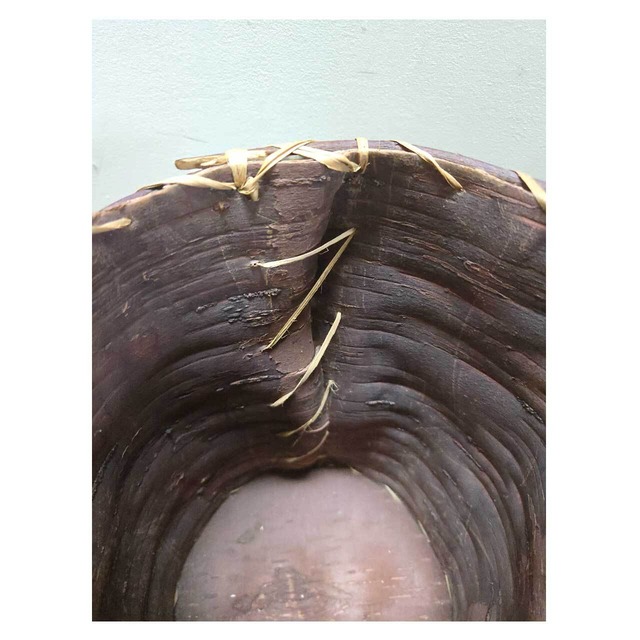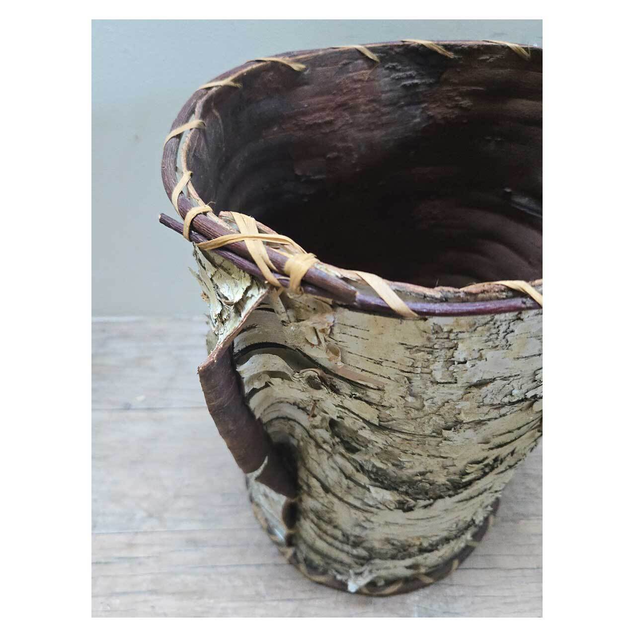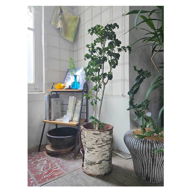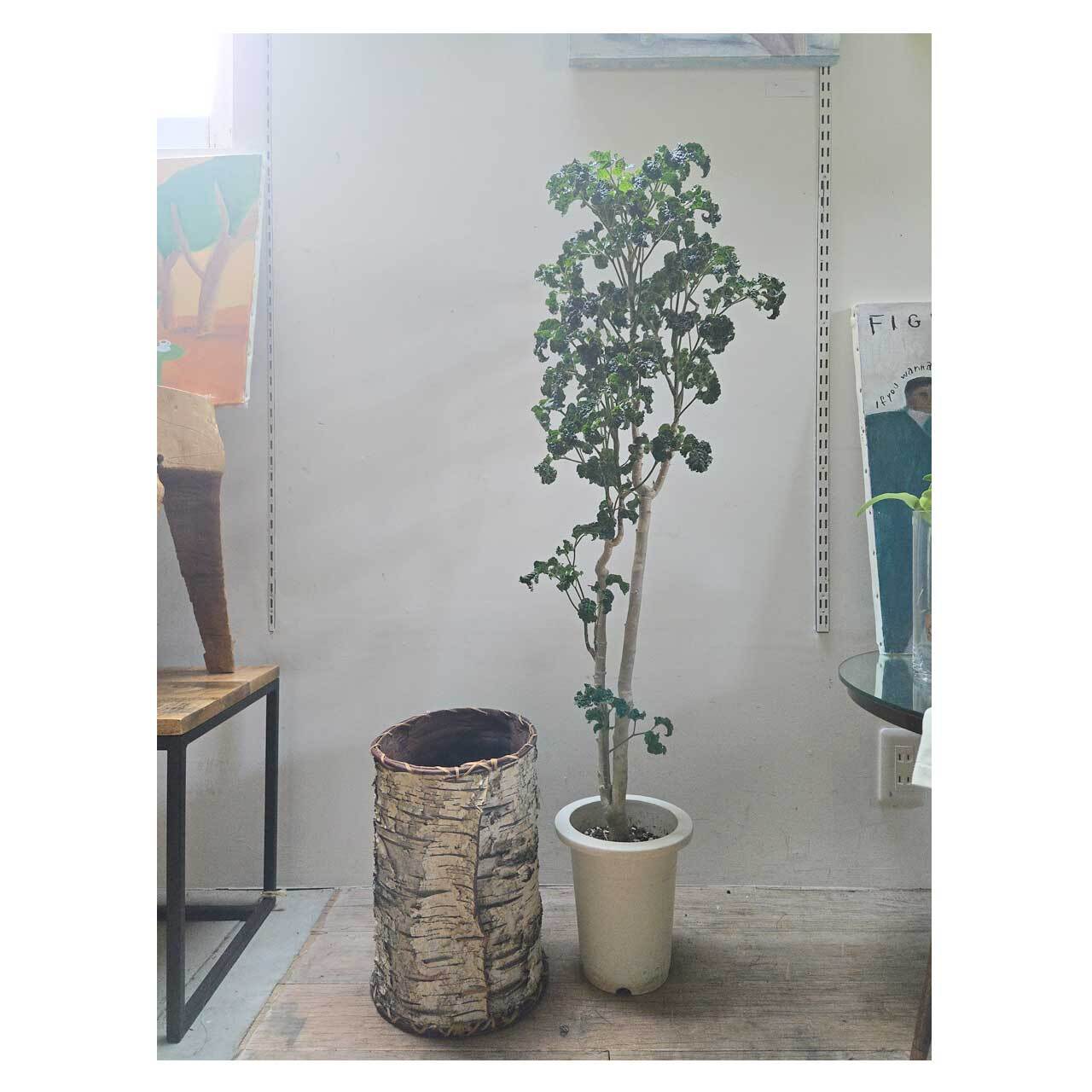 白樺の素材や風合いが、他には無い存在感を発揮してくれます。少し形が歪で、内部はポリシャスの白い鉢の上部がギリギリ入るくらいの幅です。今回は個性派同士で組み合わせてみましたが、それぞれがインテリアとして目を惹く存在なので、組み合わせや用途を変えながらお楽しみいただけたらと思います。