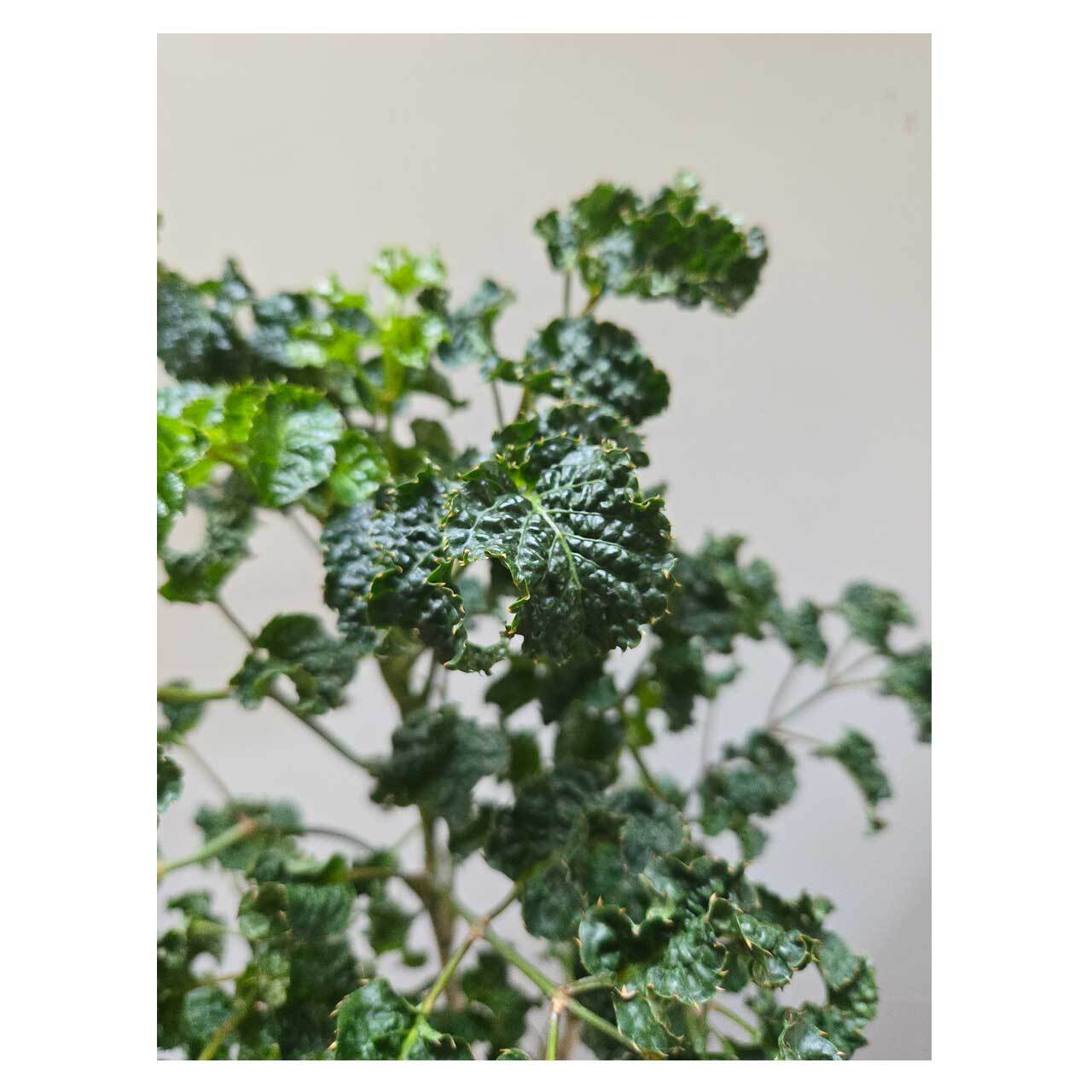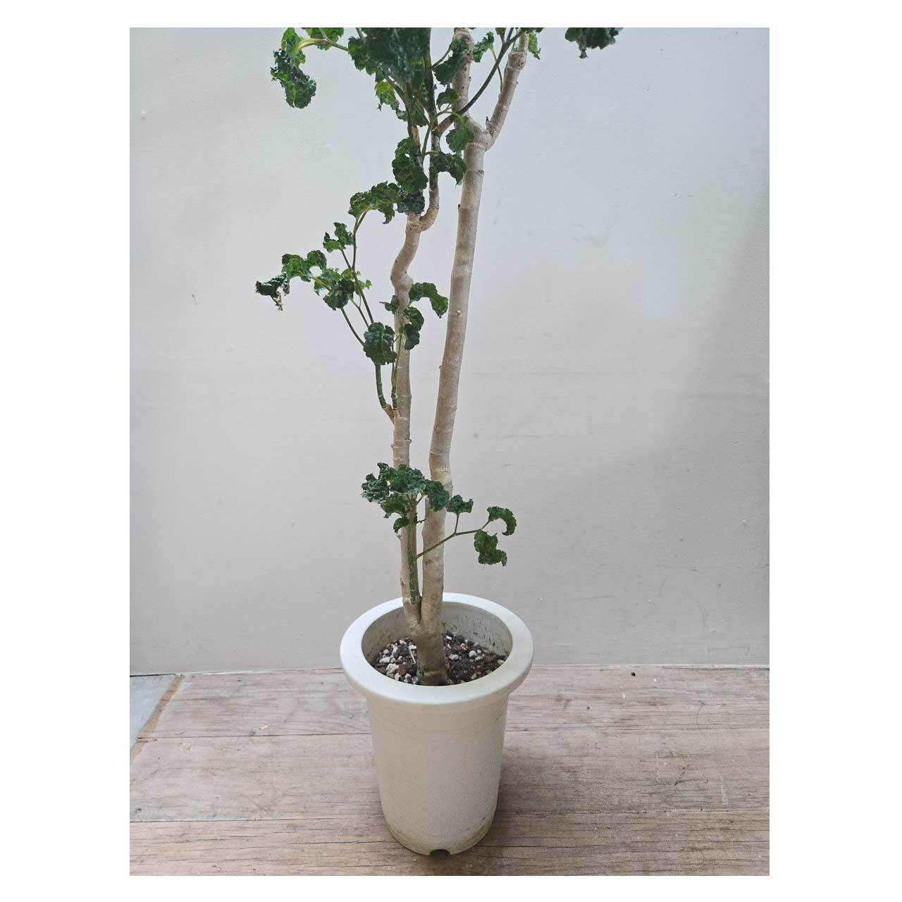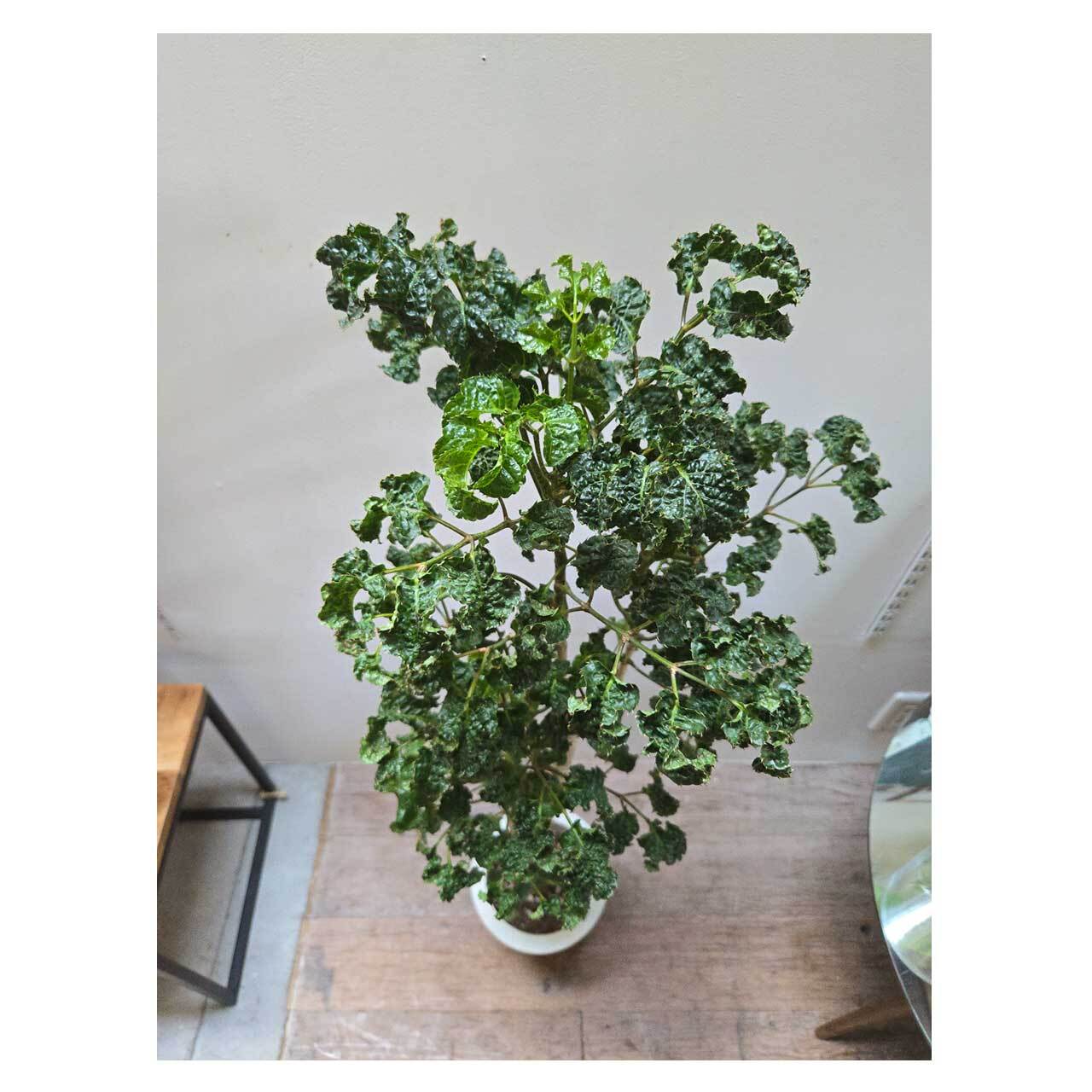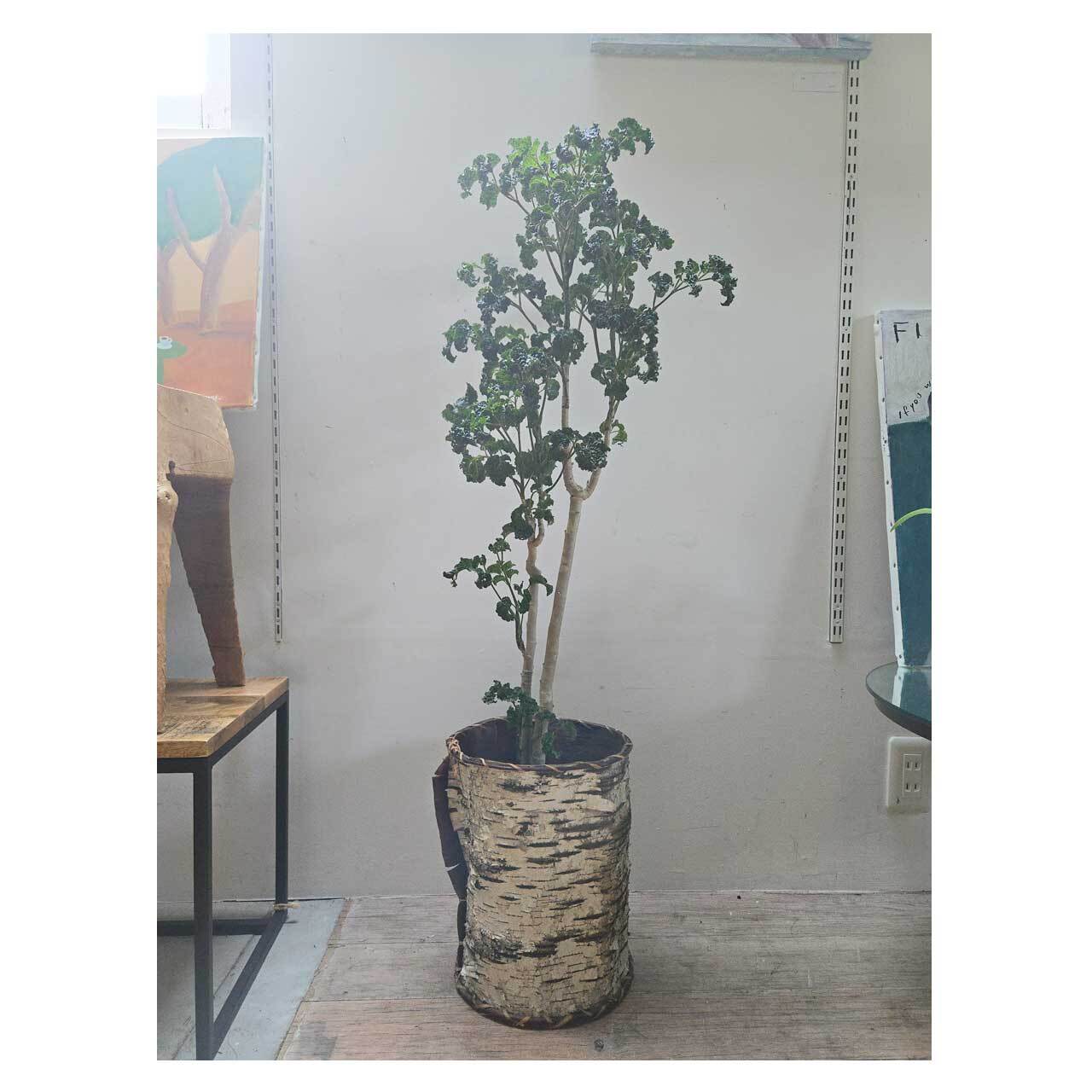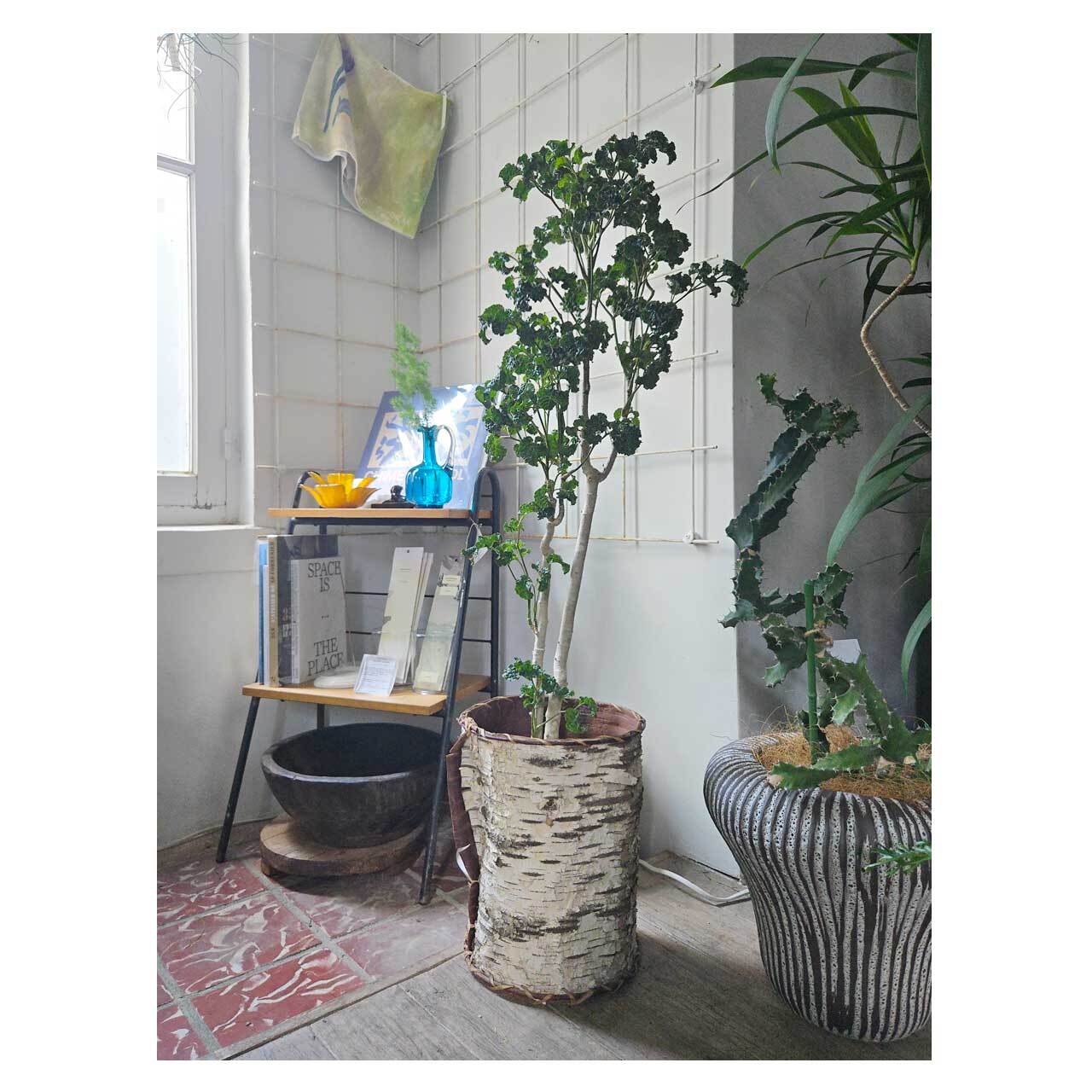 独特な個性を発揮しているこちらは、素材に白樺が使われています。1960~70年代前後の日本のものだそうです。あわせた植物は、ポリシャス キャツガ。こちらも個性的で、シワシワと縮れたような濃い緑の葉、遠目に見るとパセリのようなフォルムがとてもユニークです。