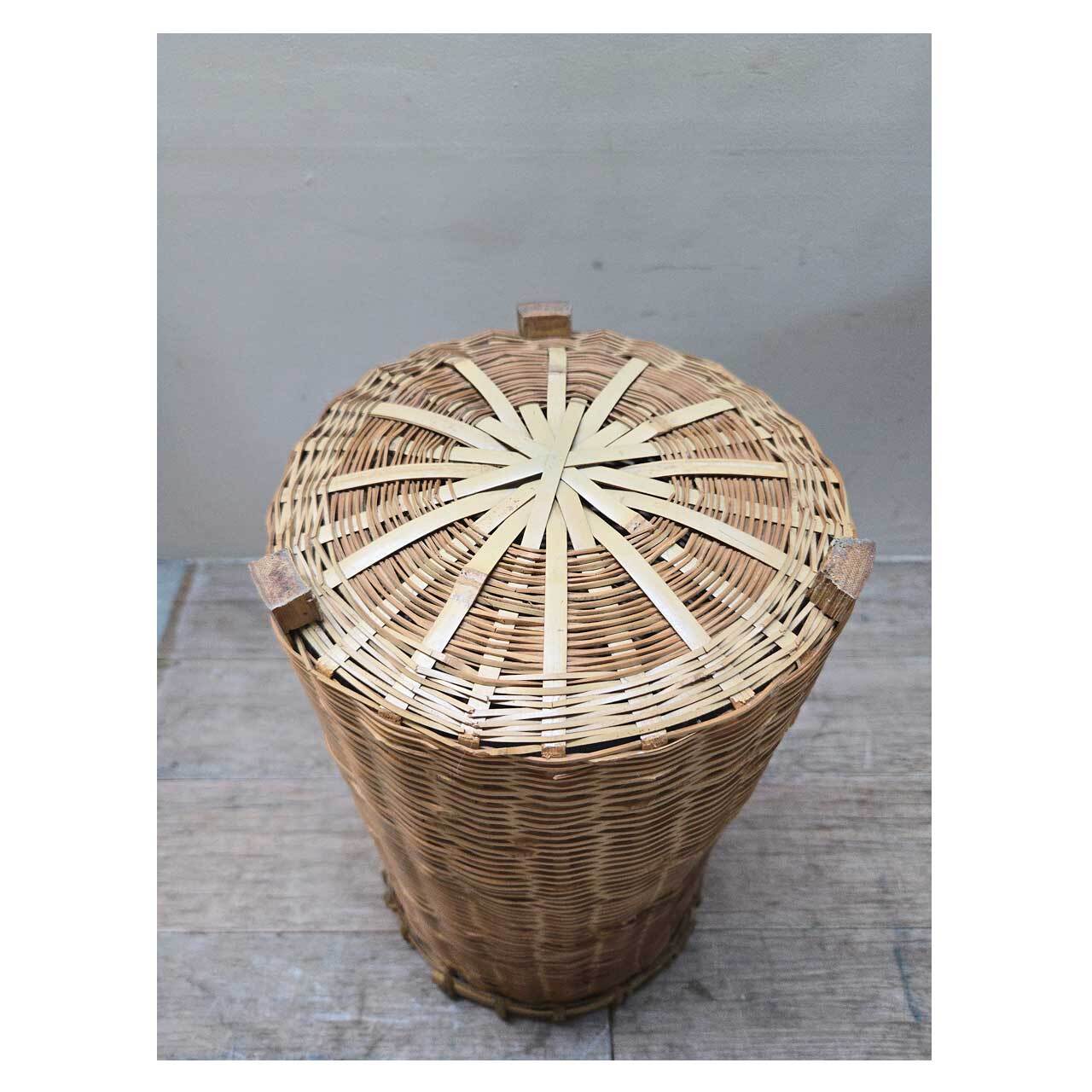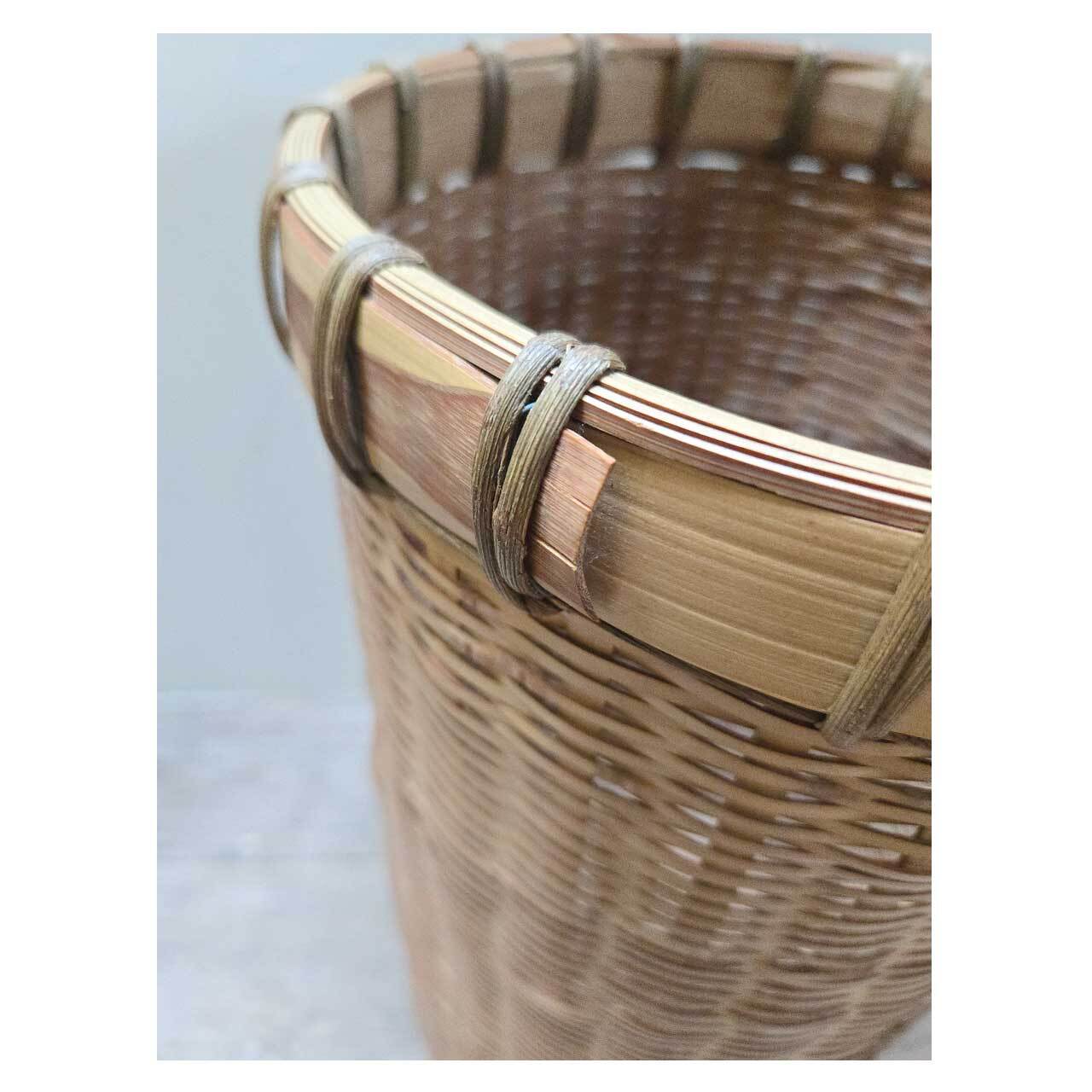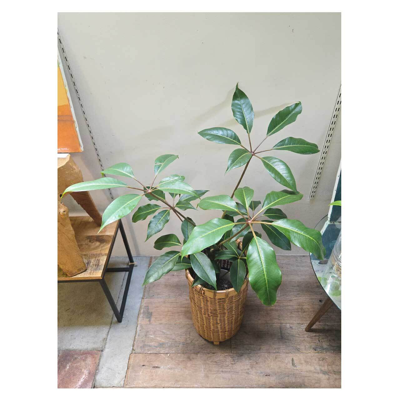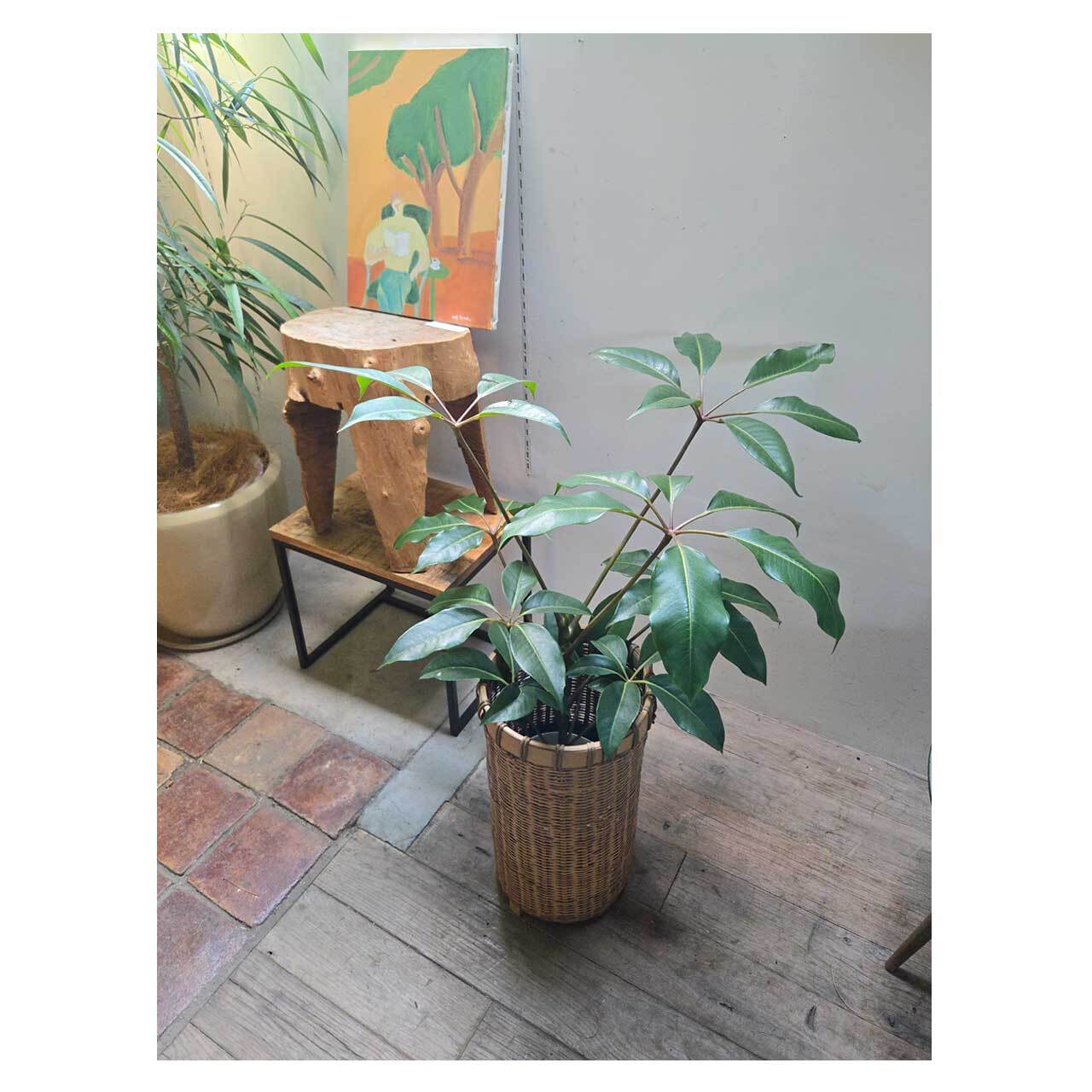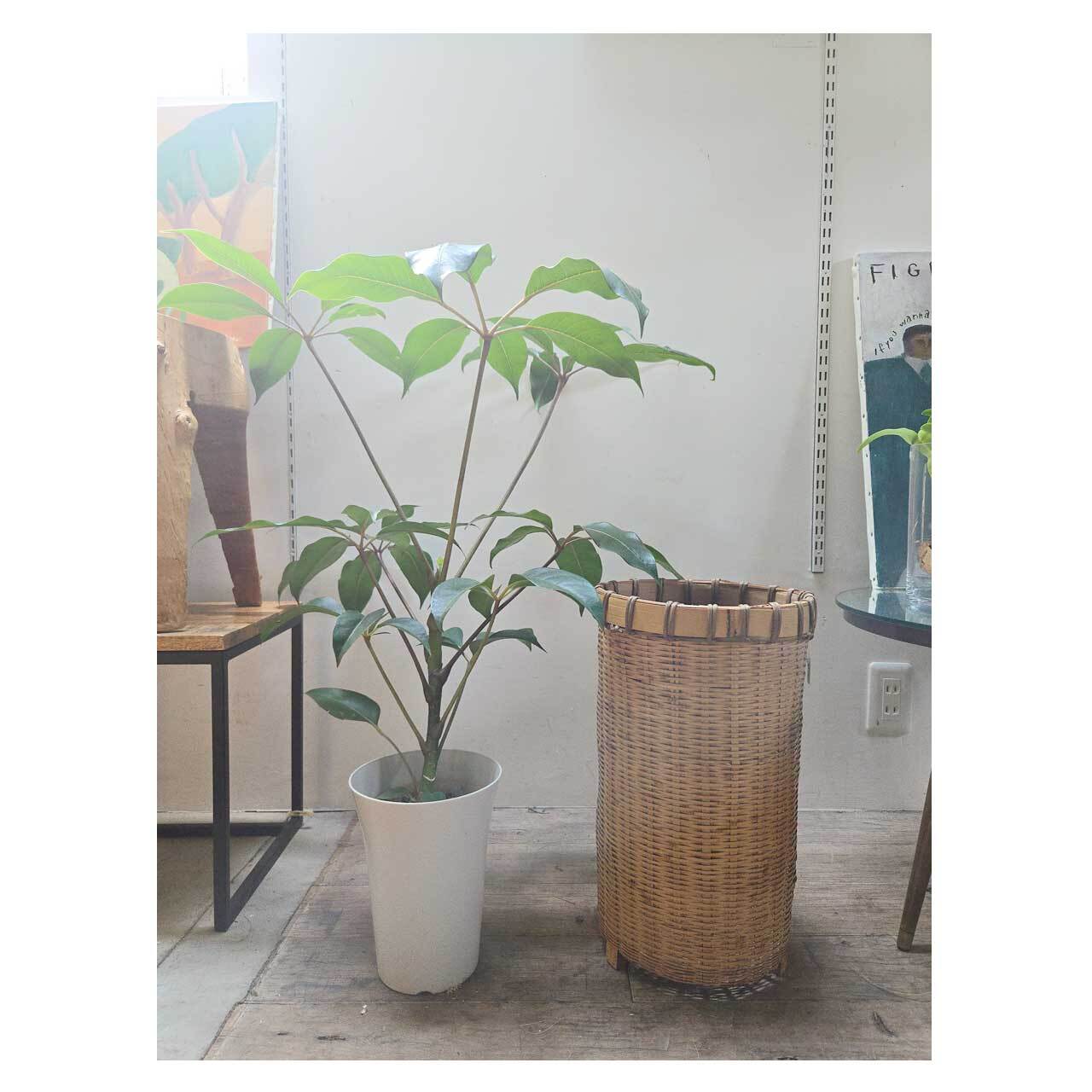 渋めの色あいと縦長フォルムが特徴的な、国産竹細工のバスケット。よく見ると脚付きです。1960~70年代前後の日本のものだそうです。あわせた植物は、ツピタンサス(シェフレラ ピュックレリ)。掌状に広がる艶やかな葉が特徴的な、柔らかな雰囲気の観葉植物です。