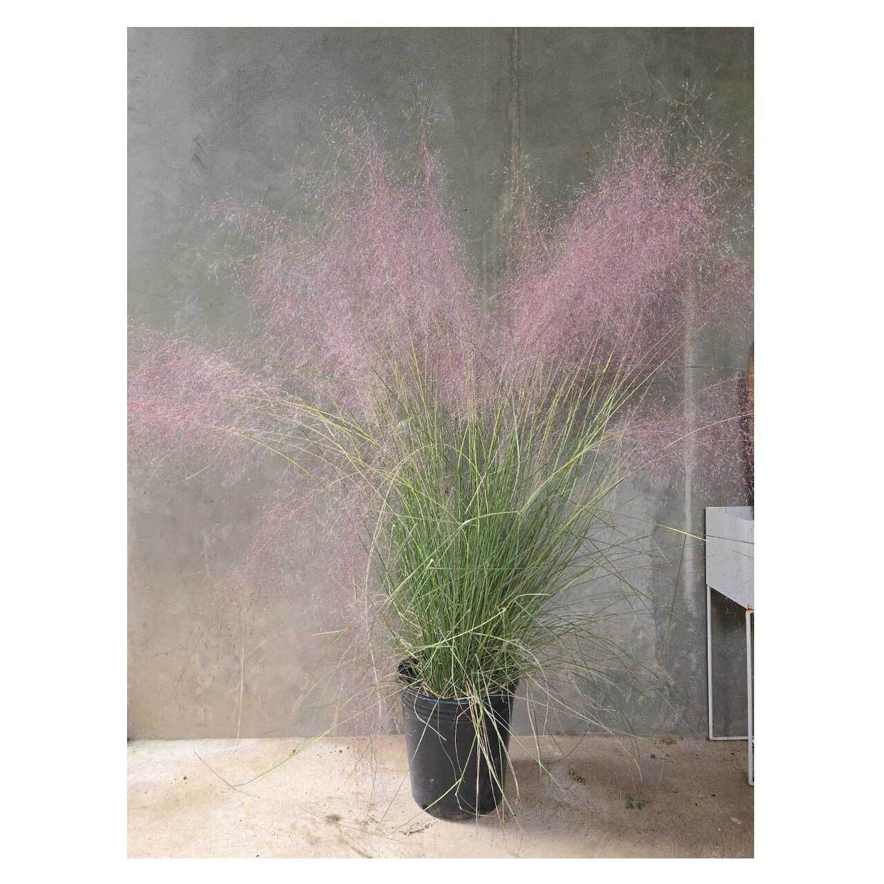 ミューレンベルギアは北アメリカなどが原産のイネ科の宿根草で、ミューリーグラスとも呼ばれます。細く硬めの葉、夏~秋になるスモーク状の赤みを帯びた花穂が特徴的です。
