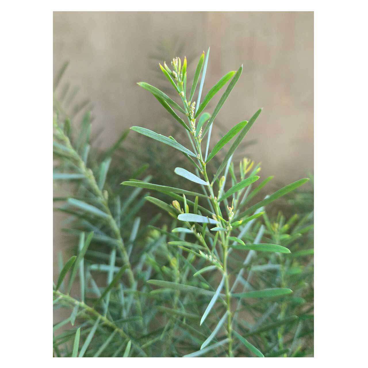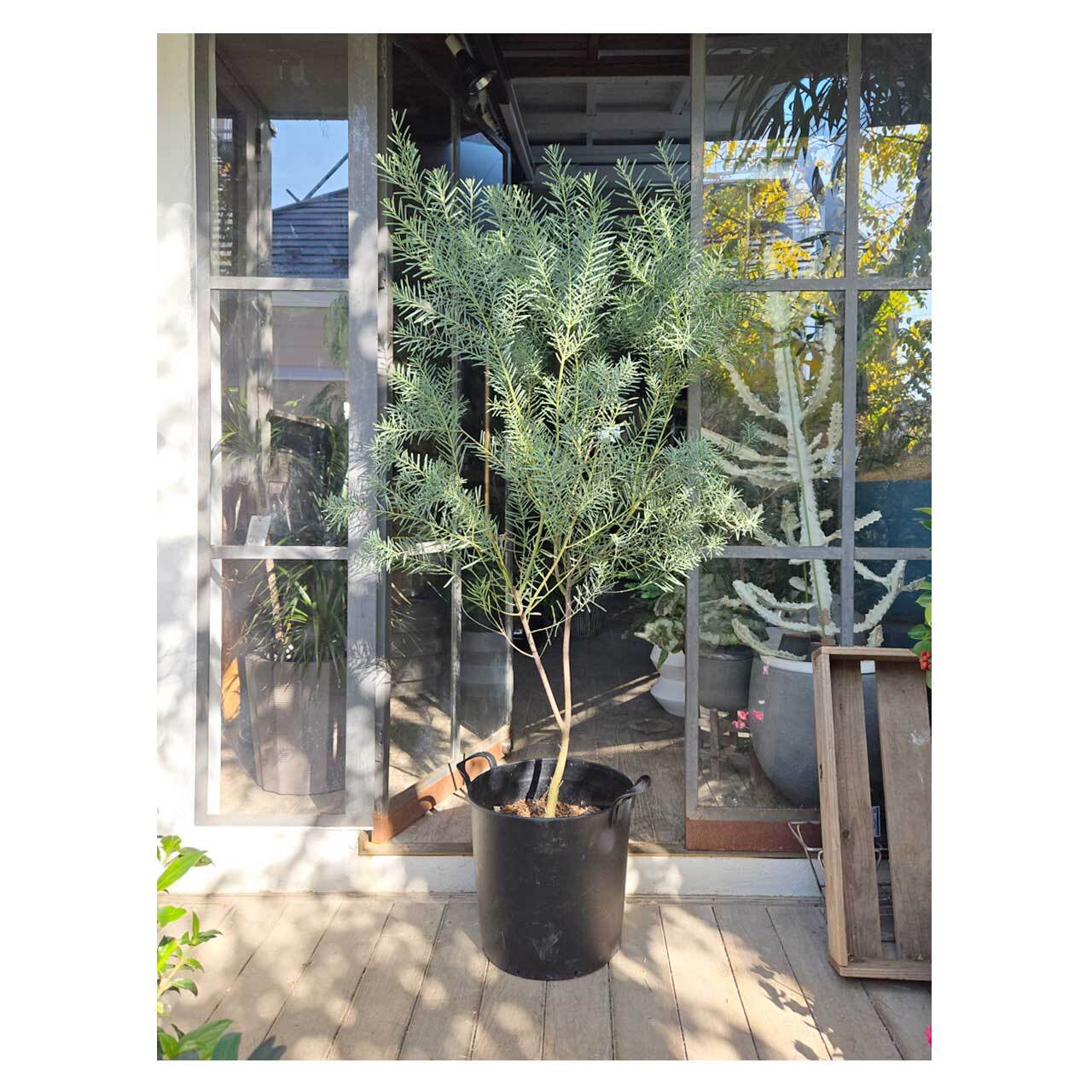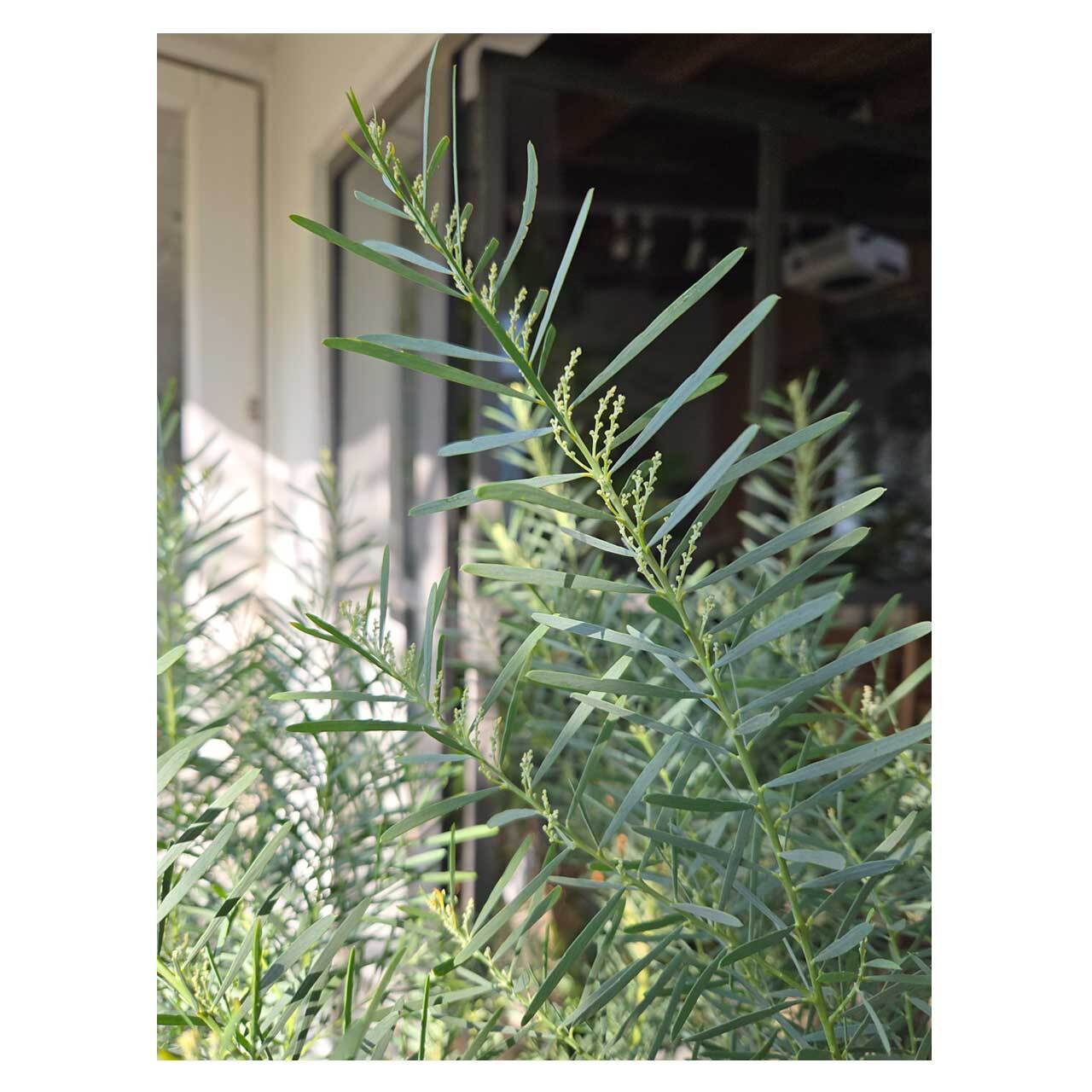 熱帯・亜熱帯地域に分布するアカシアは世界で約600種ほどあります。こちらのスノーウィーリバーはオーストラリア原産で、灰緑色の線形の葉を持ち、芳香のある黄色の花を咲かせます。樹高2~4mとアカシアの中ではコンパクトに育つ品種で、地際から株状になりやすいため管理しやすく、限られたスペースにおすすめです。