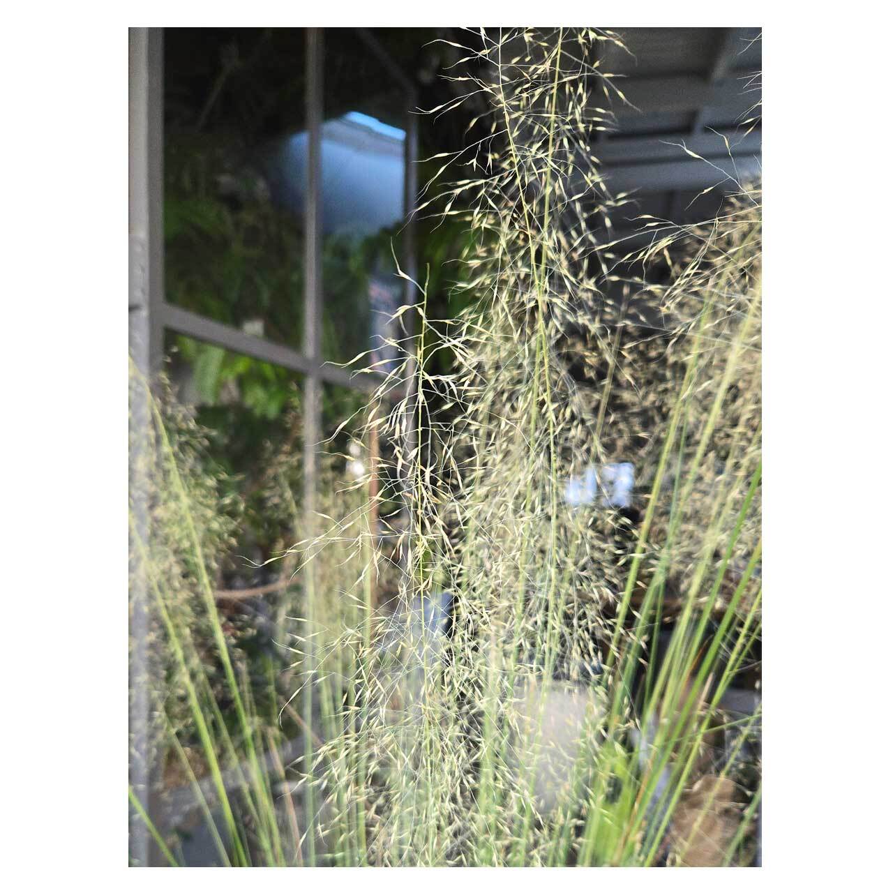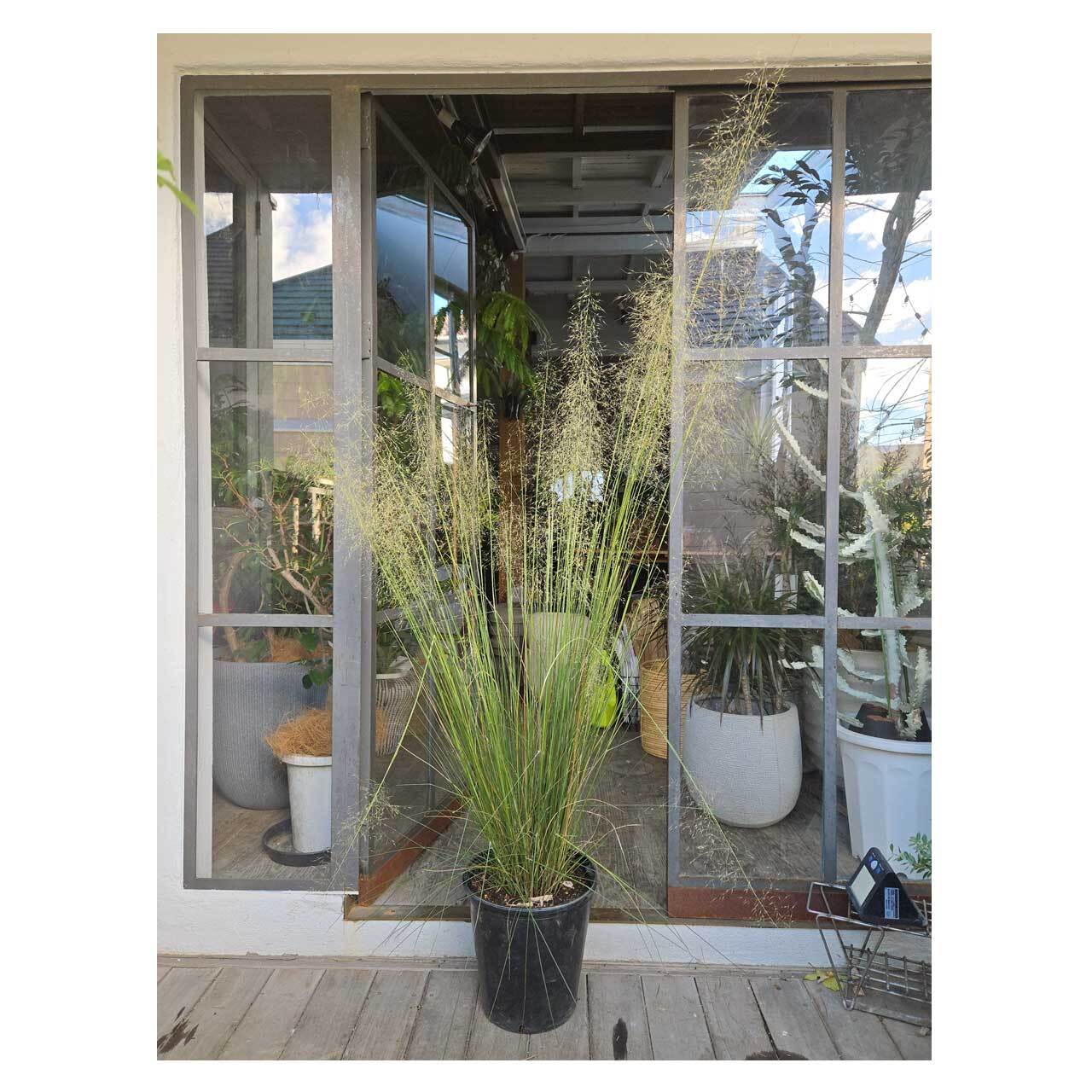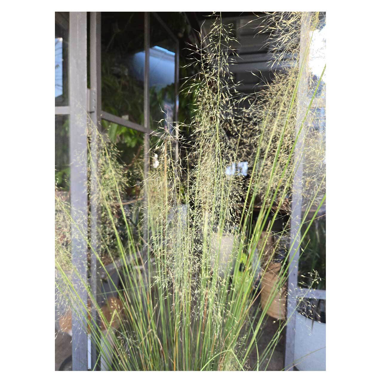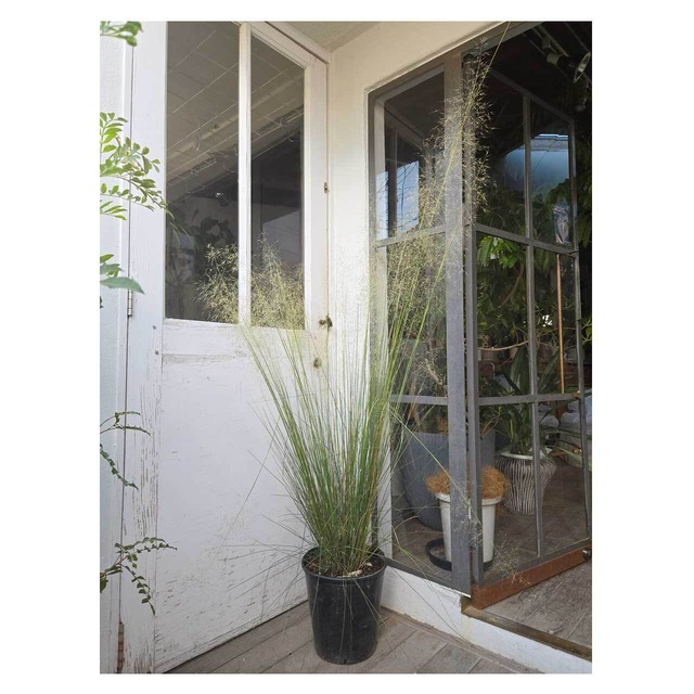 ミューレンベルギアは北アメリカなどが原産のイネ科の宿根草で、ミューリーグラスとも呼ばれます。細く硬めの葉、夏~秋になるスモーク状の花穂が特徴的で、こちらのアルバという品種は、白い花穂のタイプです。