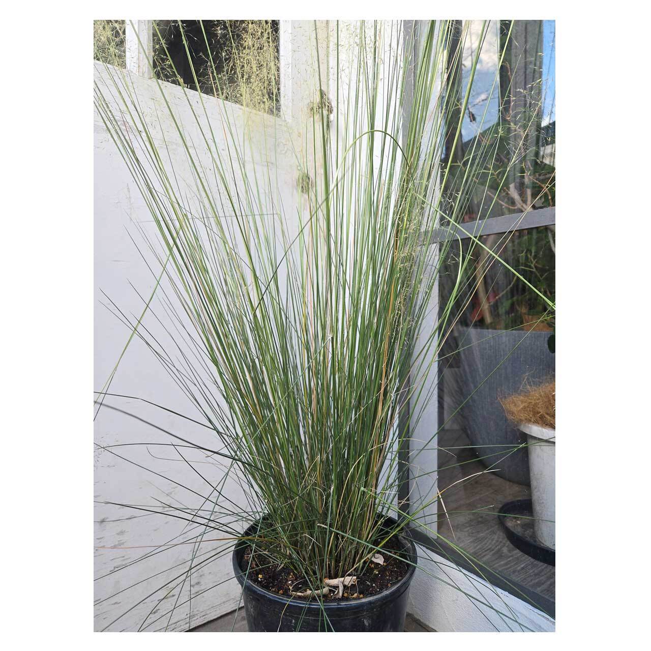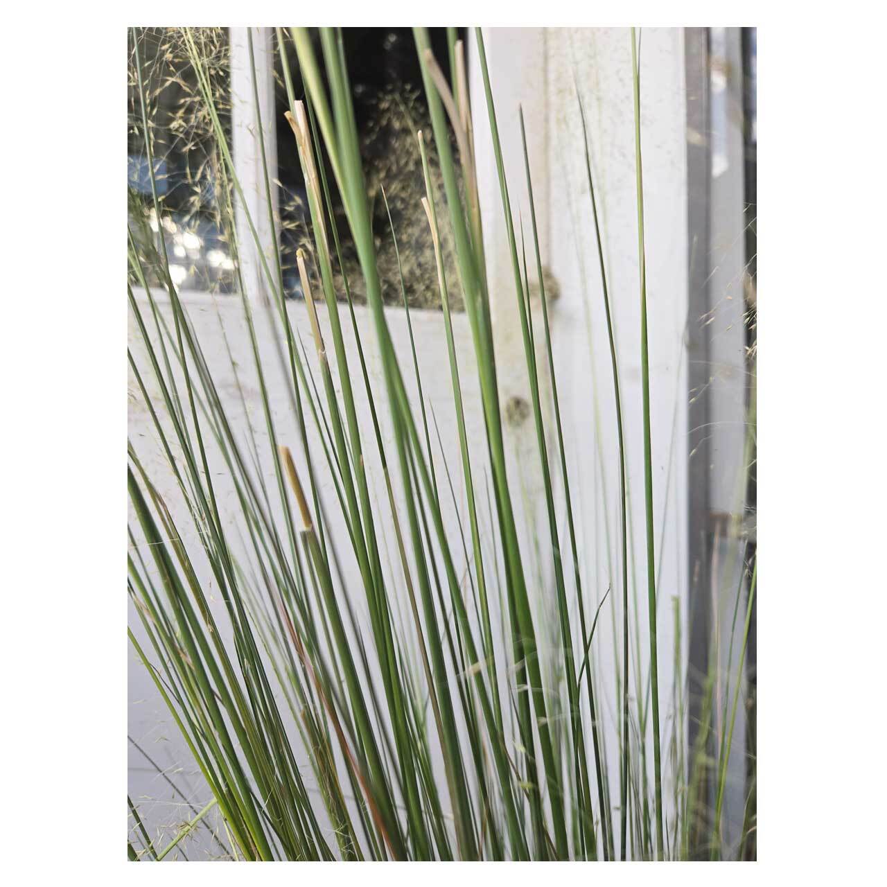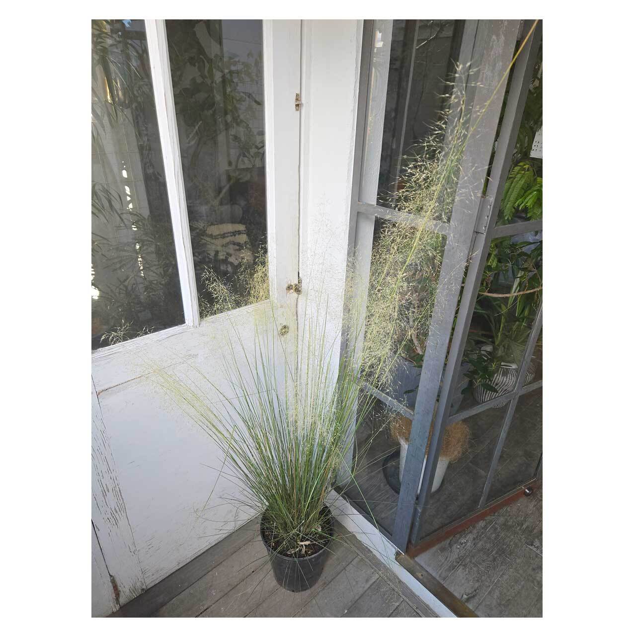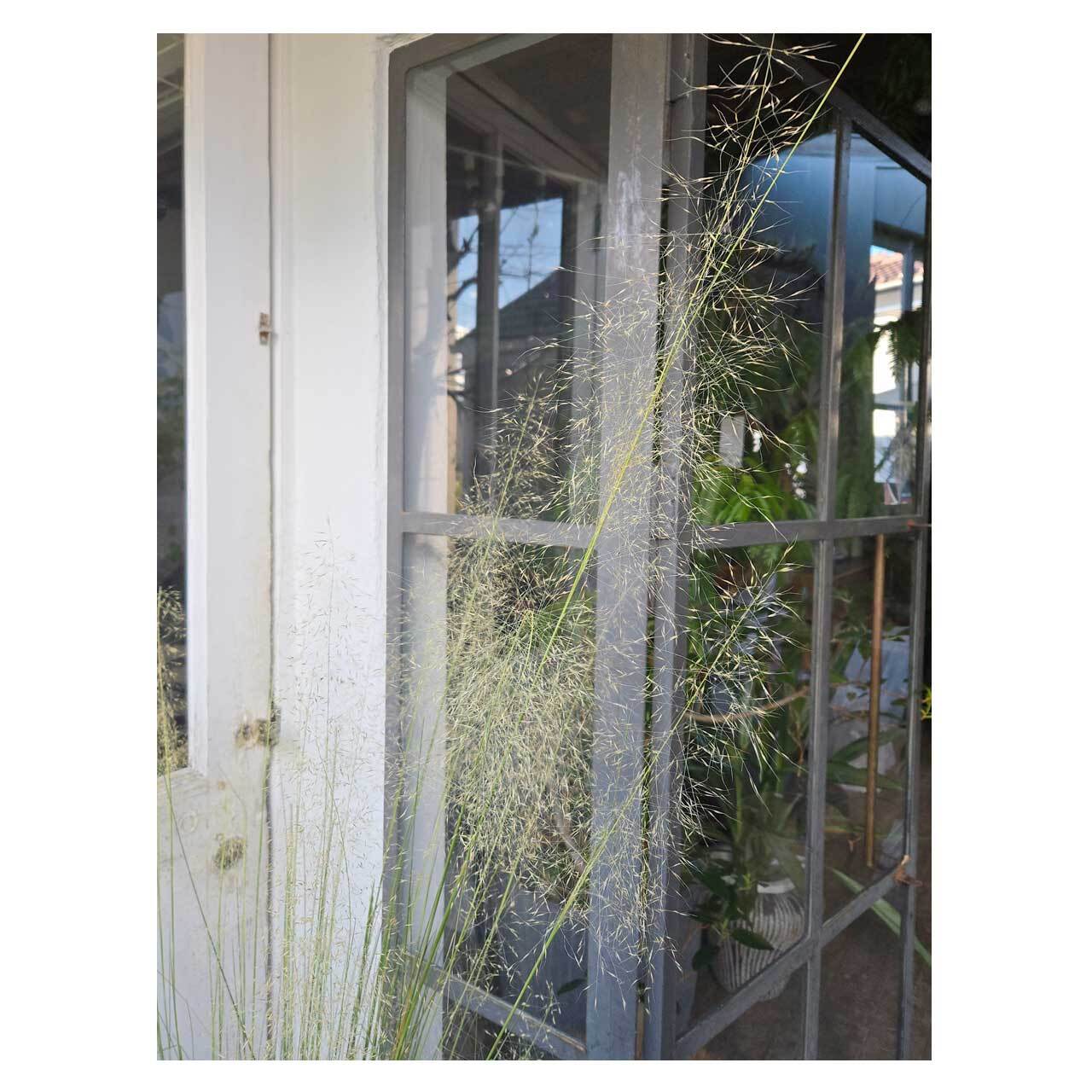 ミューレンベルギアは北アメリカなどが原産のイネ科の宿根草で、ミューリーグラスとも呼ばれます。細く硬めの葉、夏~秋になるスモーク状の花穂が特徴的で、こちらのアルバという品種は、白い花穂のタイプです。