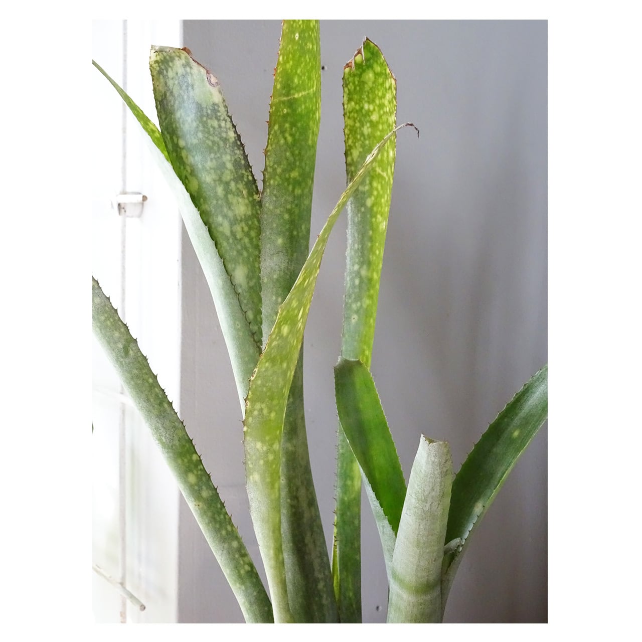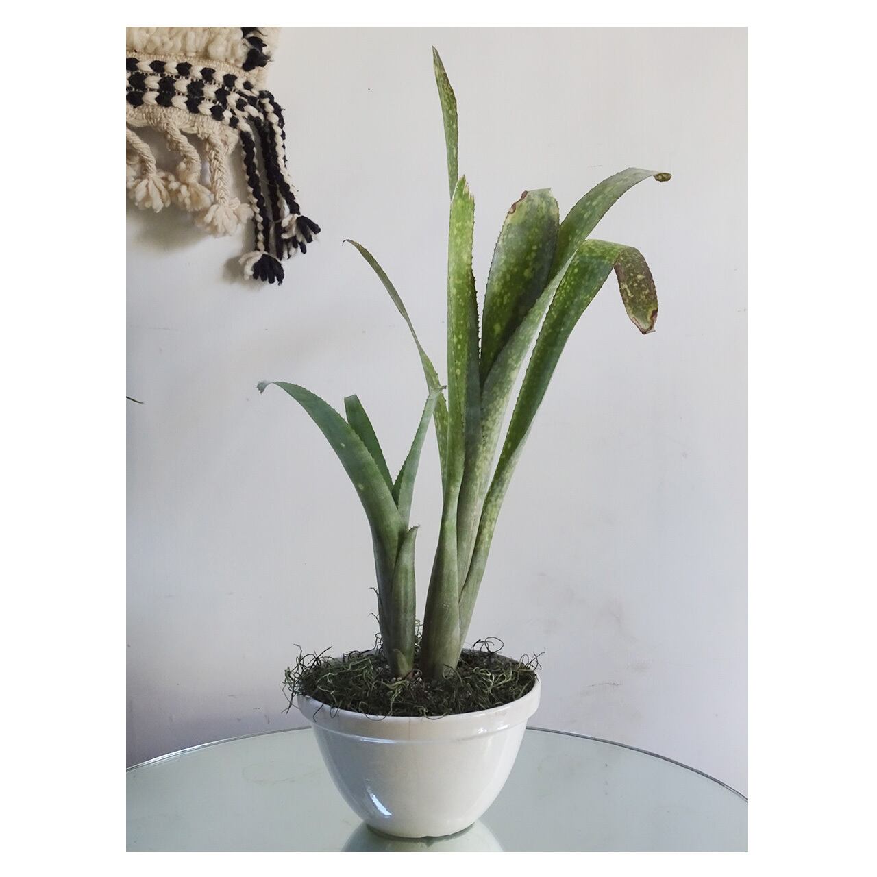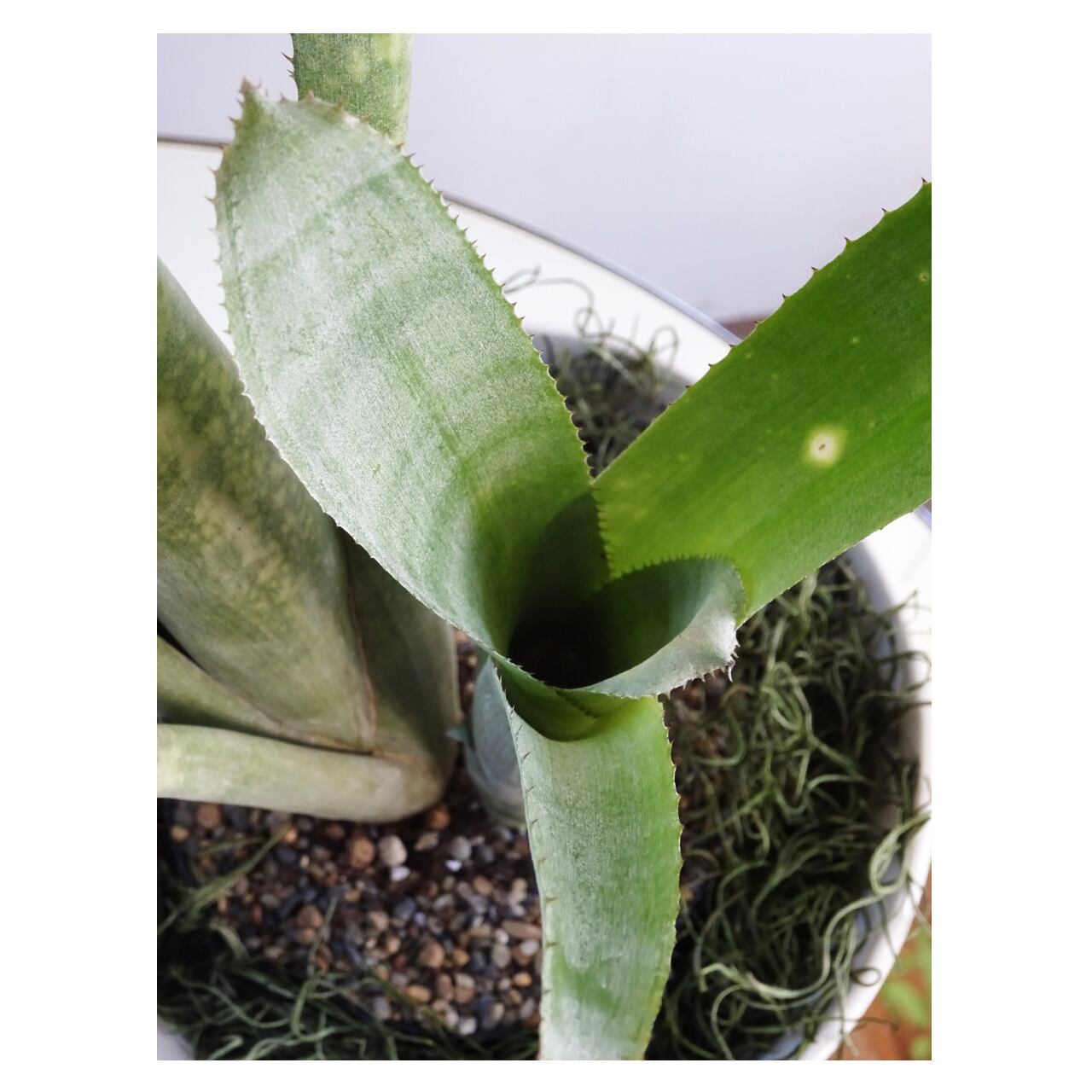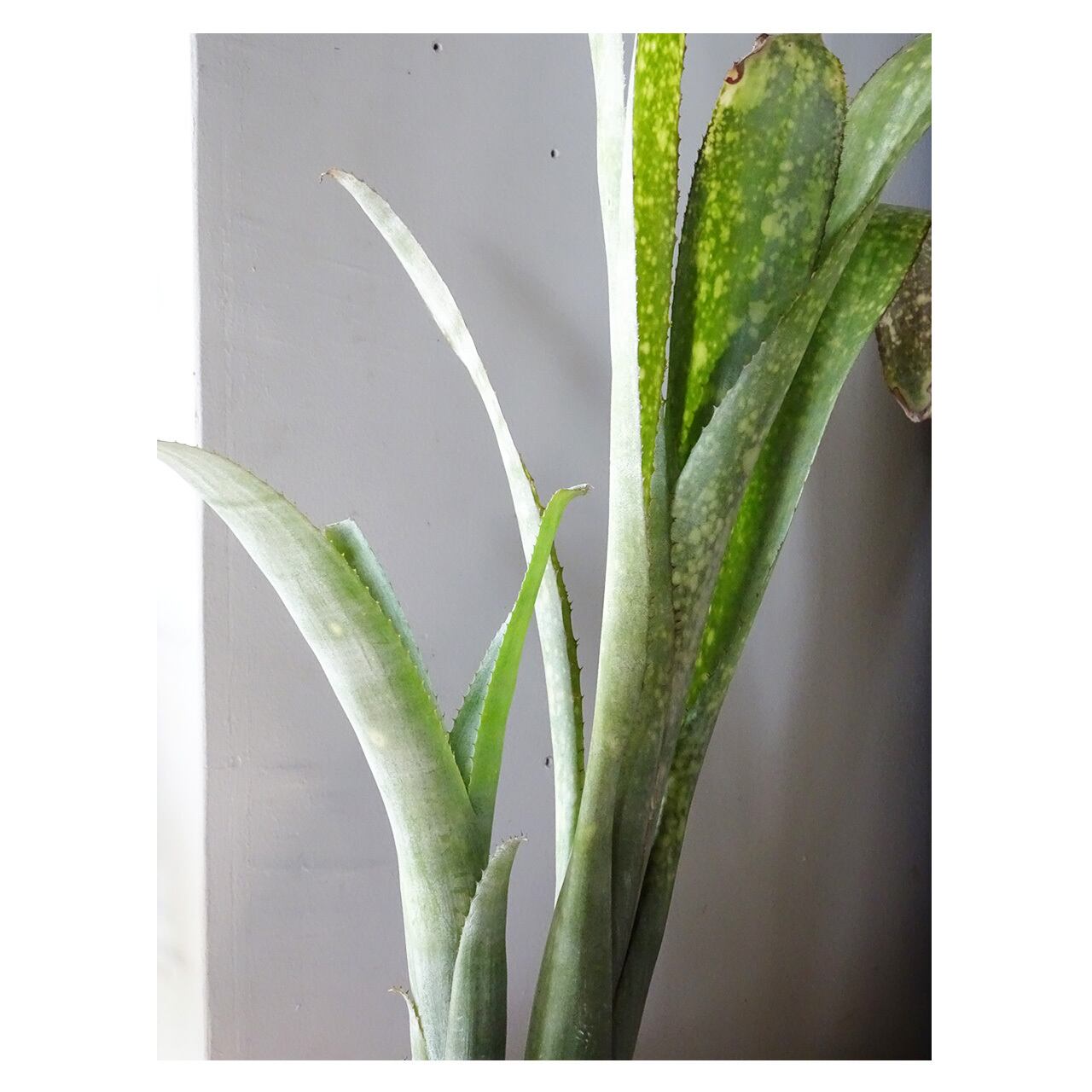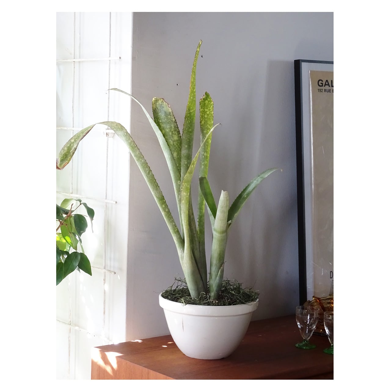 あわせた植物は、「ビルベルギア」。着生ブロメリア科の植物で、筒状の葉の中に水を溜めて育ちます。本種は黄緑色に白斑が入る葉で爽やかにお部屋を彩ってくれるでしょう。