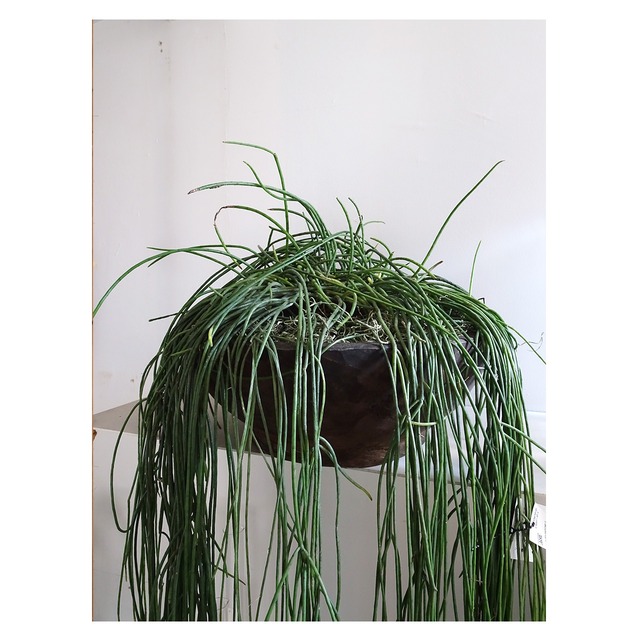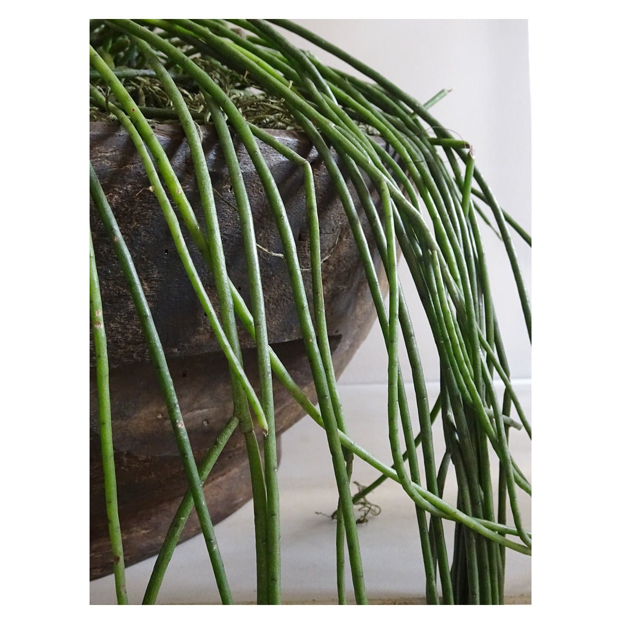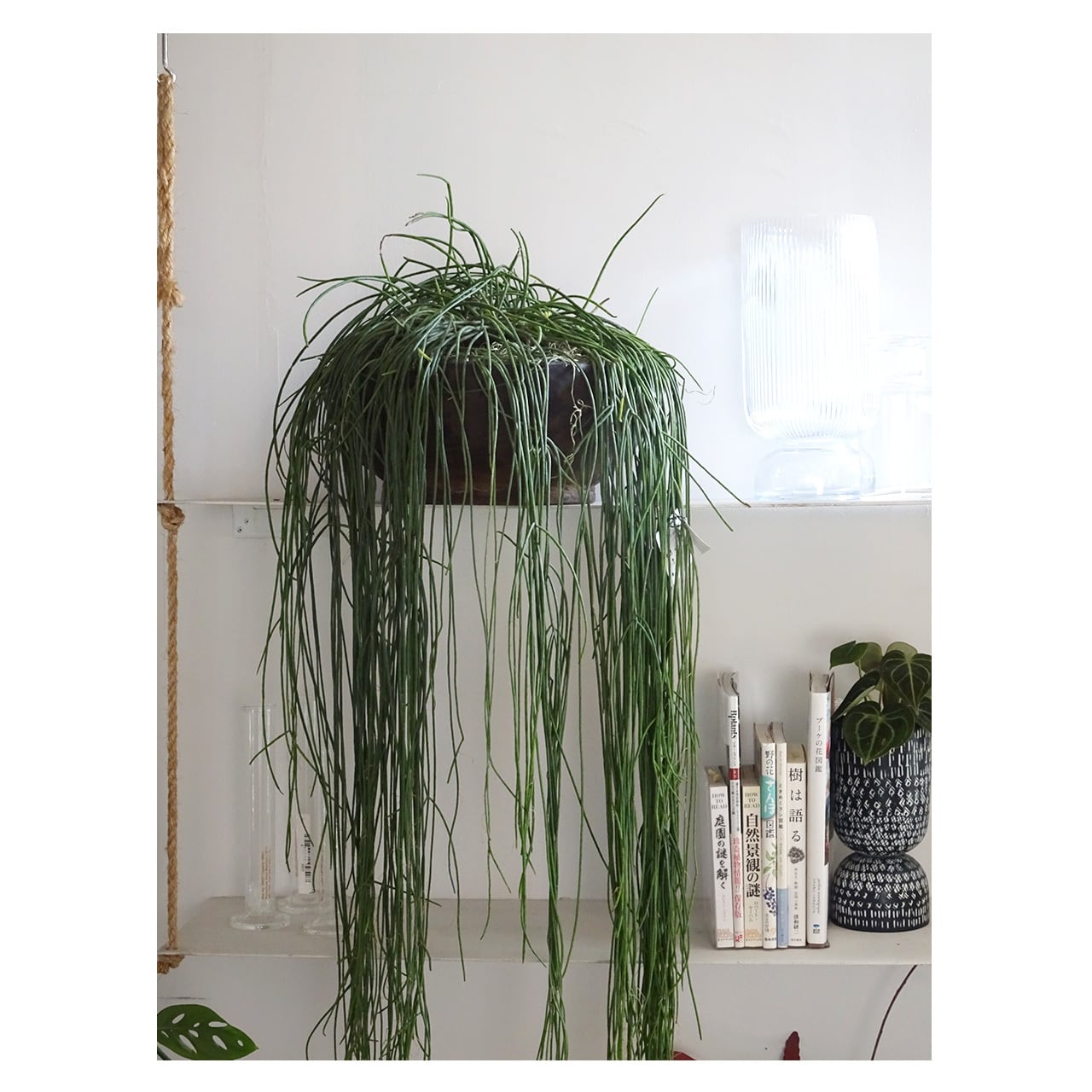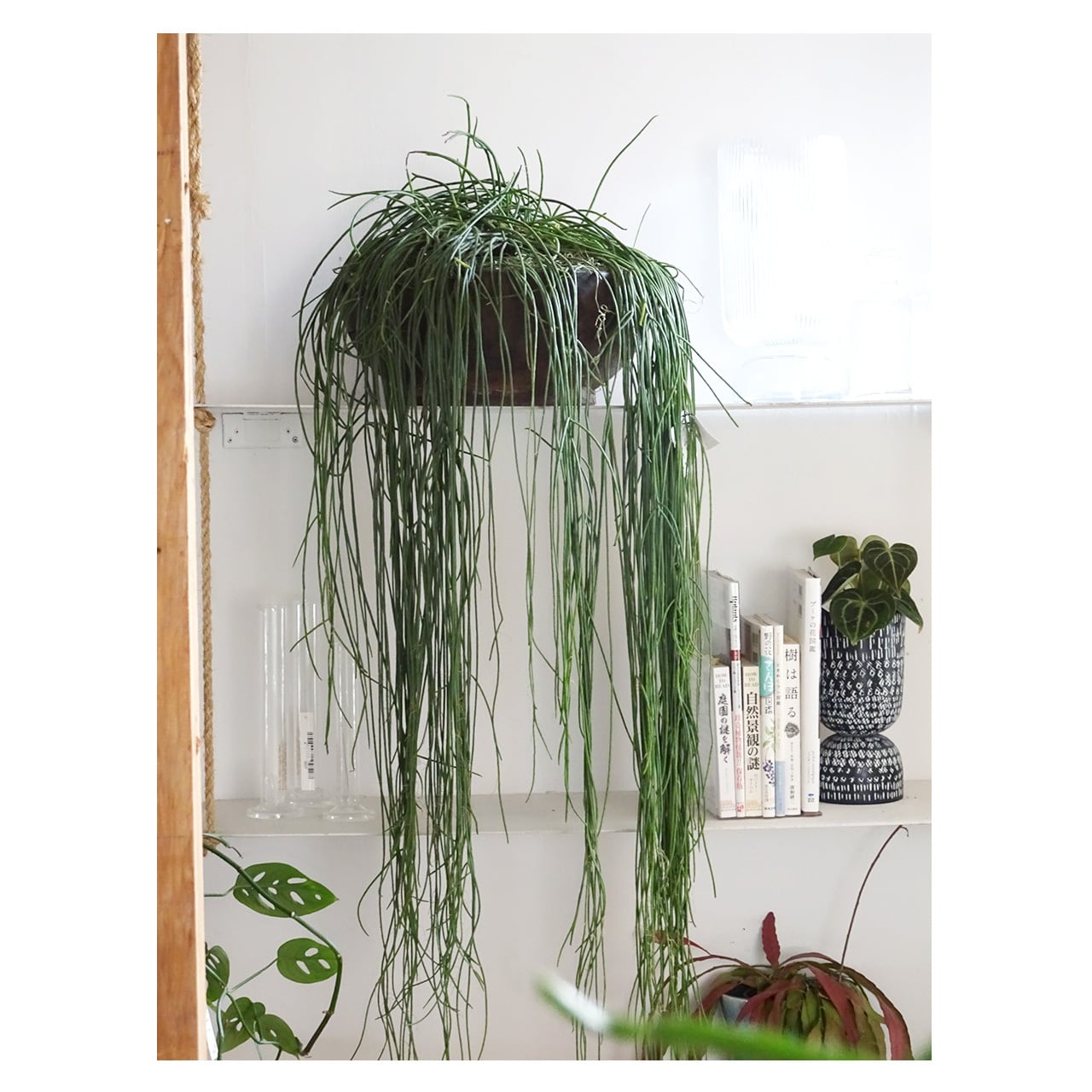 あわせた植物は、リプサリス プニセオディスカス。サボテン科の植物で「森のサボテン」とも呼ばれます。ストレートに伸びる葉姿が美しく長さもあるので、奥行きのある空間作りに一役かってくれそうです。こちらの植物は成長がゆっくりなのでボリューム感のある個体は珍しく、目線の高い位置にグリーンで奥行きを出したい方にもおすすめです。