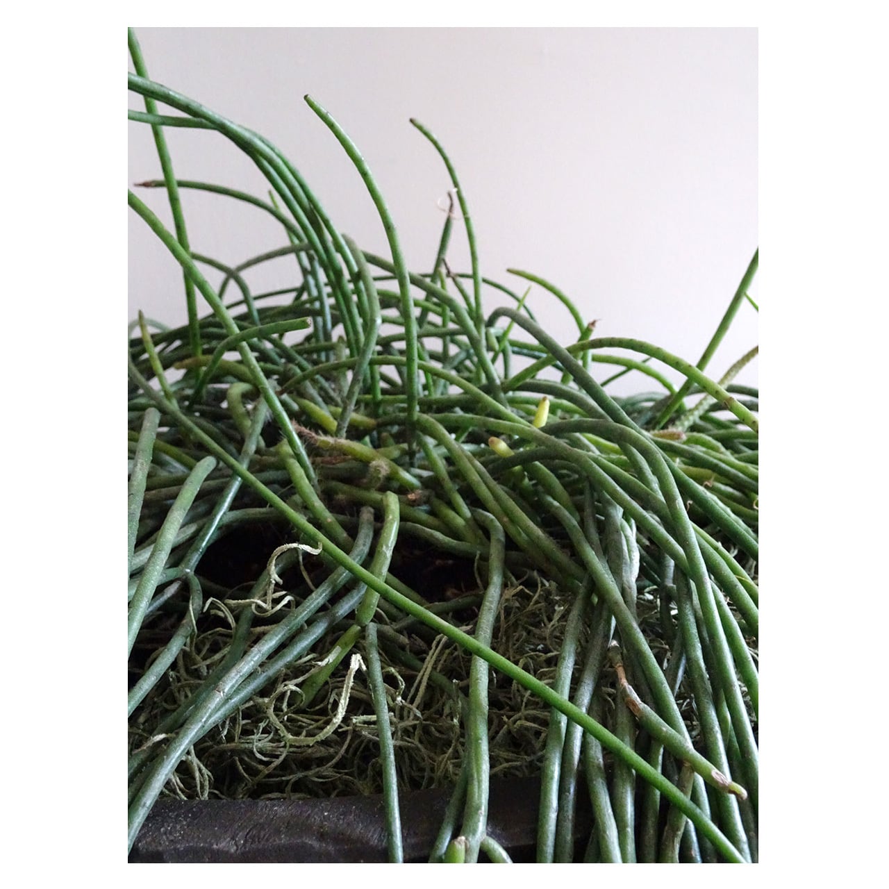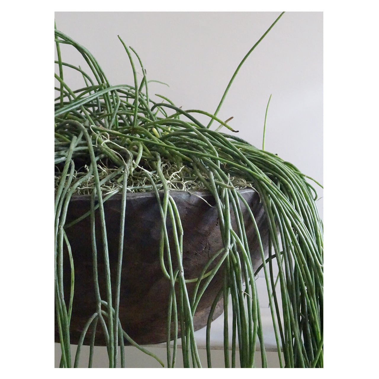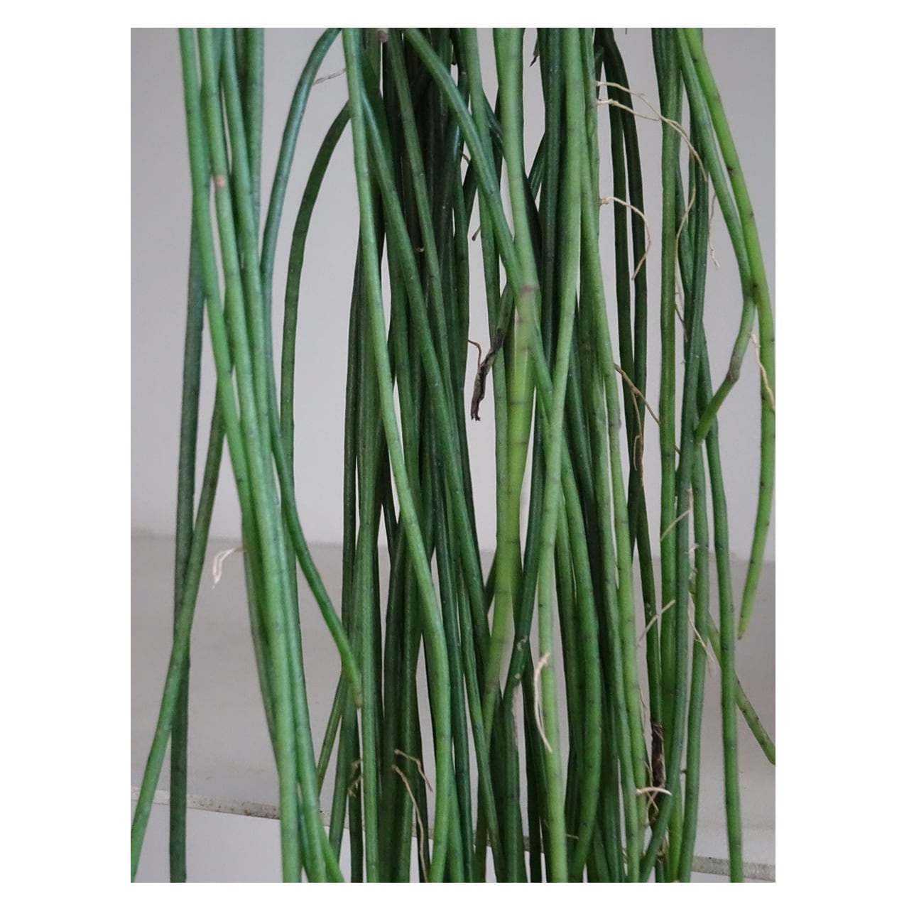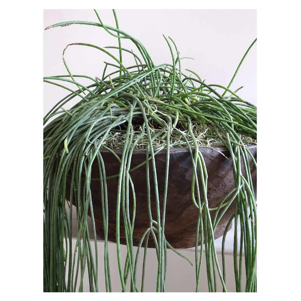 あわせた植物は、リプサリス プニセオディスカス。サボテン科の植物で「森のサボテン」とも呼ばれます。ストレートに伸びる葉姿が美しく長さもあるので、奥行きのある空間作りに一役かってくれそうです。こちらの植物は成長がゆっくりなのでボリューム感のある個体は珍しく、目線の高い位置にグリーンで奥行きを出したい方にもおすすめです。