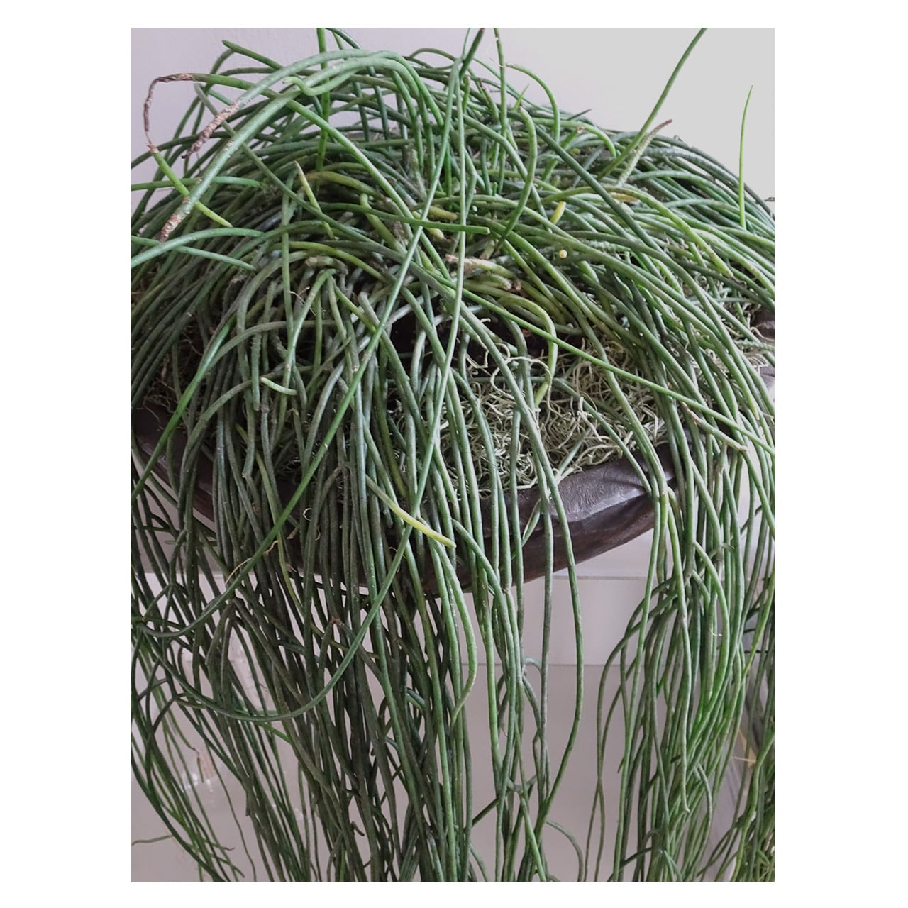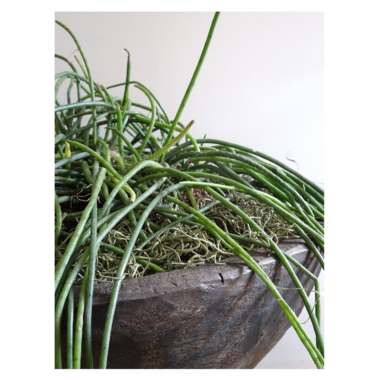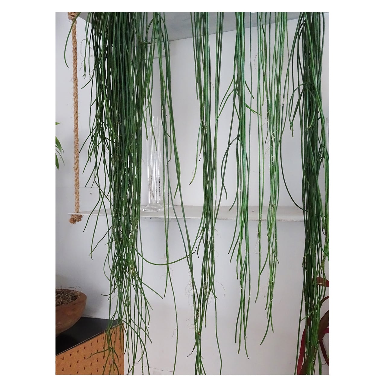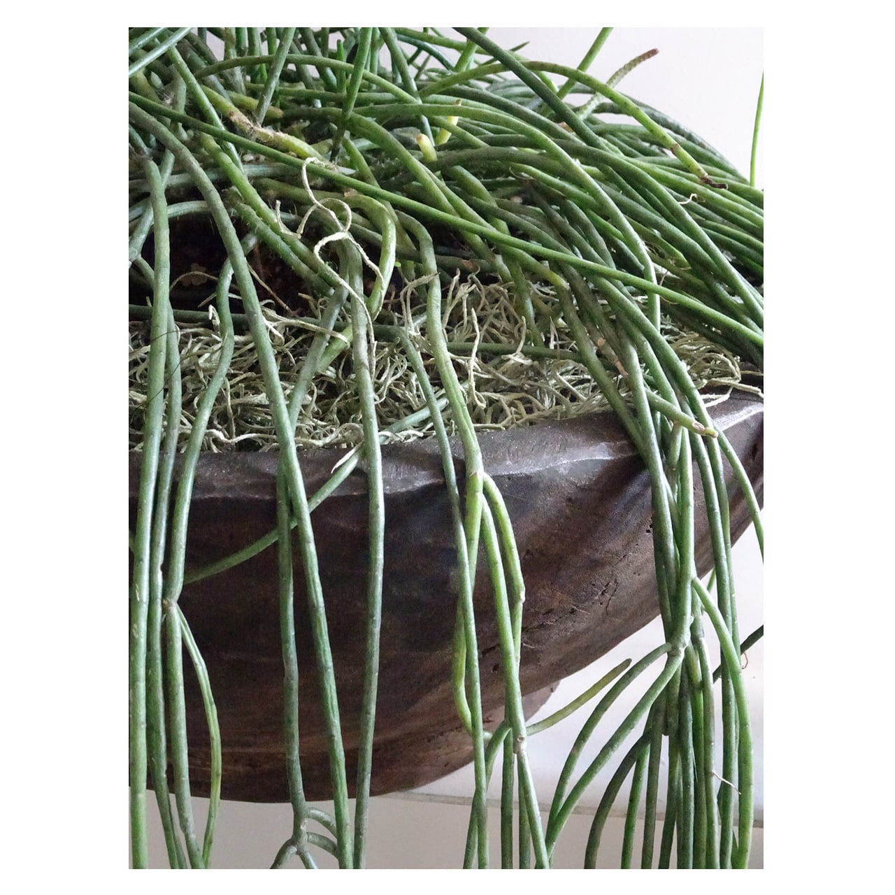 あわせた植物は、リプサリス プニセオディスカス。サボテン科の植物で「森のサボテン」とも呼ばれます。ストレートに伸びる葉姿が美しく長さもあるので、奥行きのある空間作りに一役かってくれそうです。こちらの植物は成長がゆっくりなのでボリューム感のある個体は珍しく、目線の高い位置にグリーンで奥行きを出したい方にもおすすめです。