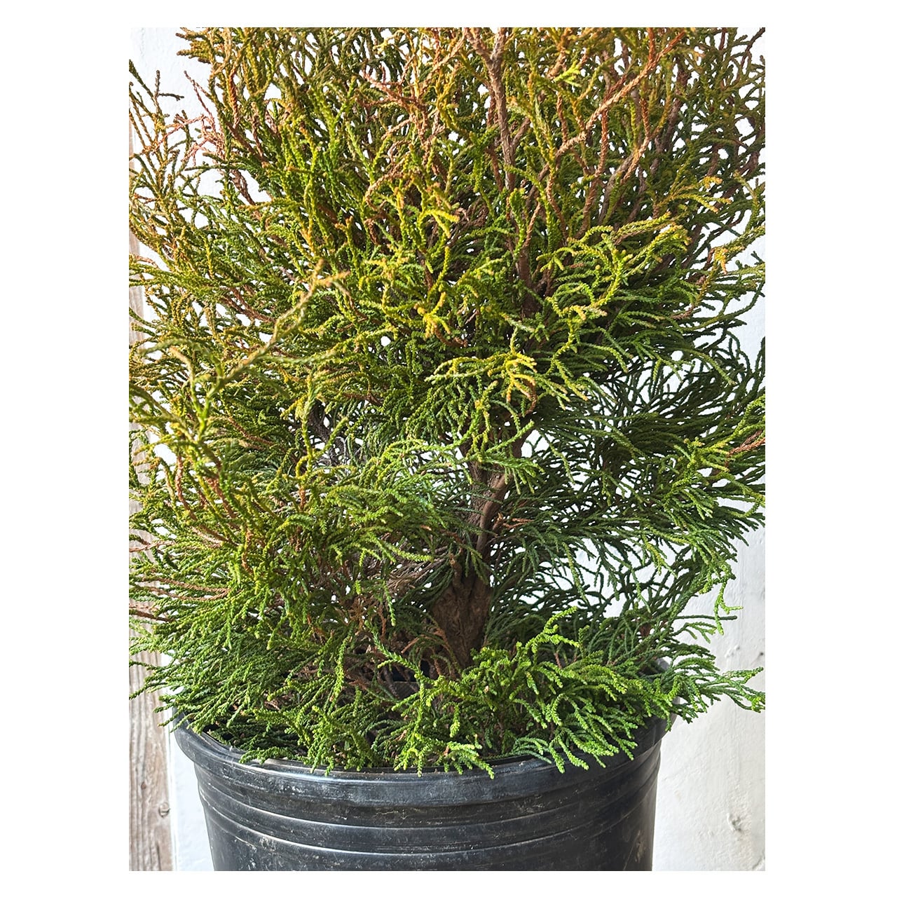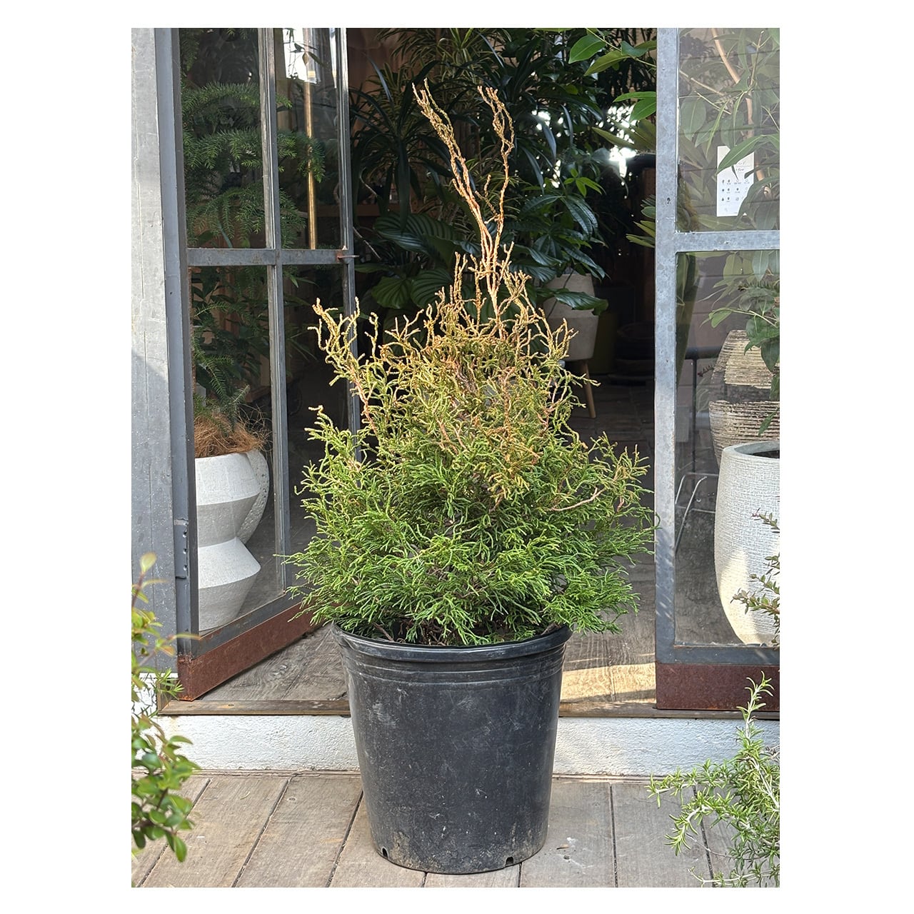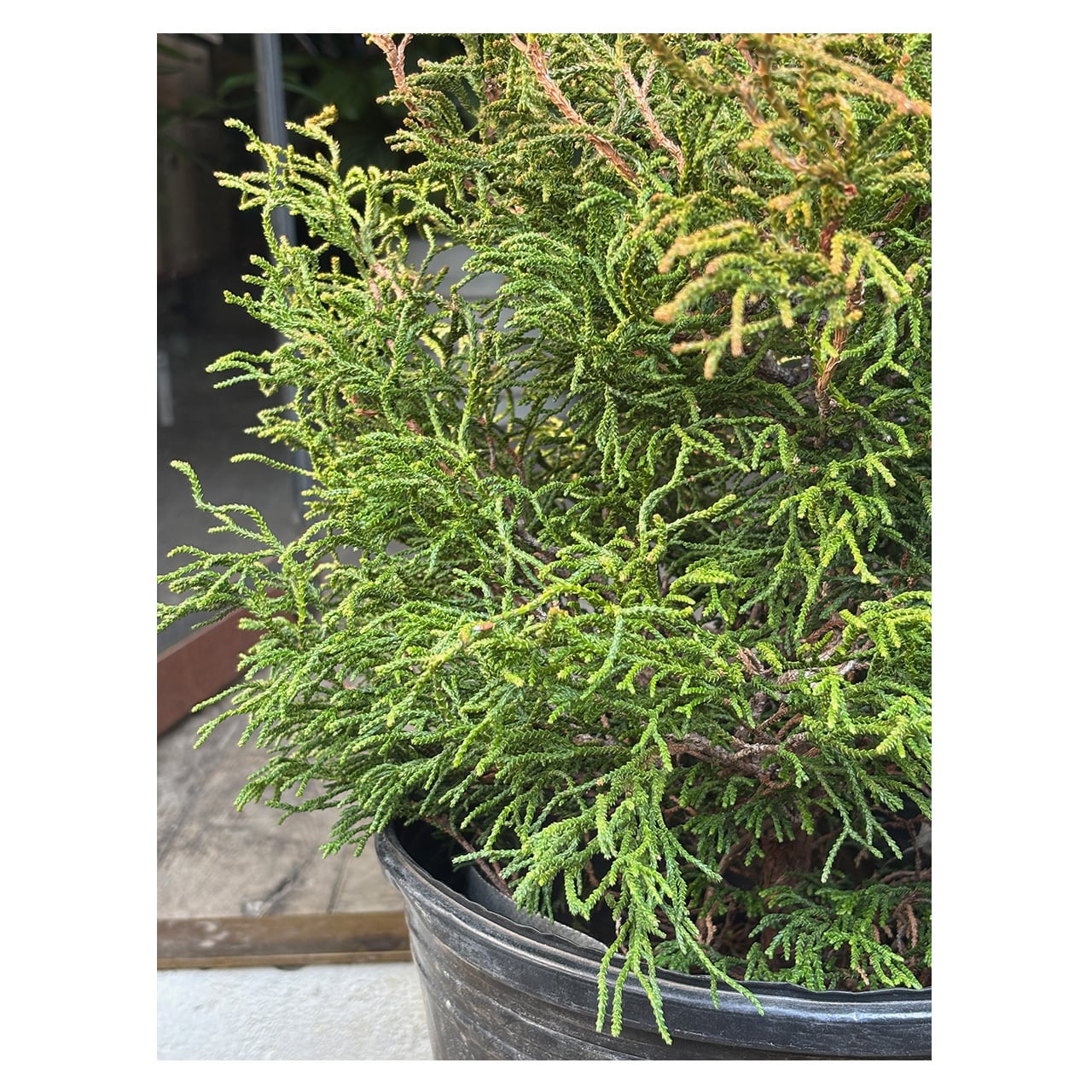 ヒノキ コラリフォルミスはヒノキ科ヒノキ属の常緑低木で、日本原産のヒノキの仲間。オレンジ〜緑色のねじれた紐状の枝葉が珊瑚礁のようにみられることから「サンゴヒバ」とも呼ばれています。独特な質感の葉は、新芽がオレンジ色で徐々に濃い緑色へとなっていきます。樹形は広円錐形となる品種で高さ1,5〜2m程度になりますが、なかなか主幹が立ちにくいため、芯が立つまでは短い枝が楕円状に生育します。