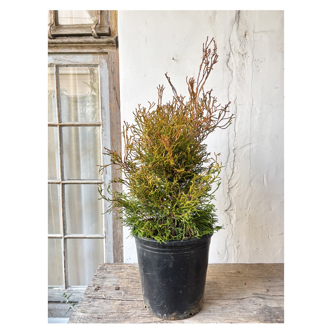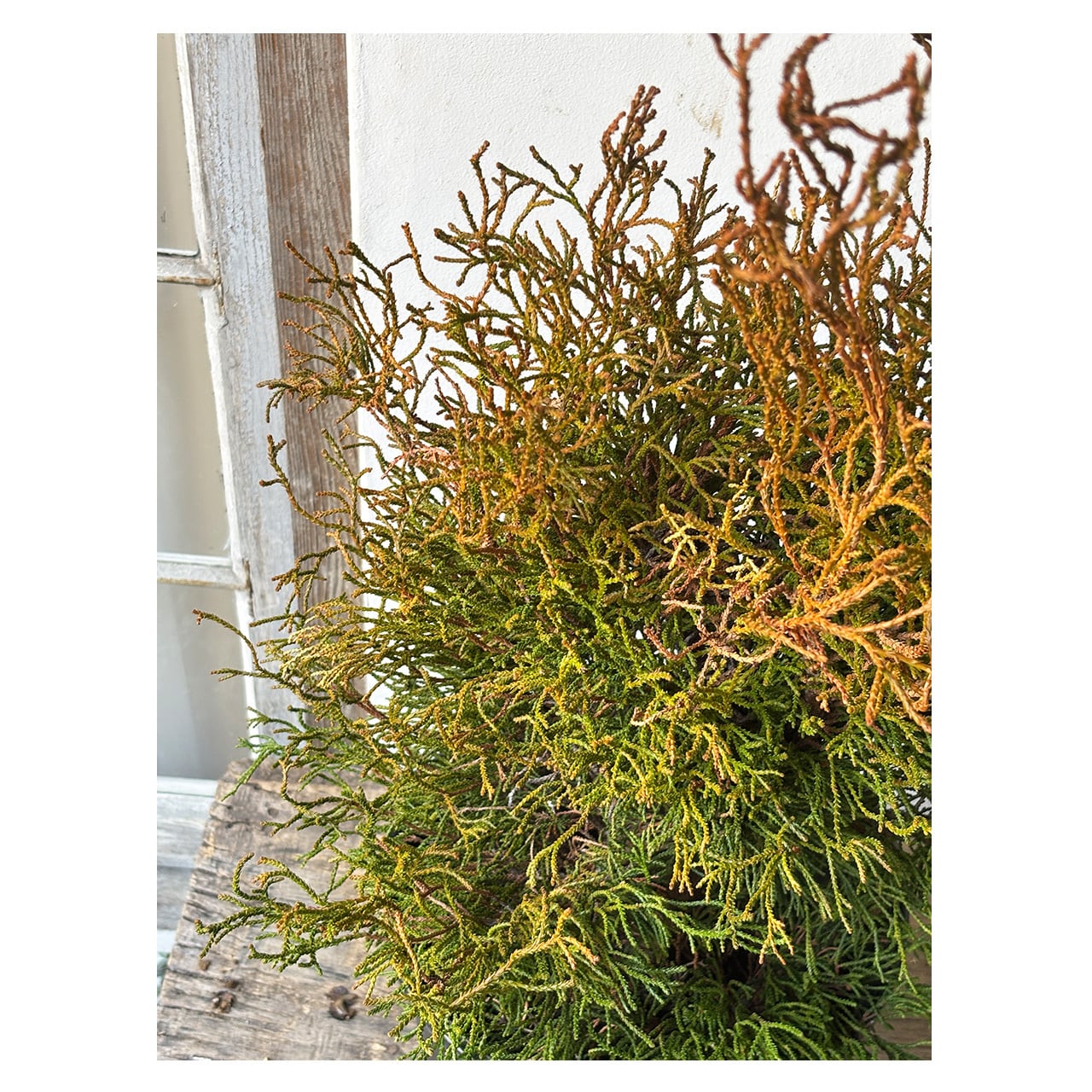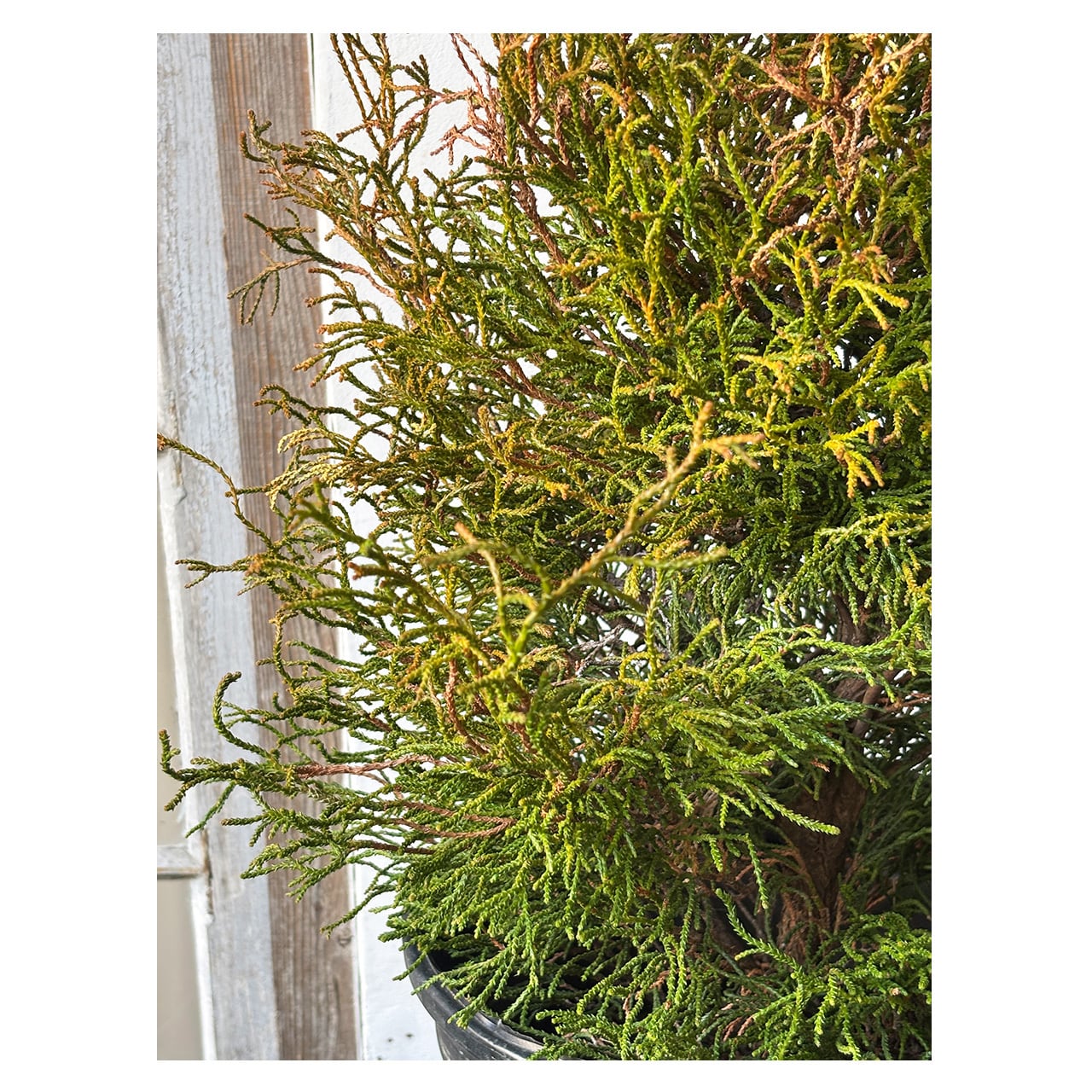 ヒノキ コラリフォルミスはヒノキ科ヒノキ属の常緑低木で、日本原産のヒノキの仲間。オレンジ〜緑色のねじれた紐状の枝葉が珊瑚礁のようにみられることから「サンゴヒバ」とも呼ばれています。独特な質感の葉は、新芽がオレンジ色で徐々に濃い緑色へとなっていきます。樹形は広円錐形となる品種で高さ1,5〜2m程度になりますが、なかなか主幹が立ちにくいため、芯が立つまでは短い枝が楕円状に生育します。