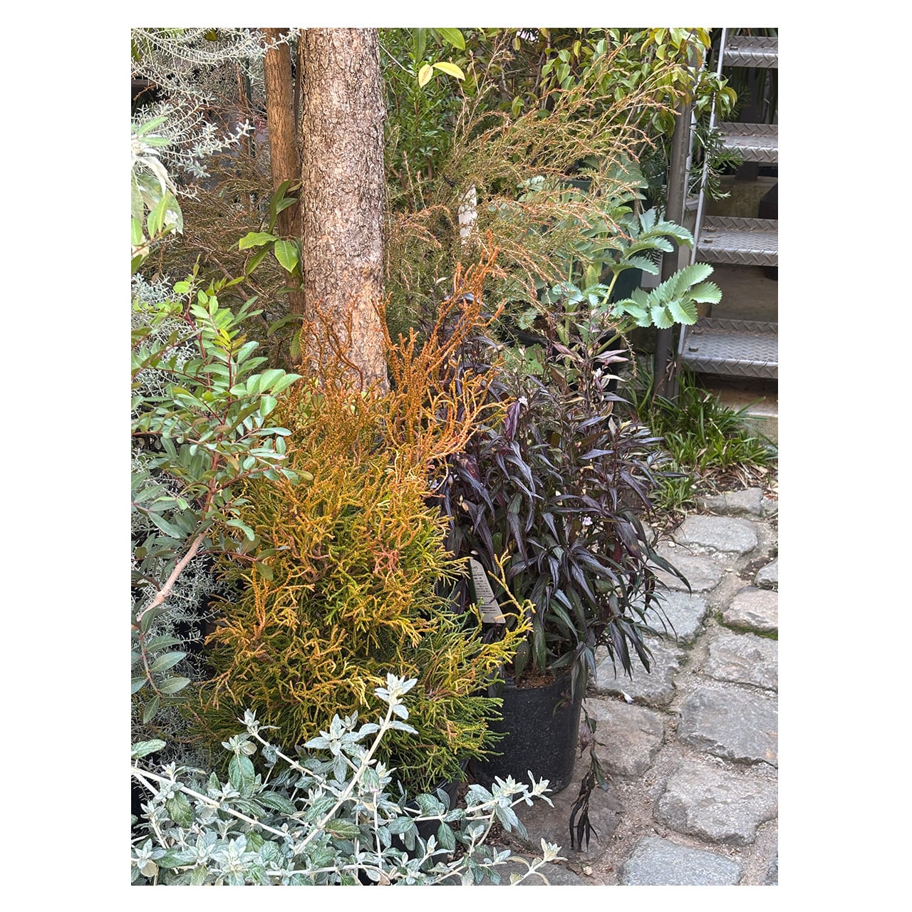 オレンジから緑色にねじれた葉が珊瑚礁のように美しい、ヒノキ コラリフォルミス。