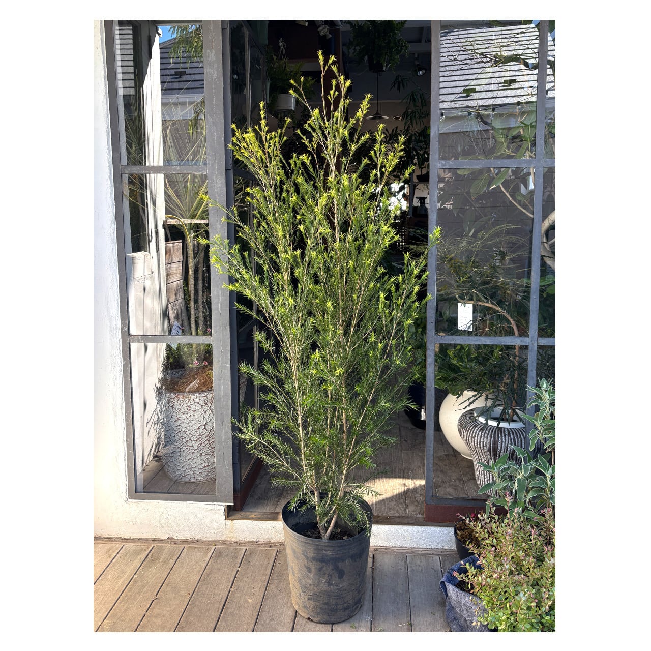 140種ほどのうち、1種を除いて全てオーストラリア原産の常緑高木メラレウカ。ティーツリーとも呼ばれ、こちらのアロマティーツリーは、ティーツリーの中でもやや甘い香りがするタイプ。葉をこすったりすると爽やかな良い香りがし、初夏にはふわふわした羽毛状の白花を咲かせます。