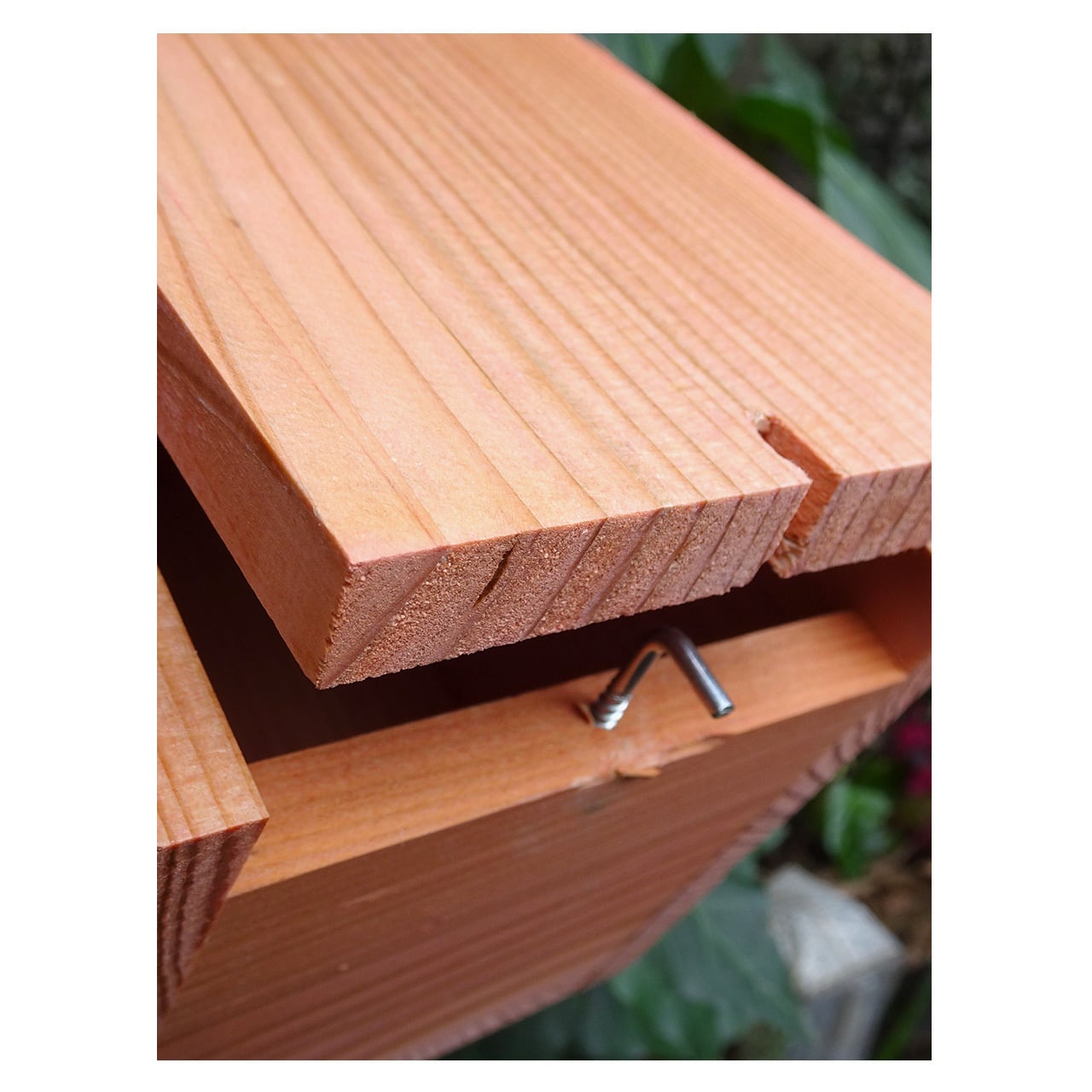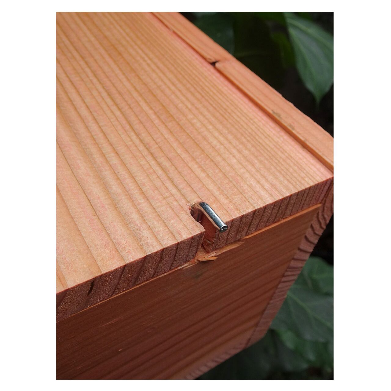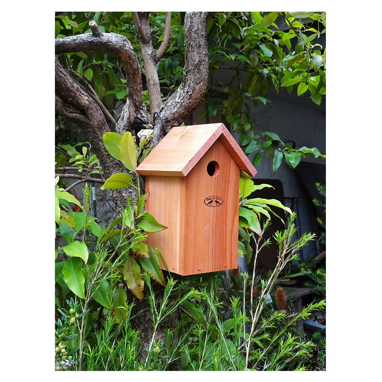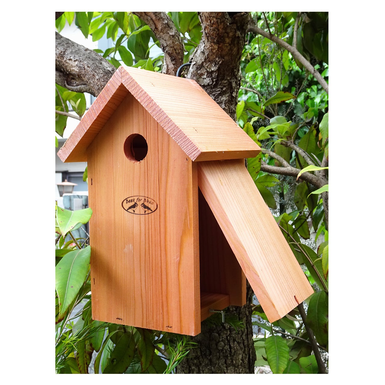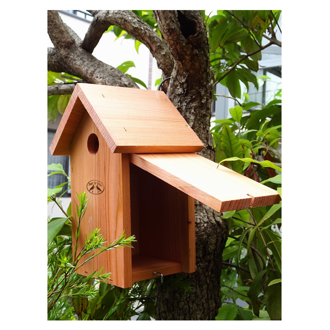 シジュウカラの習性のあわせてつくれらたこちらのバードハウスは、シジュウカラの他にもハシブトガラ、コガラなどの小鳥にも適した設計。横の壁部分は開閉可能のため巣箱の中のお掃除もしやすくなっており、背面には吊るしやすいようにフック受けが施されています。