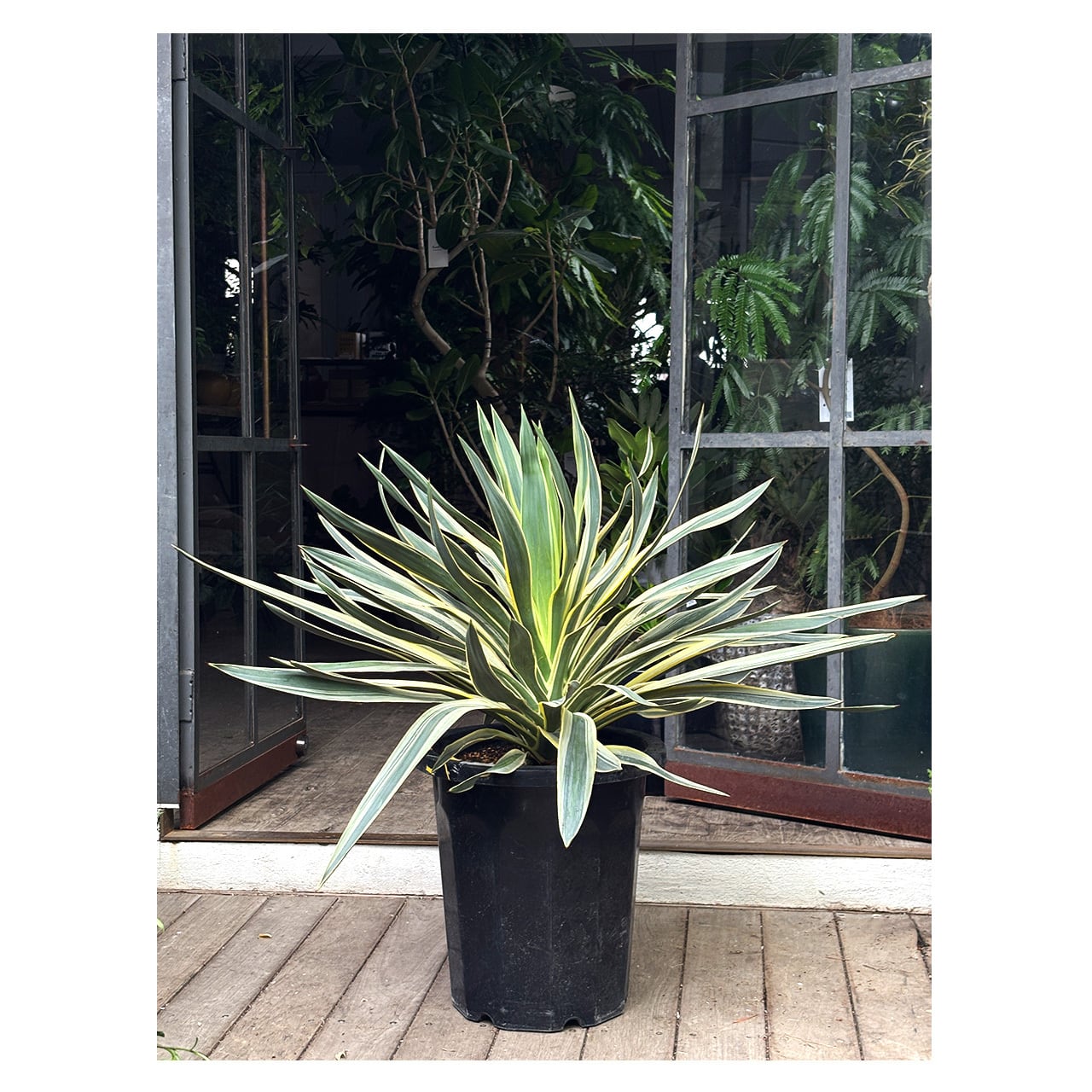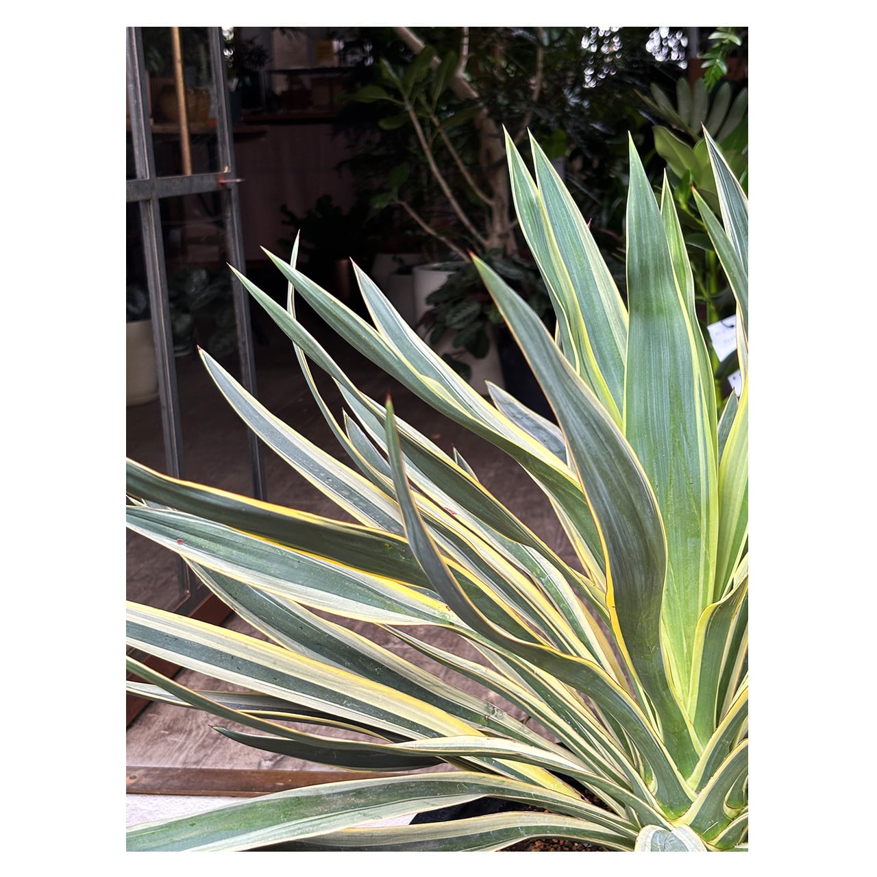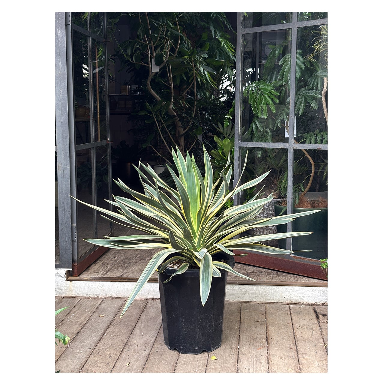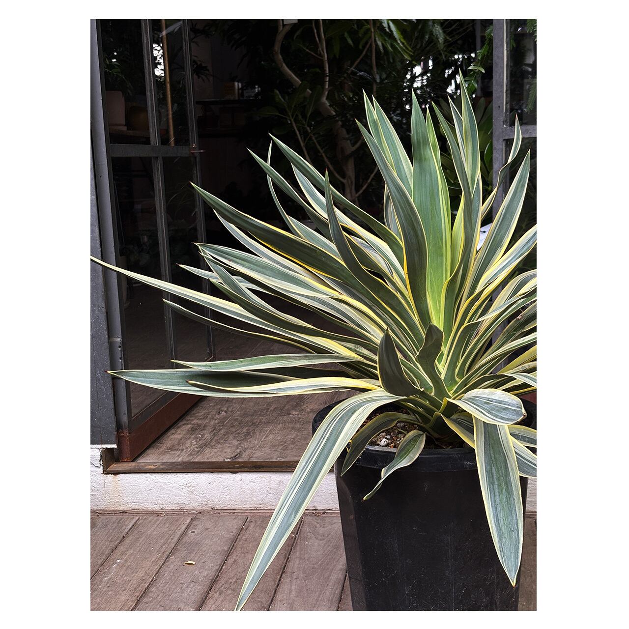 まっすぐに伸びる大きな葉に白い斑が入る、ユッカ グロリオサ バリエガタ。