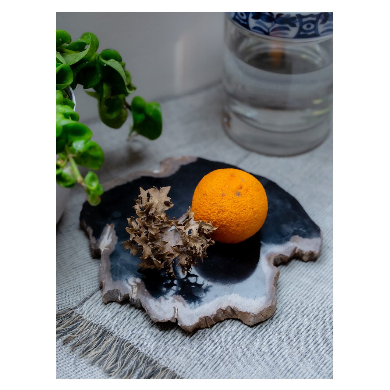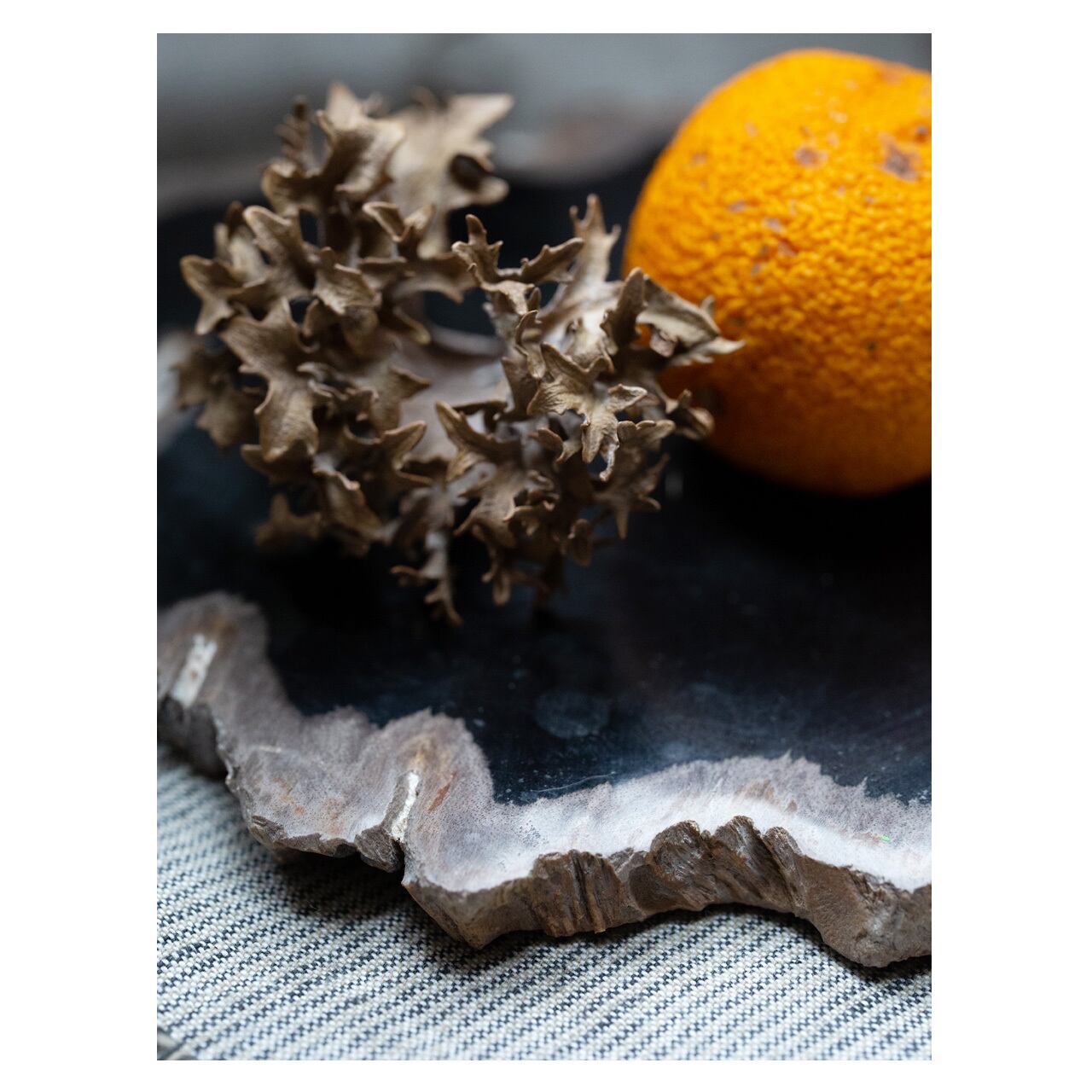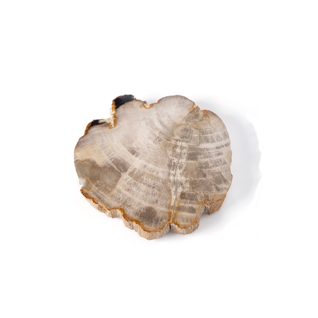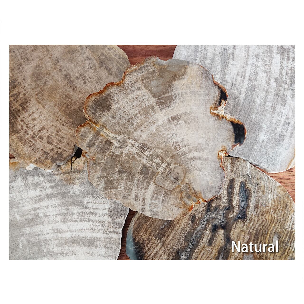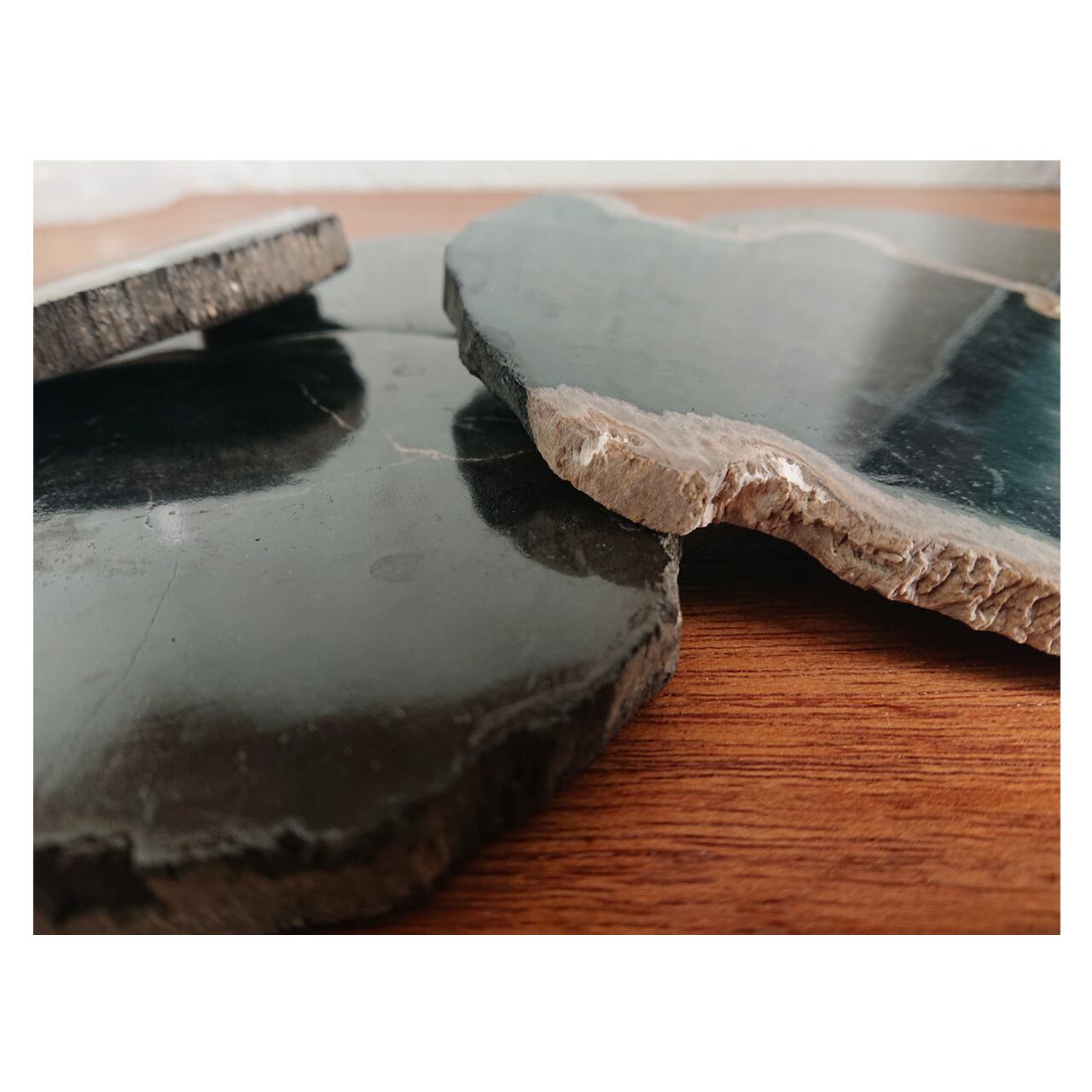 珪花木とは植物の化石のひとつで、古代の樹木が土砂等で地中層に埋もれ、膨大な年月をかけ地層からかかる圧力によって化石化したものです。地層とか化石とか聞くと、なんだかちょっと、ロマンがありますよね。天然の素材を使用しているため、色味や形状などひとつとして同じものが無いところも魅力です。何枚か揃えておくと、1つ1つの違いが見て取れておもしろいと思います。