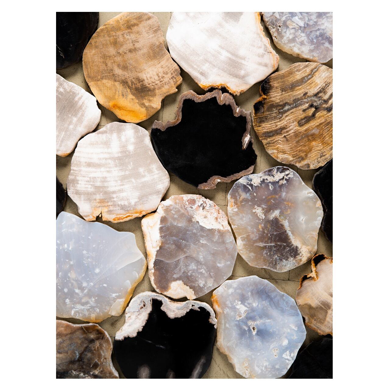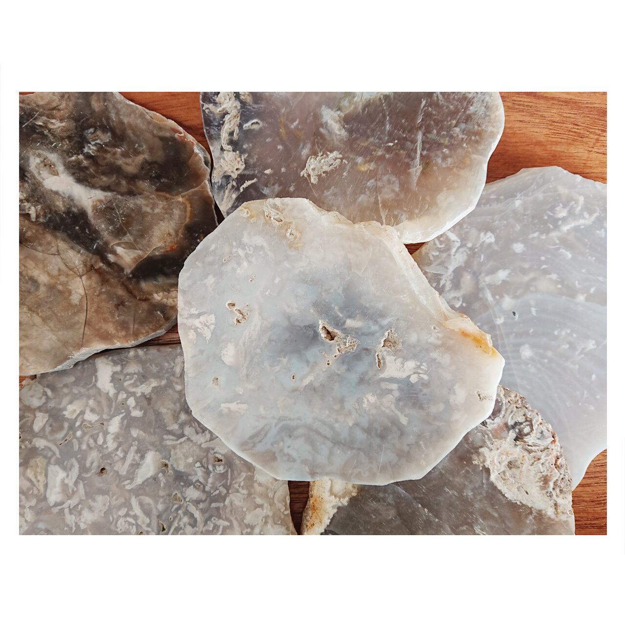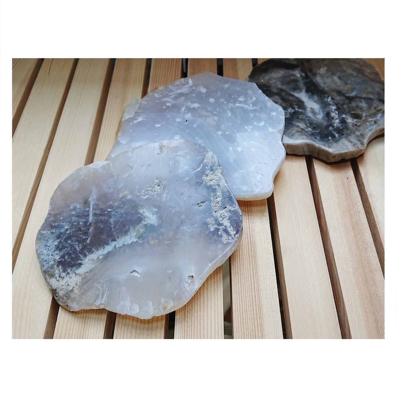 天然の素材を使用しているため、色味や形状などひとつとして同じものが無いところも魅力です。結晶や縞模様、色や形も様々なタイプがあるので、何枚か揃えておくと1つ1つの違いが見て取れておもしろいと思います。