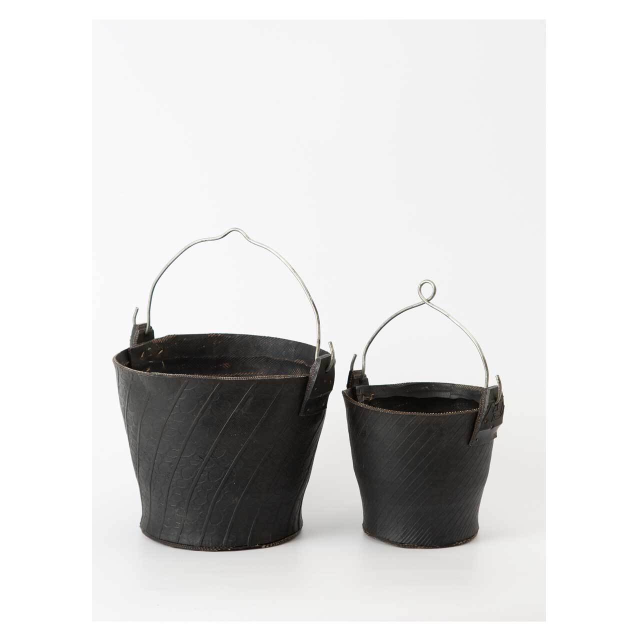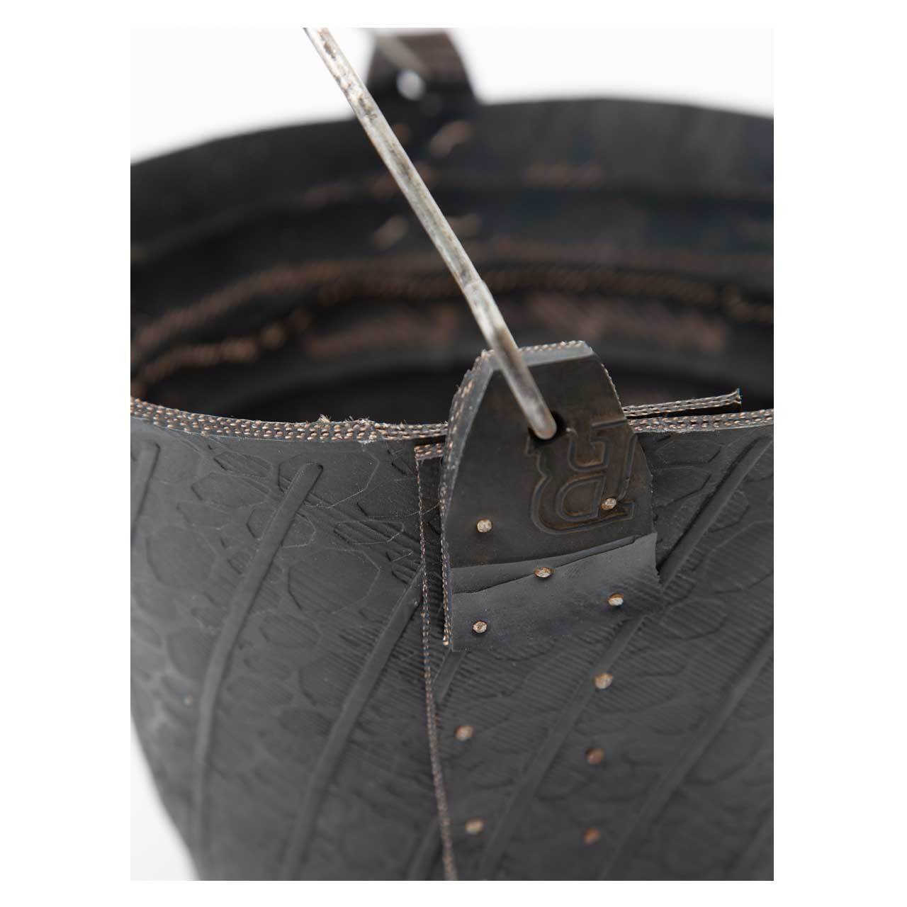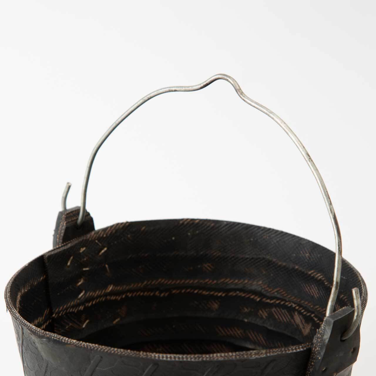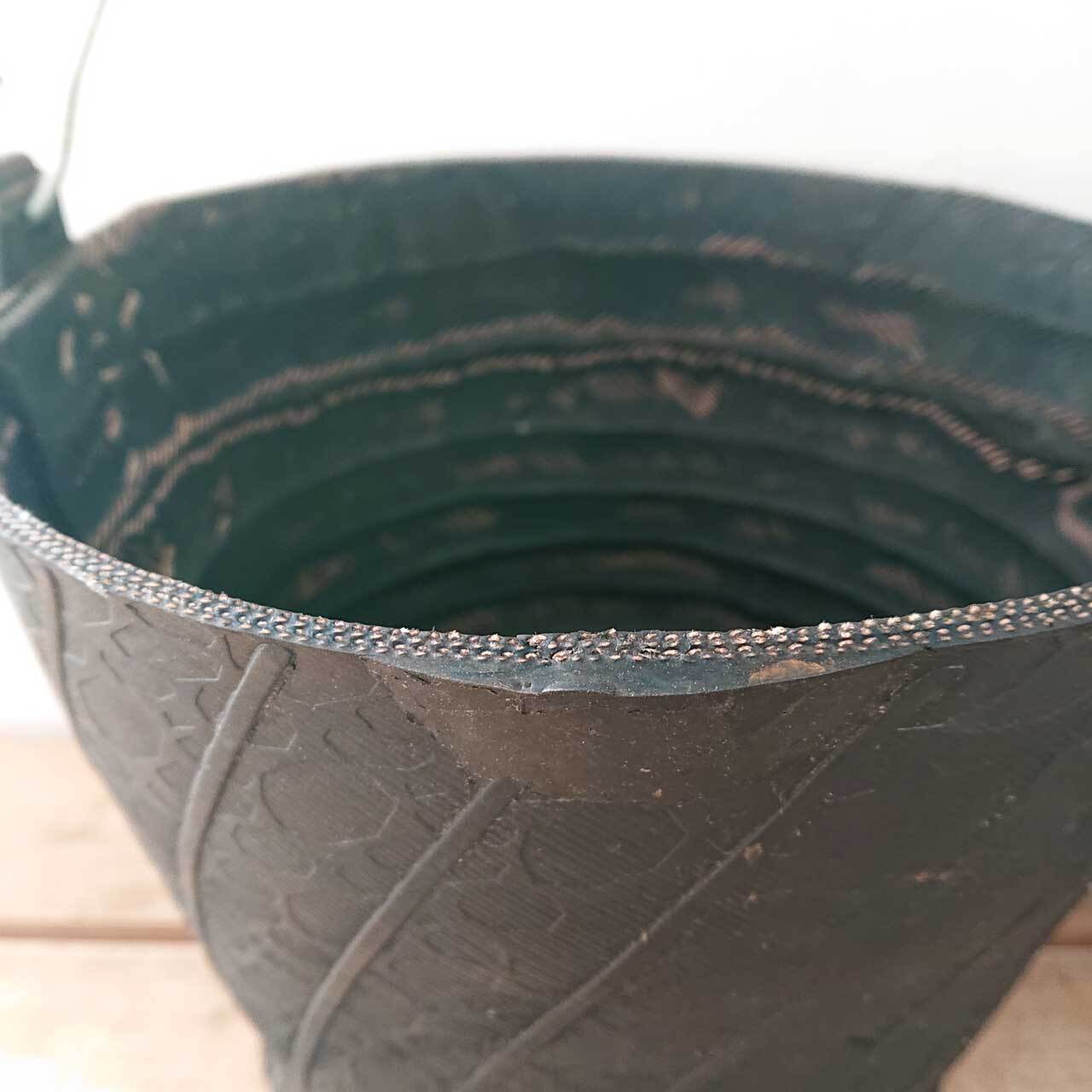 使い古されたタイヤを再利用して作られているバケツです。そのため1つ1つ柄や形がマチマチで、傷やシール跡のような部分があったり、内側の底にはタイヤのブランドロゴのような部分が残っていたりと、とても個性的で唯一無二感があります。