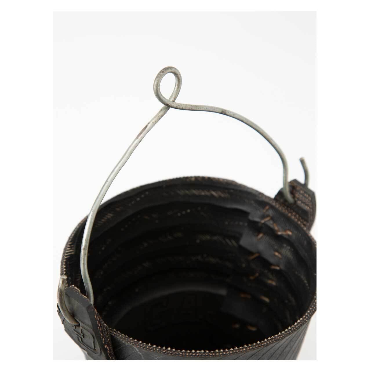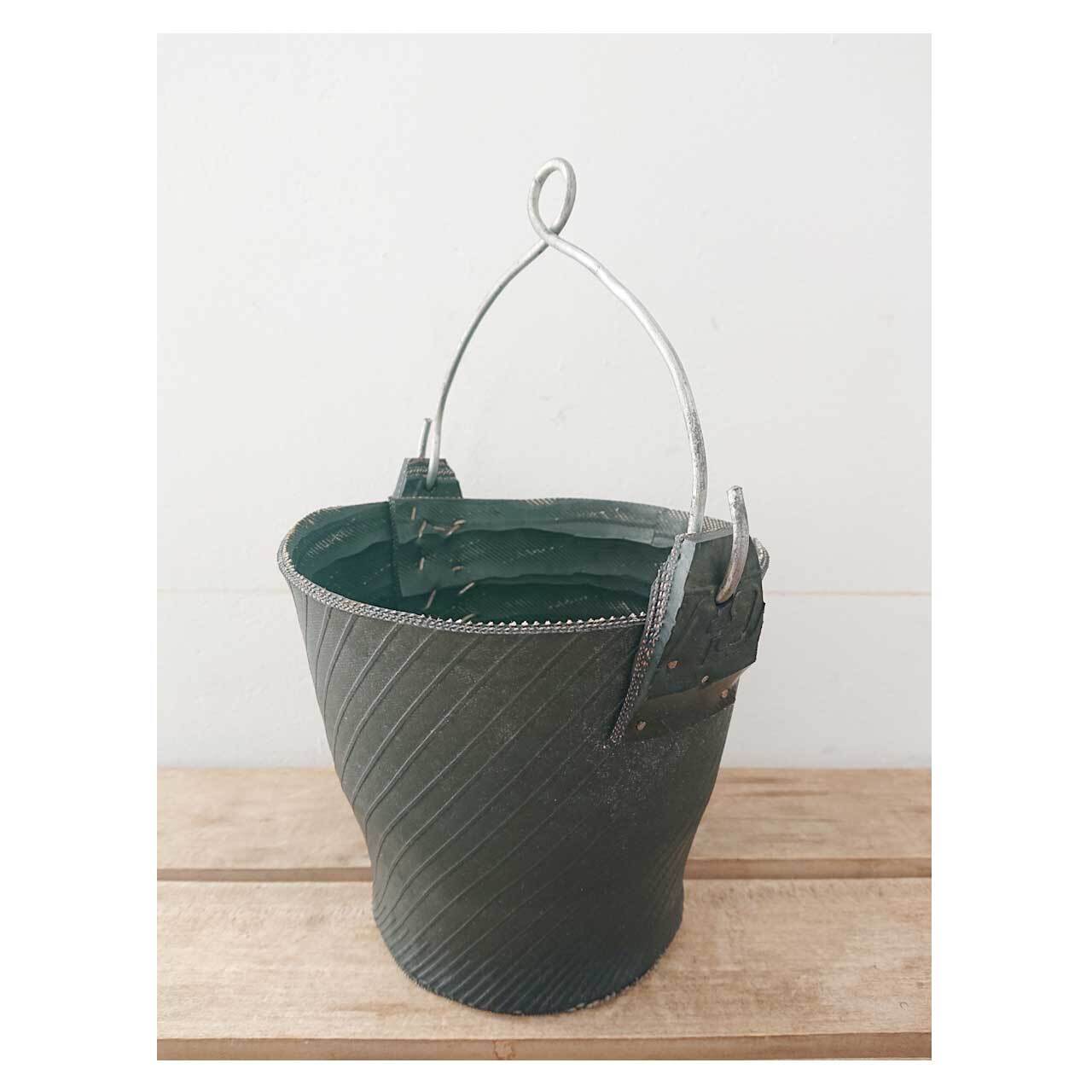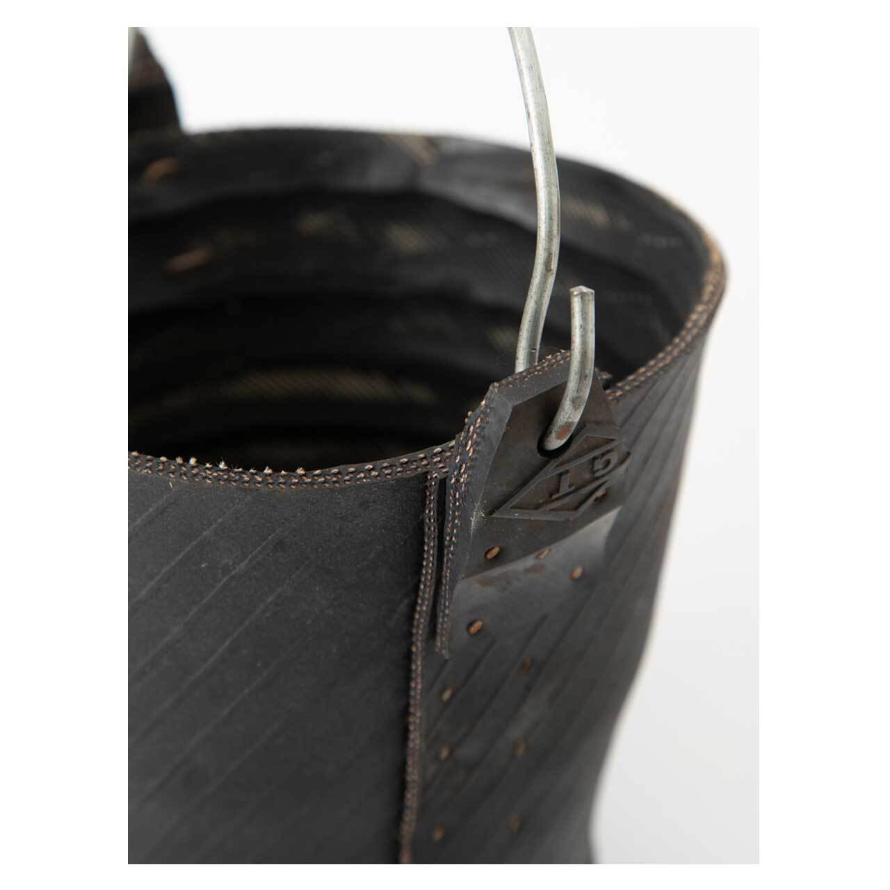 使い古されたタイヤを再利用して作られているバケツです。そのため1つ1つ柄や形がマチマチで、傷やシール跡のような部分があったり、内側の底にはタイヤのブランドロゴのような部分が残っていたりと、とても個性的で唯一無二感があります。