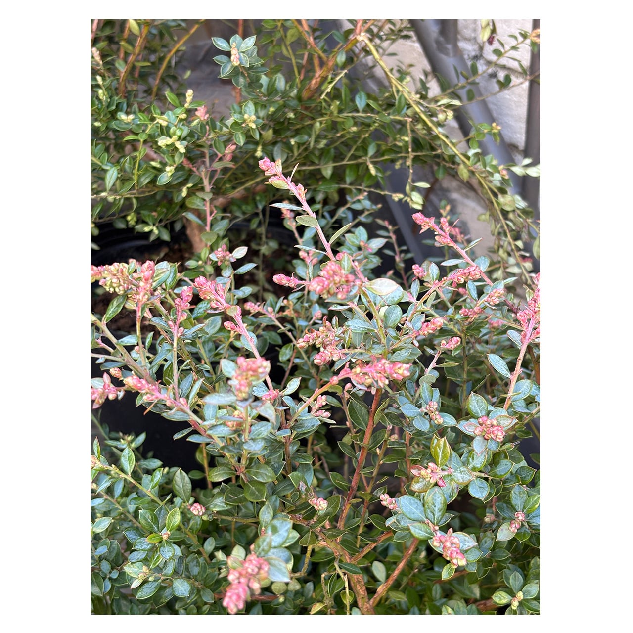 葉の色の移り変わりも鮮やかで、新芽は赤紫のような色をしており、しばらくすると他の葉のように緑色になります。冬に寒さにあたると全体的に葉が赤くなり紅葉が見られます。常緑で葉の変化を季節を通して楽しめる上に、花が咲き実がなるなんて、とても魅力的だなと思います。