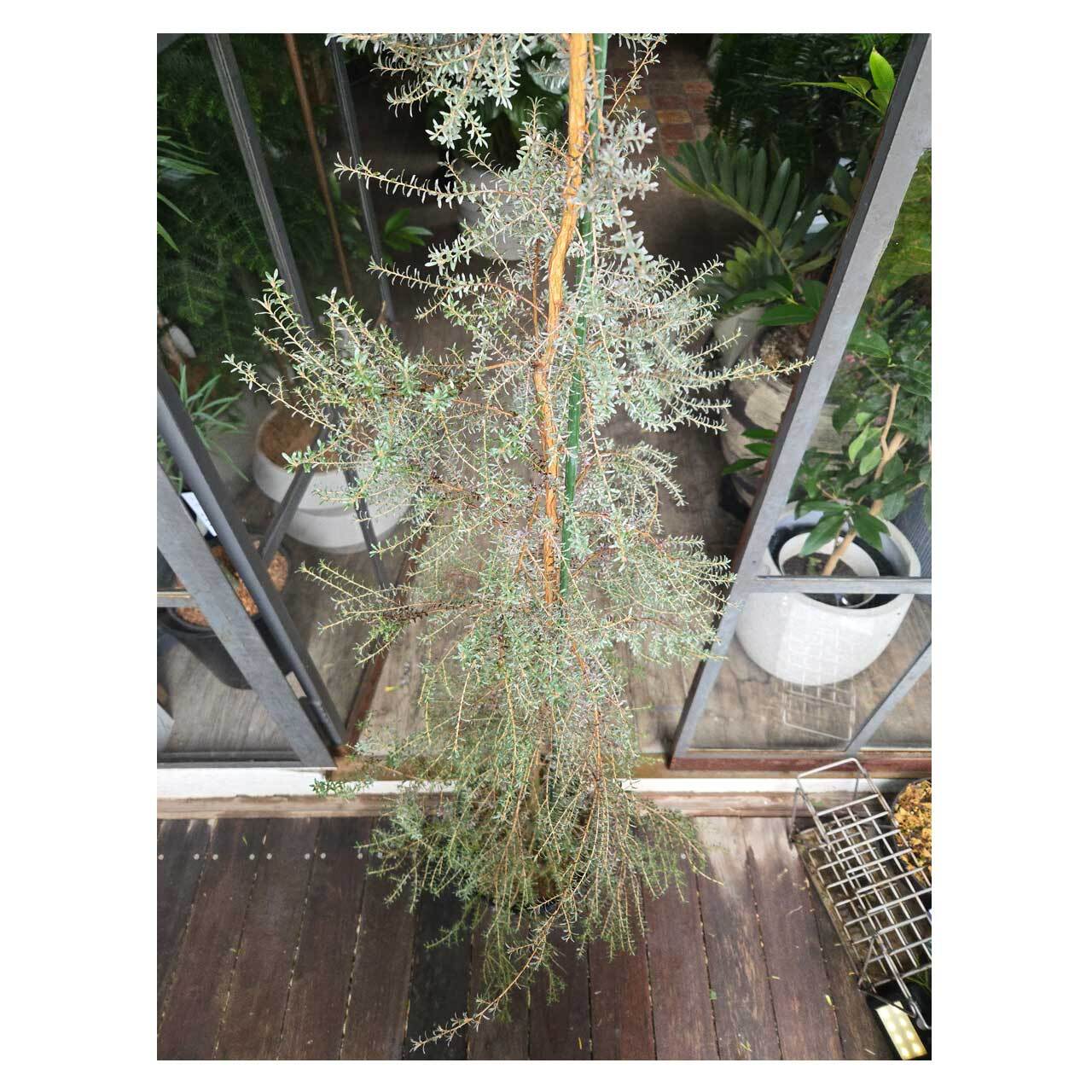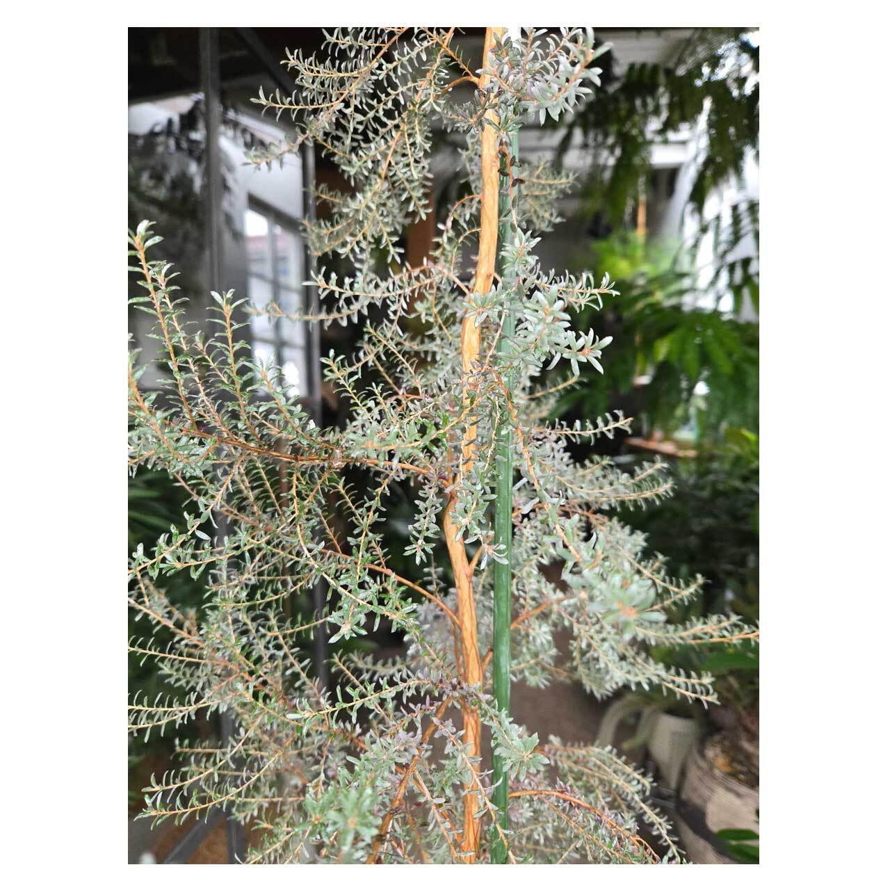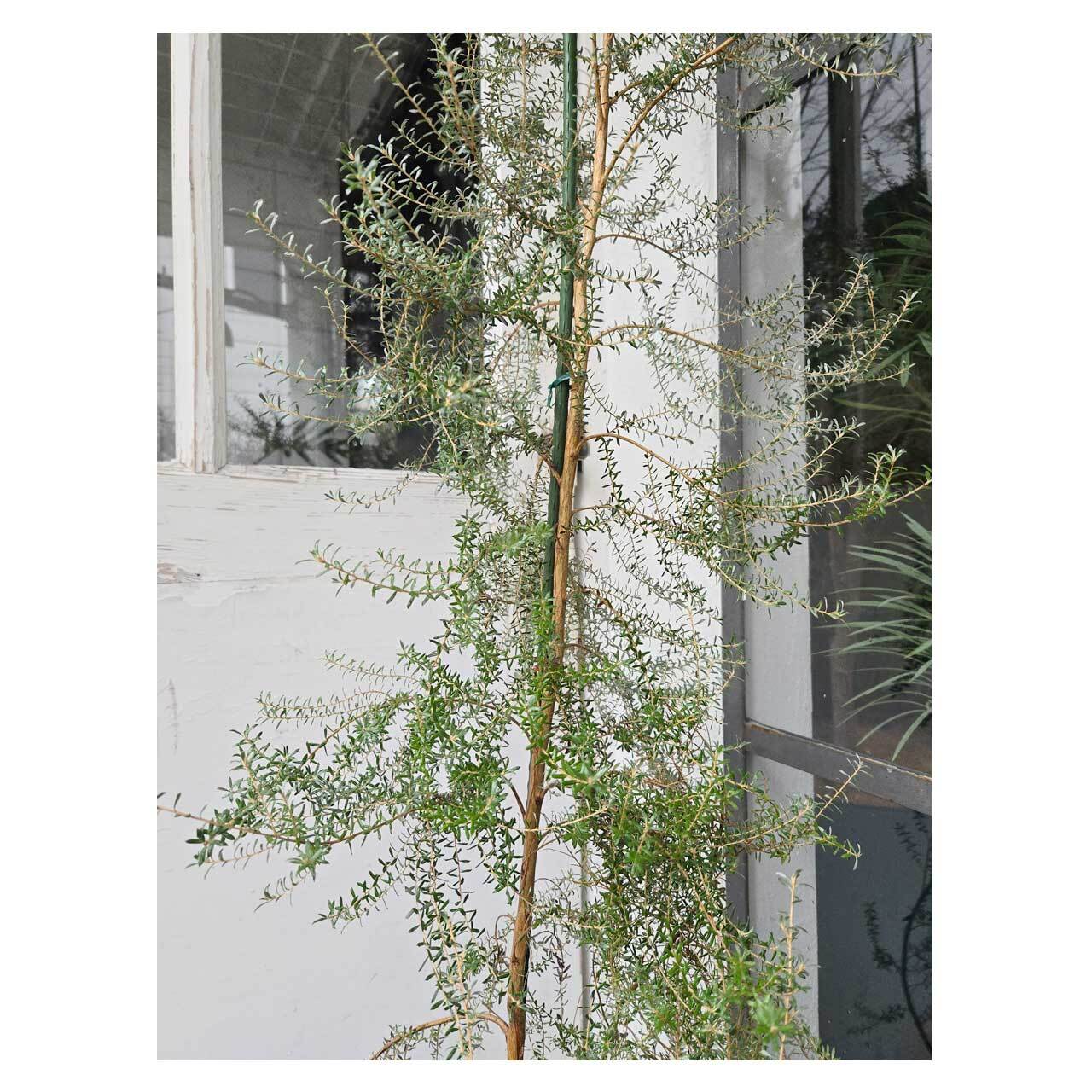 白っぽくシルバーがかった色の小さな葉が可愛らしい、こちらの植物。レプトスペルマムの仲間で、その見た目から日本では「ホワイトティーツリー」の通称で呼ばれています。細めの枝ぶりで、全体的に柔らかな印象です。