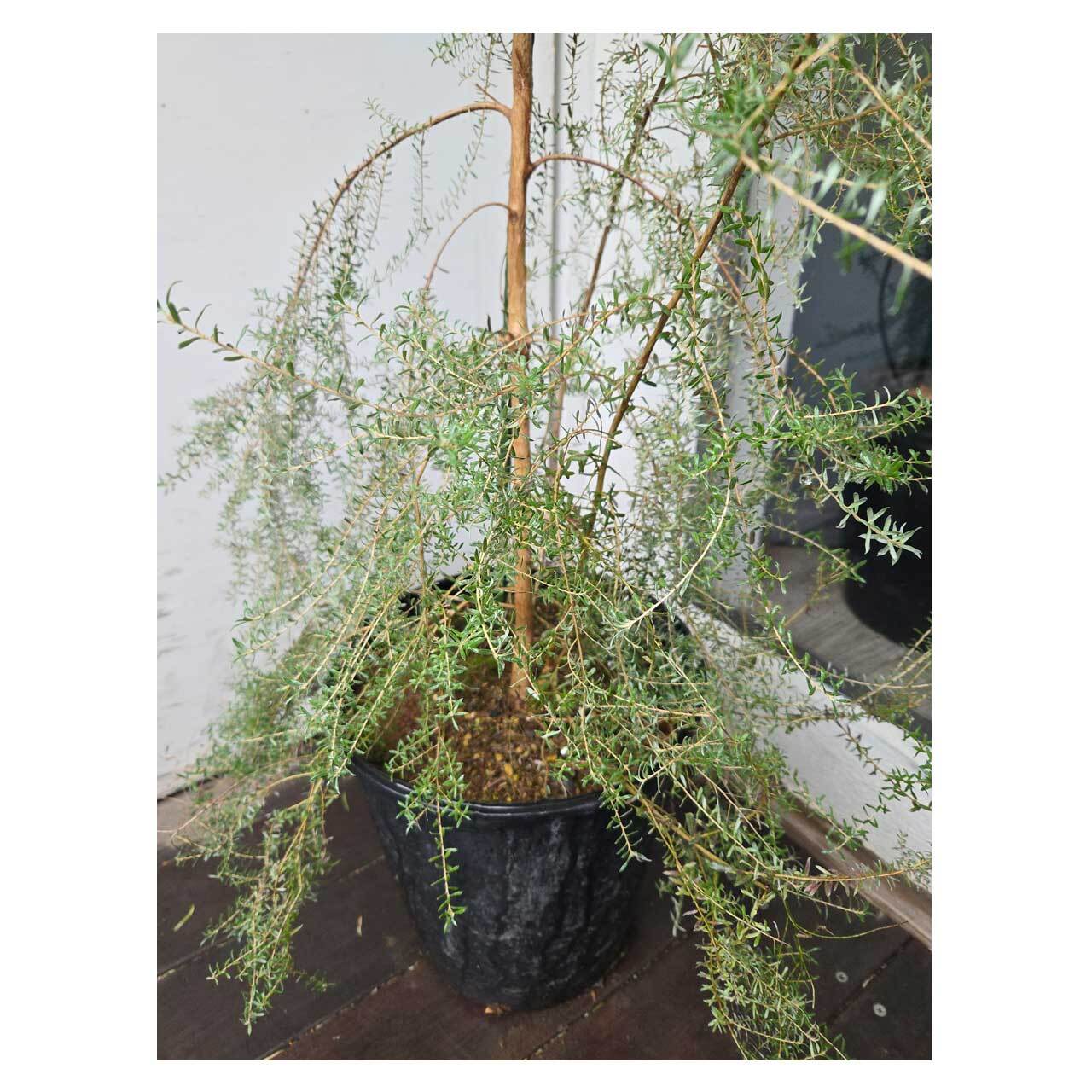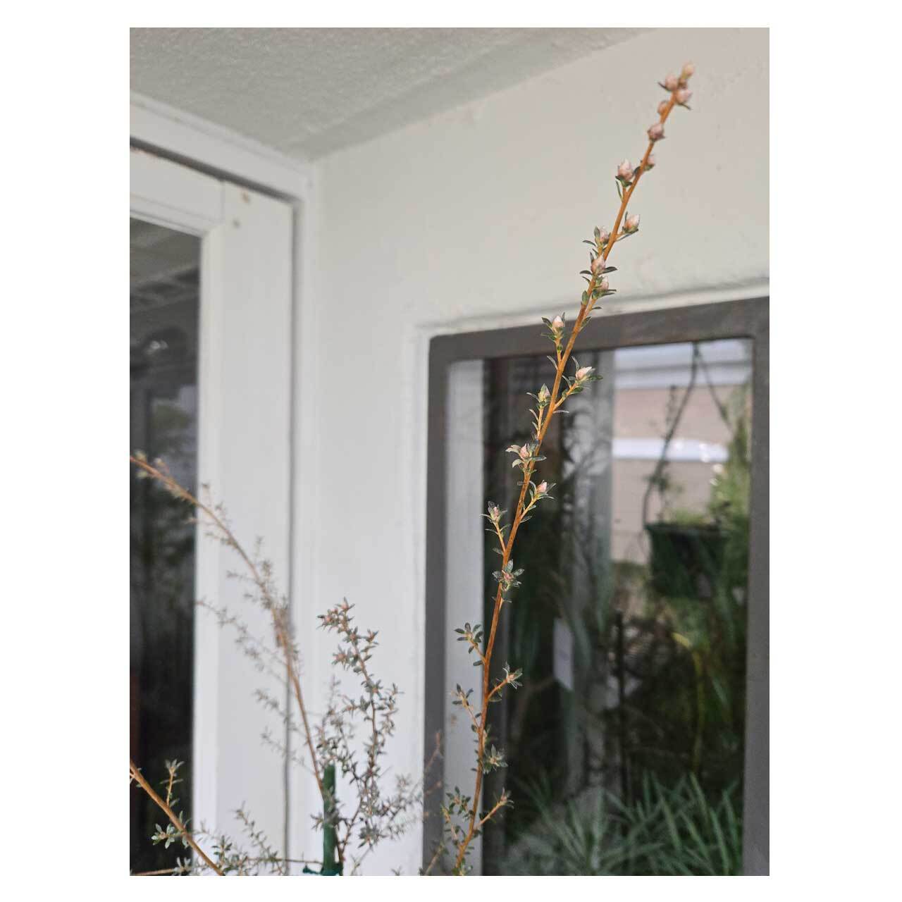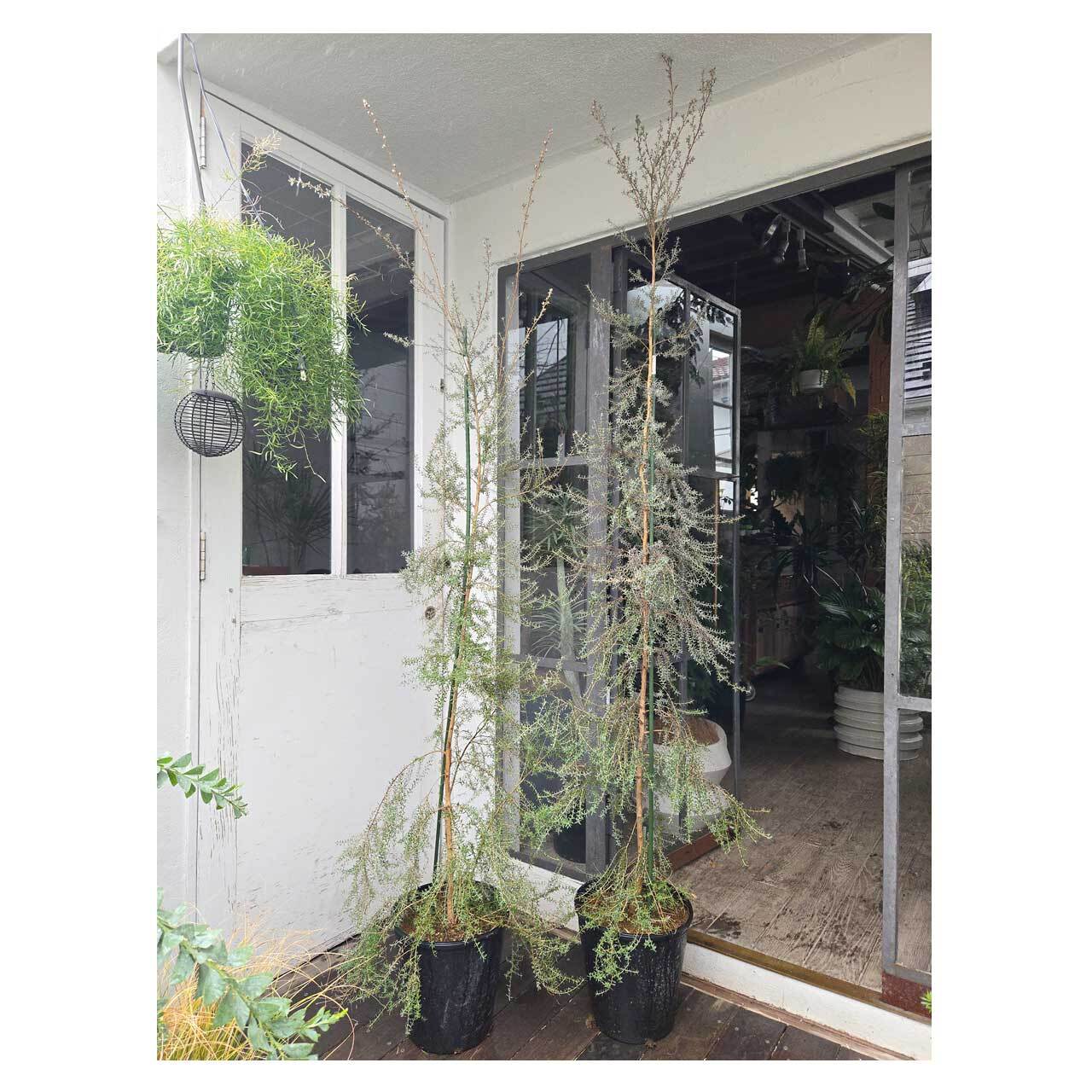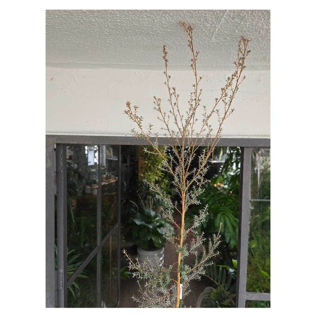 見た目のしなやかさとは裏腹に、丈夫で育てやすいところも魅力。レプトスペルマム=ギョリュウバイの仲間で、春~初夏には白い小さな花を咲かせます。