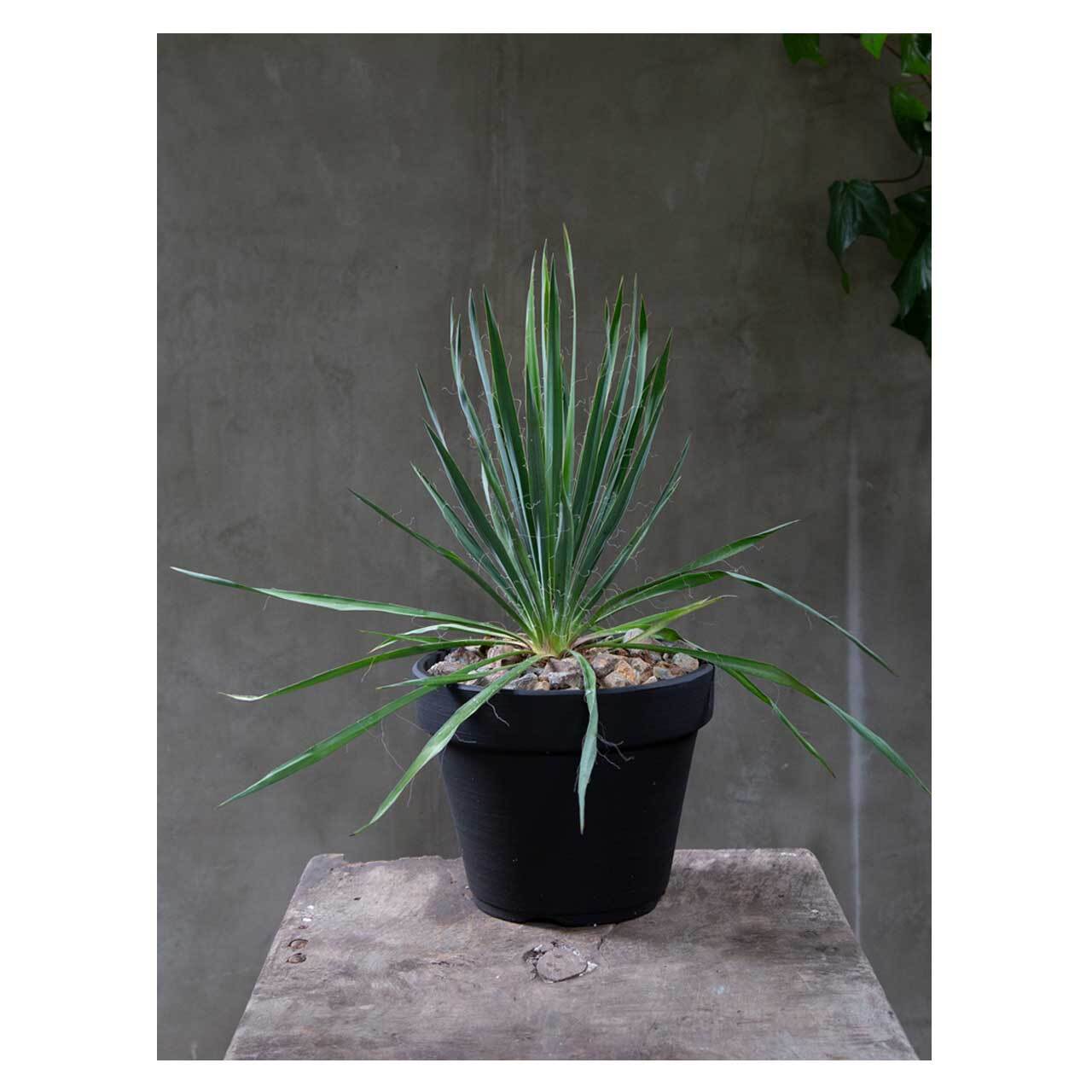 幹が極めて短く立ち上がらず、ユッカ属の中では比較的コンパクトな品種。葉は粉白を帯びた緑色で細長く、葉先に棘がありますが、他のユッカに比べるとかなりマイルドな棘なので、置き場所にあまり気を使わずに済むのも嬉しいところです。アメリカ南部の原産ですが、葉の感じなどは熱帯の植物のような雰囲気もありつつ、暑さだけでなく寒さにもそこそこ強いので、観葉植物としての取り入れやすさも◎。
