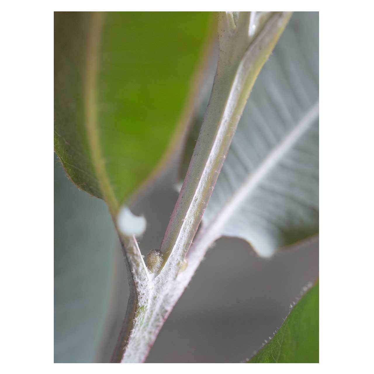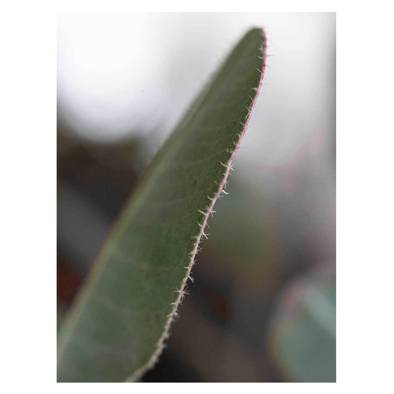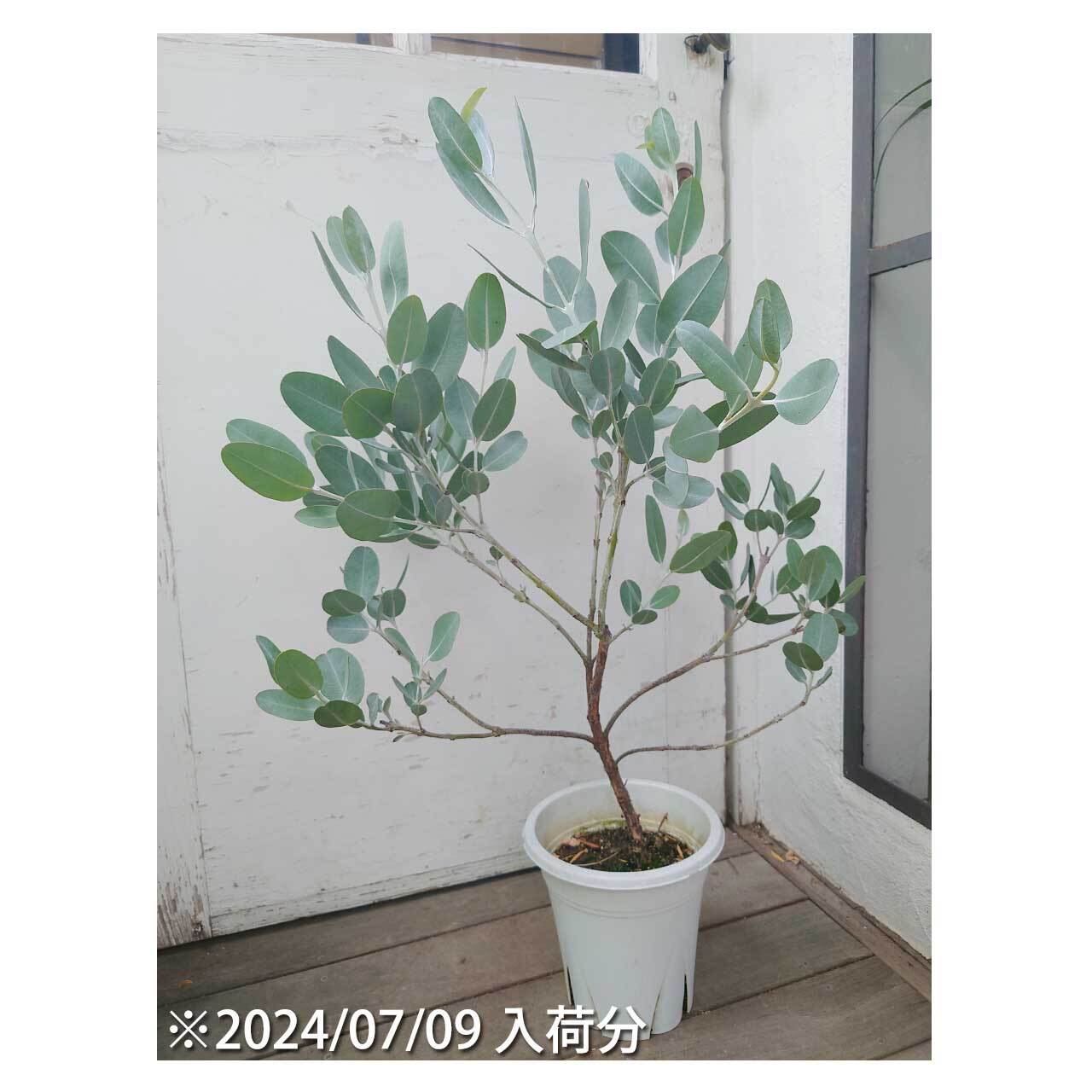 "テトラゴナ シルバー" とも呼ばれるオーストラリア原産の植物で、大きめの葉と、よく見ると茎が平たく角張っているところも特徴的。蕾や花、実もユニークな形をしているので、育てながらお楽しみいただけるかと思います。幹や葉の幼いうちは産毛が生えていますが、成長するにつれ無くなっていきます。