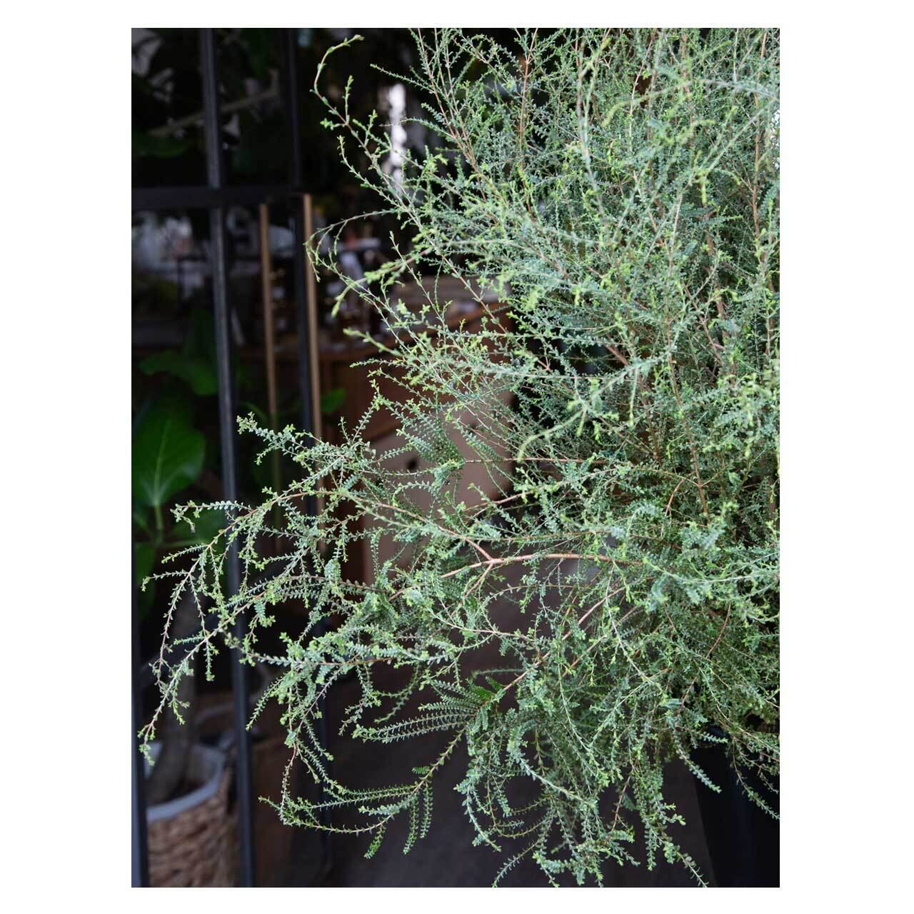 細やかな葉と華奢な枝が、わさっとしつつも柔らかな印象を与えてくれる メラレウカ デクサータ 'ドワーフ'。ブルーグリーンのような色の葉、やや枝垂れながら自由に伸びる枝が、お庭の雰囲気を穏やかに演出してくれそうです。