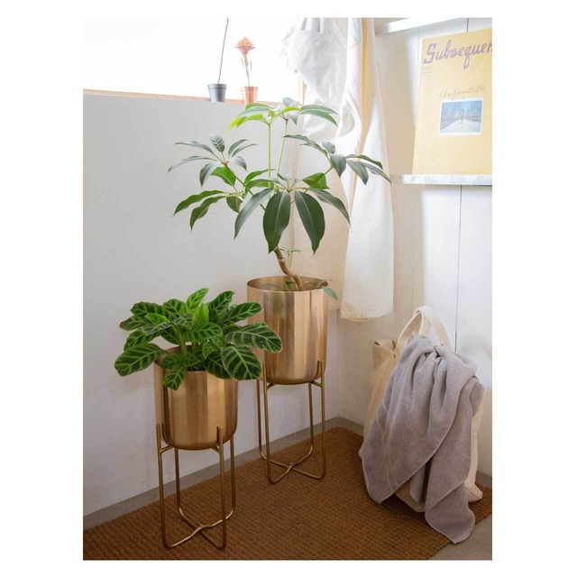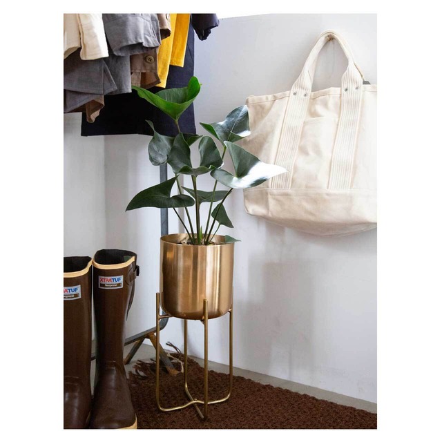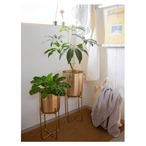 適度にラグジュアリーな雰囲気と重厚感を纏う、アイアンスタンド付きのプランター。ゴールドカラーが映えます。