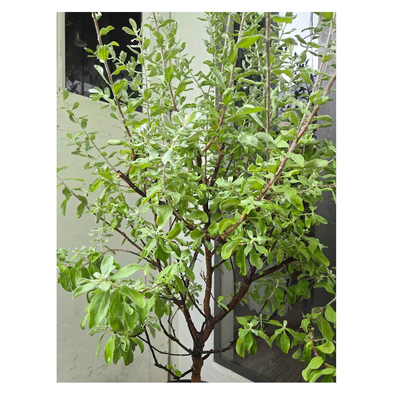 少し捻じれたようなユニークな形のシルバーリーフが特徴的な、レウコフィラム(レウコフィルム) フルテッセンス。北米原産の常緑低木で、「二―オン(Neyon)」「テキサスセージ」といった別名もあります。
