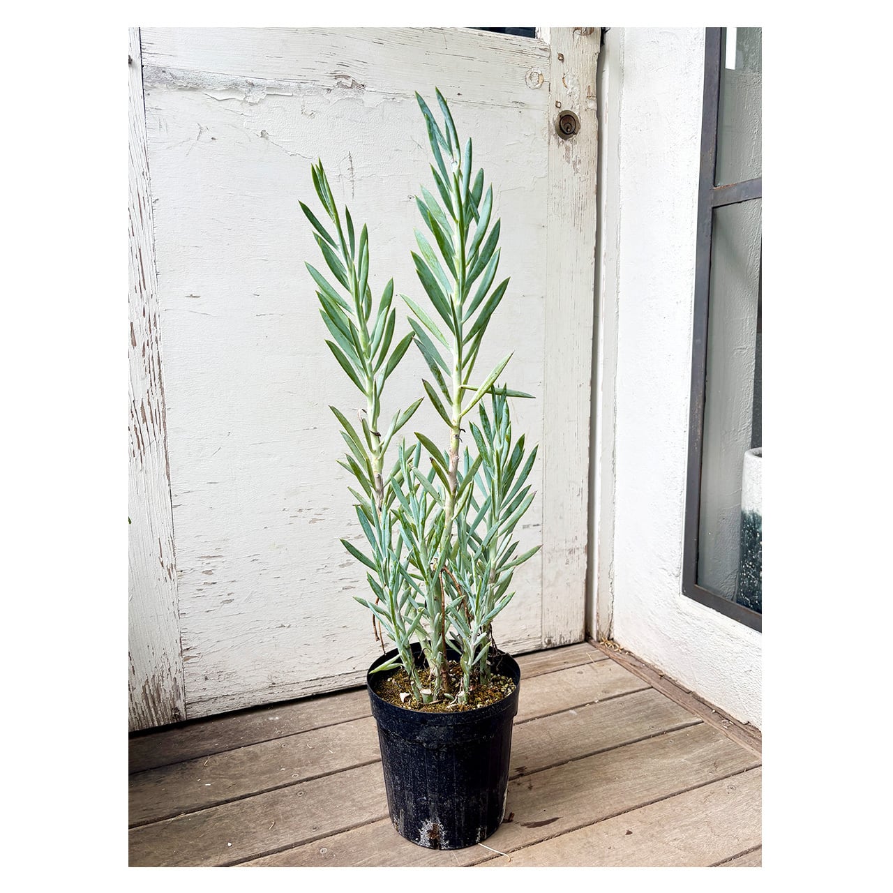 白みがかった青緑色の葉と造形が美しい セネシオ フィコイデス。南アフリカ原産の多肉植物で、初夏に茎の先端に白い小さな花を咲かせます。