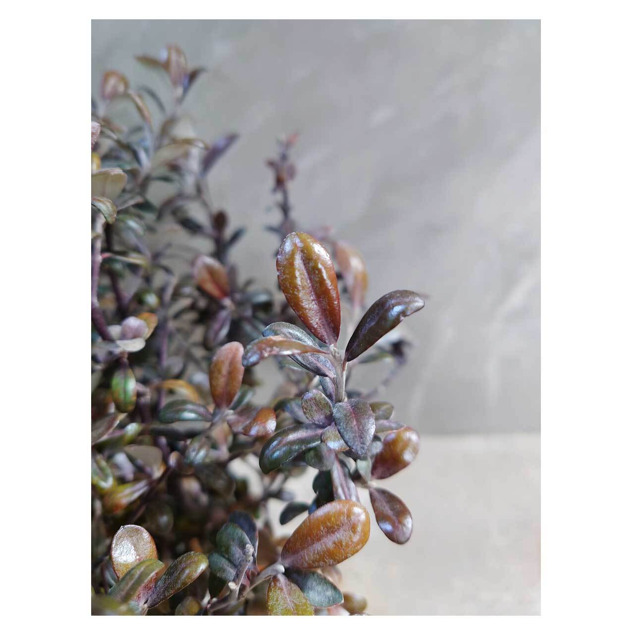 丸みを帯びたグリーン~ブラウンの葉が大人っぽくて素敵な、コロキア 'フロステッドチョコレート'。その名の通りの、紅葉した1枚1枚の葉を見ているとアーモンドチョコのようにも見えてきて、とても愛らしいです。