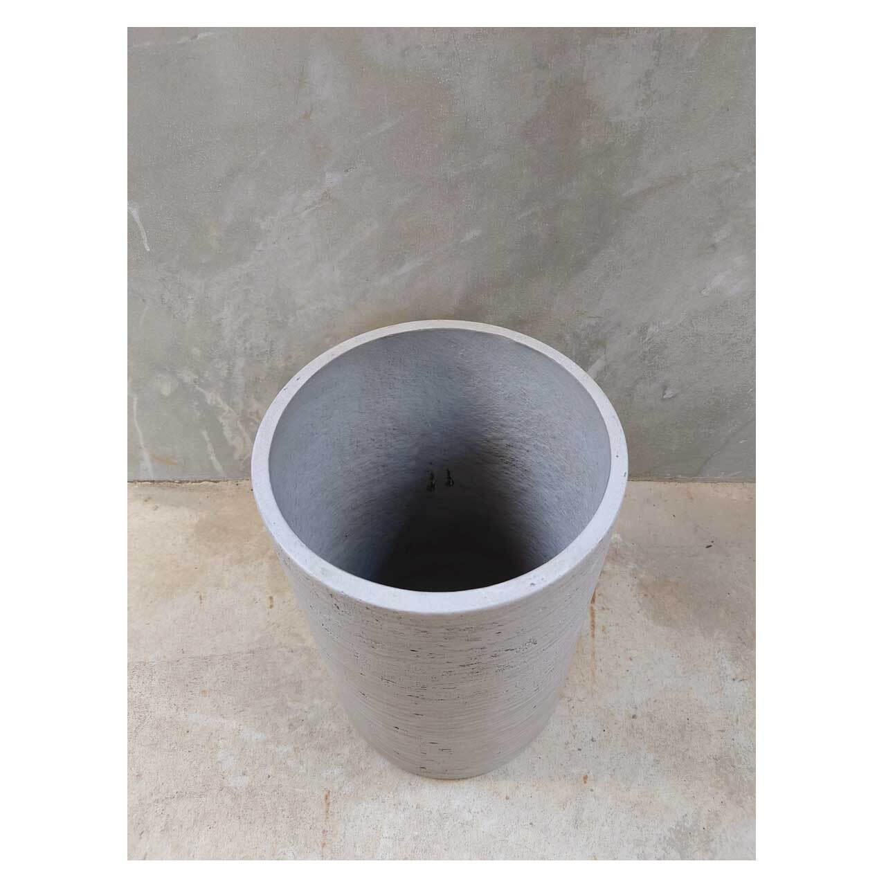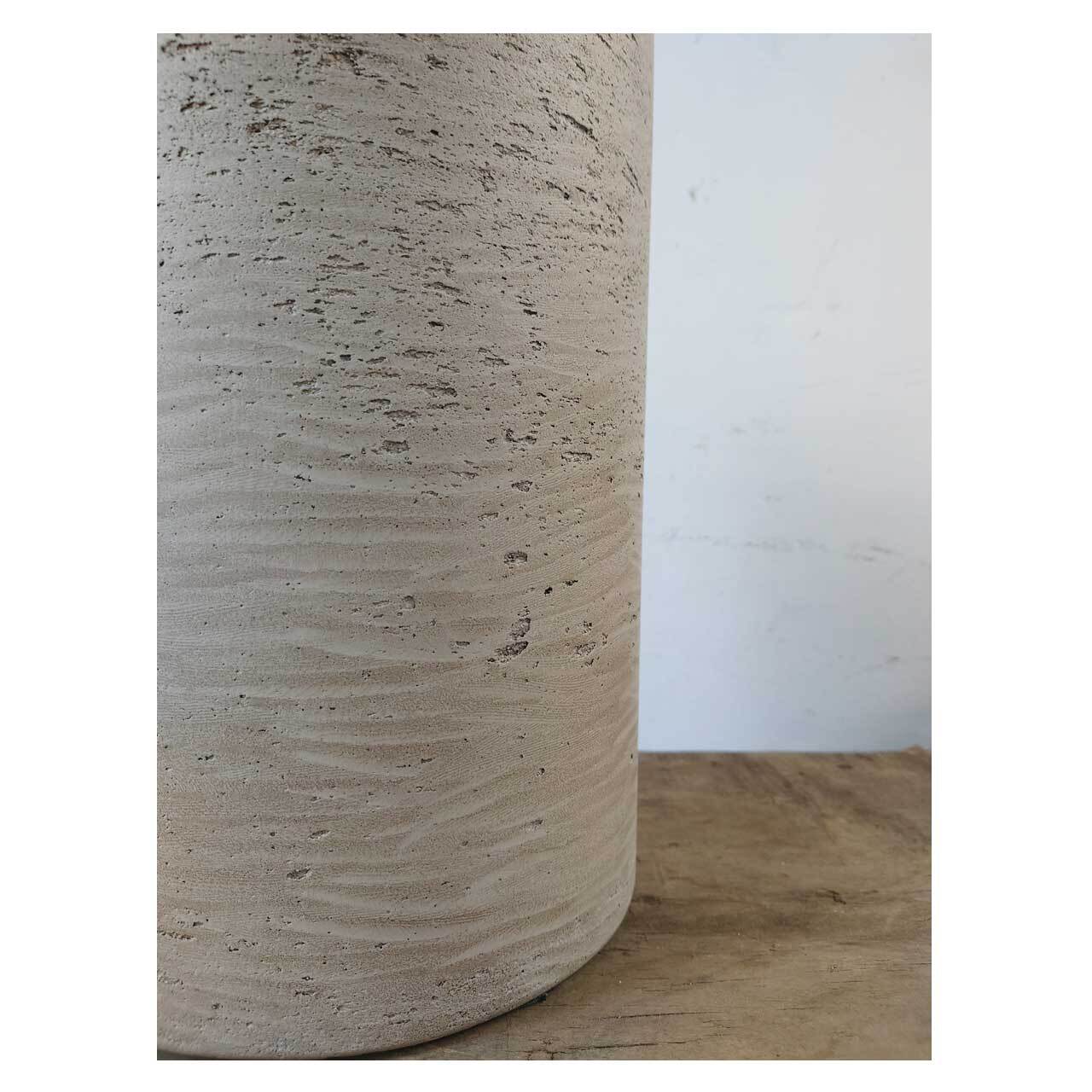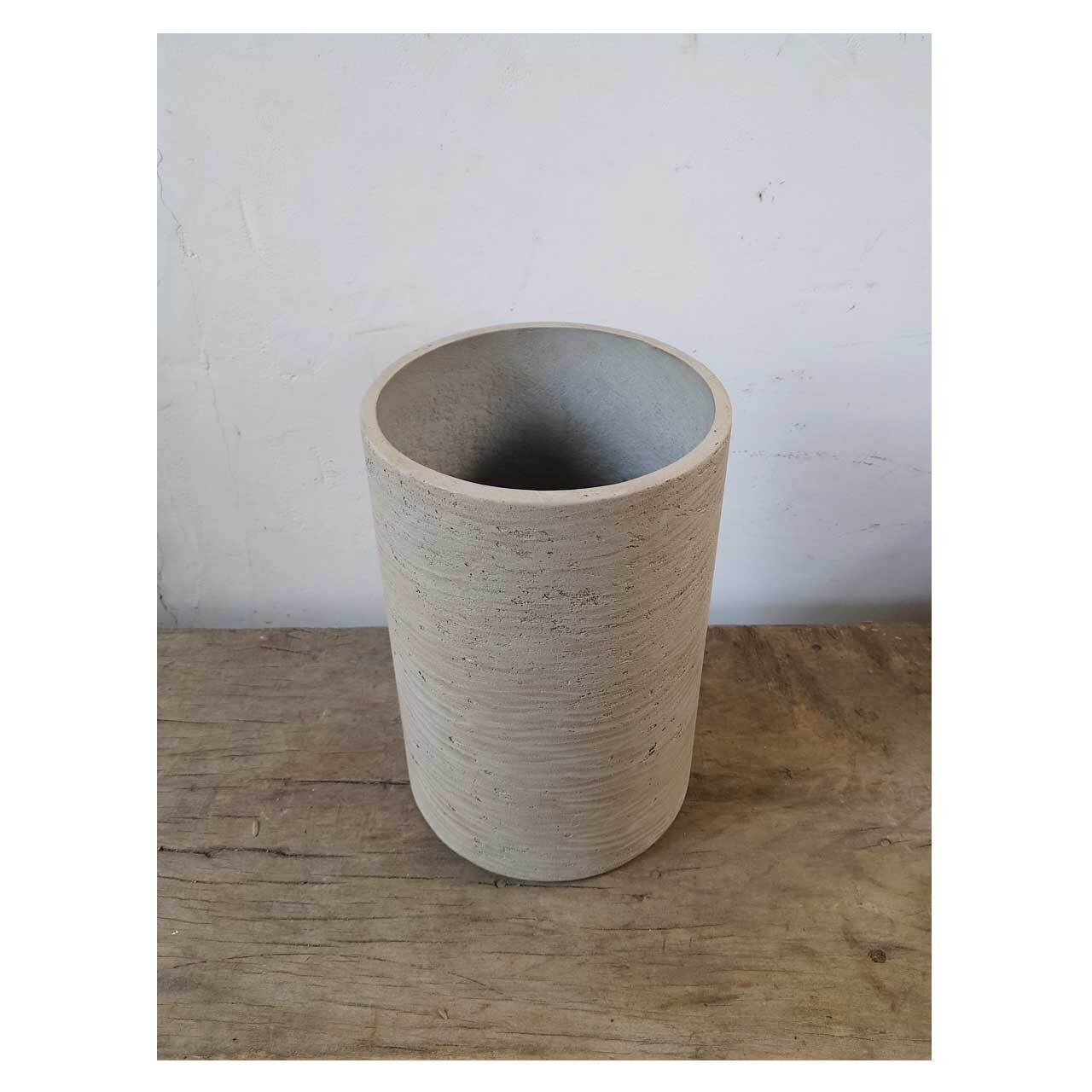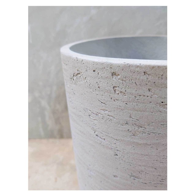 コンクリートのような表面の質感を残した仕上げの、シリンダー型の鉢カバー。高さ35cm、ウォッシュグレーというカラーですが、光の具合によってはベージュっぽく見えます。