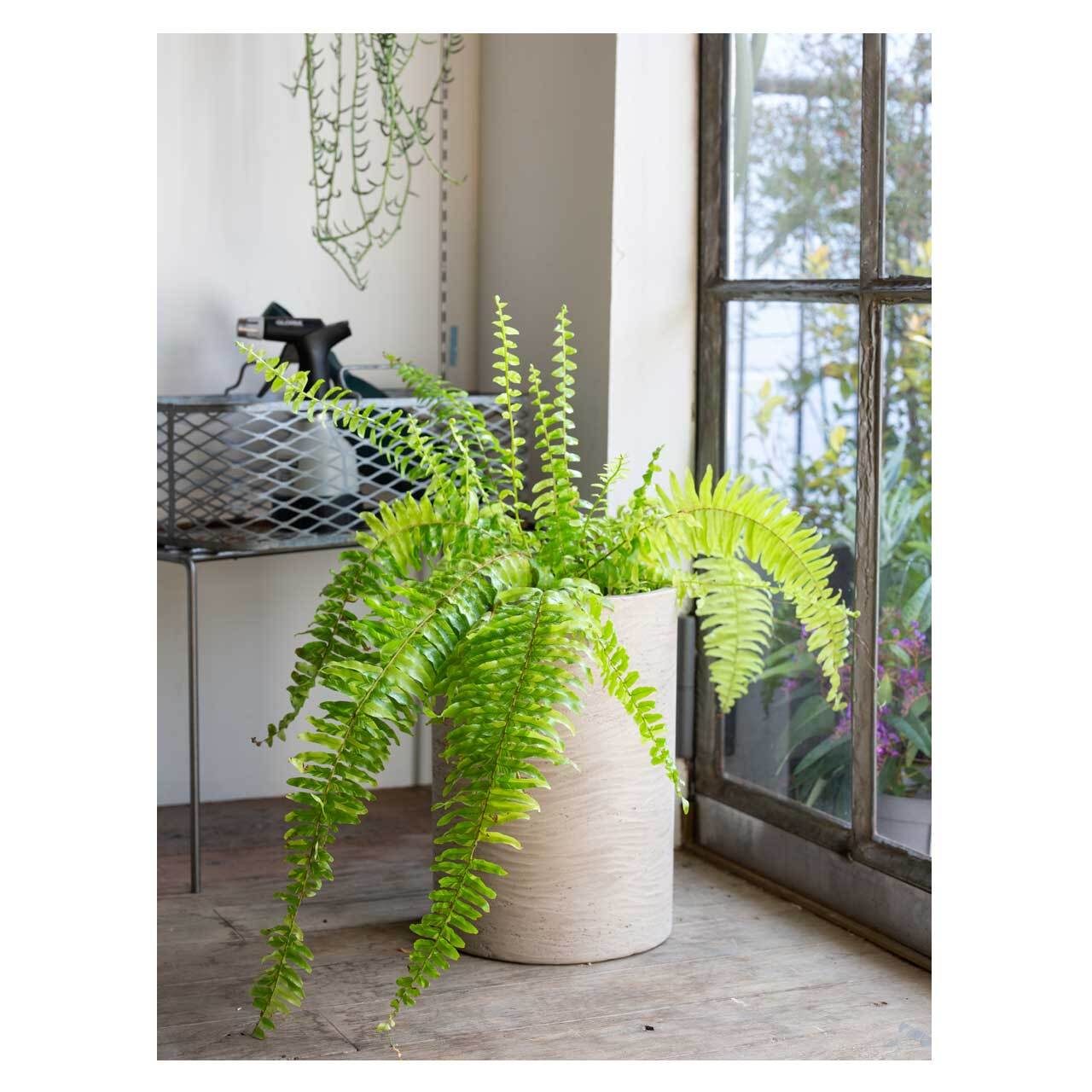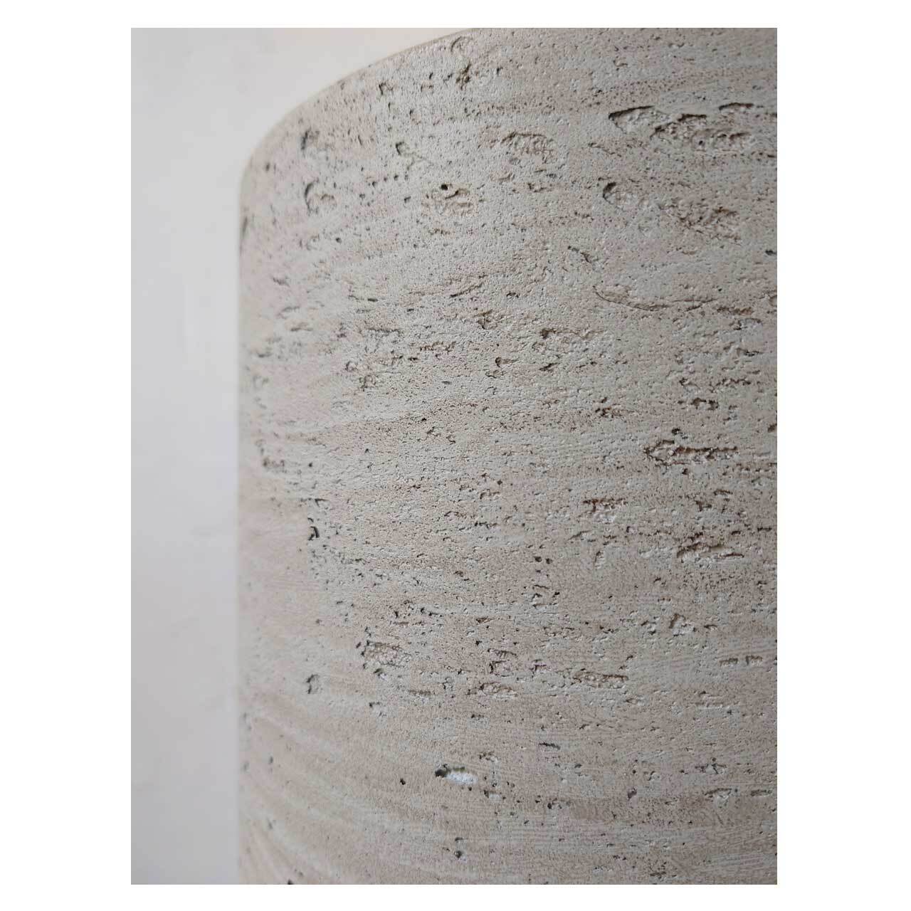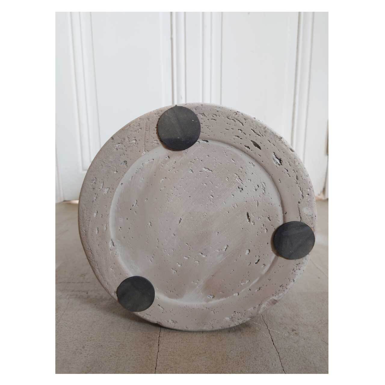 コンクリートのような表面の質感を残した仕上げの、シリンダー型の鉢カバー。高さ35cm、ウォッシュグレーというカラーですが、光の具合によってはベージュっぽく見えます。