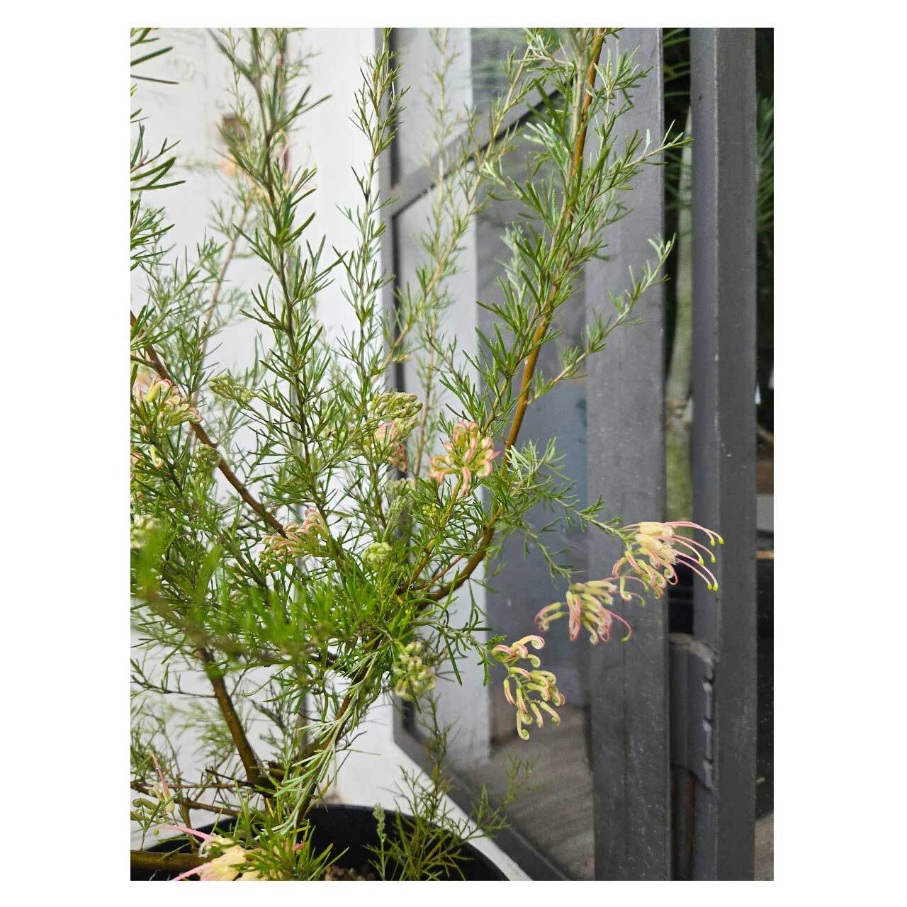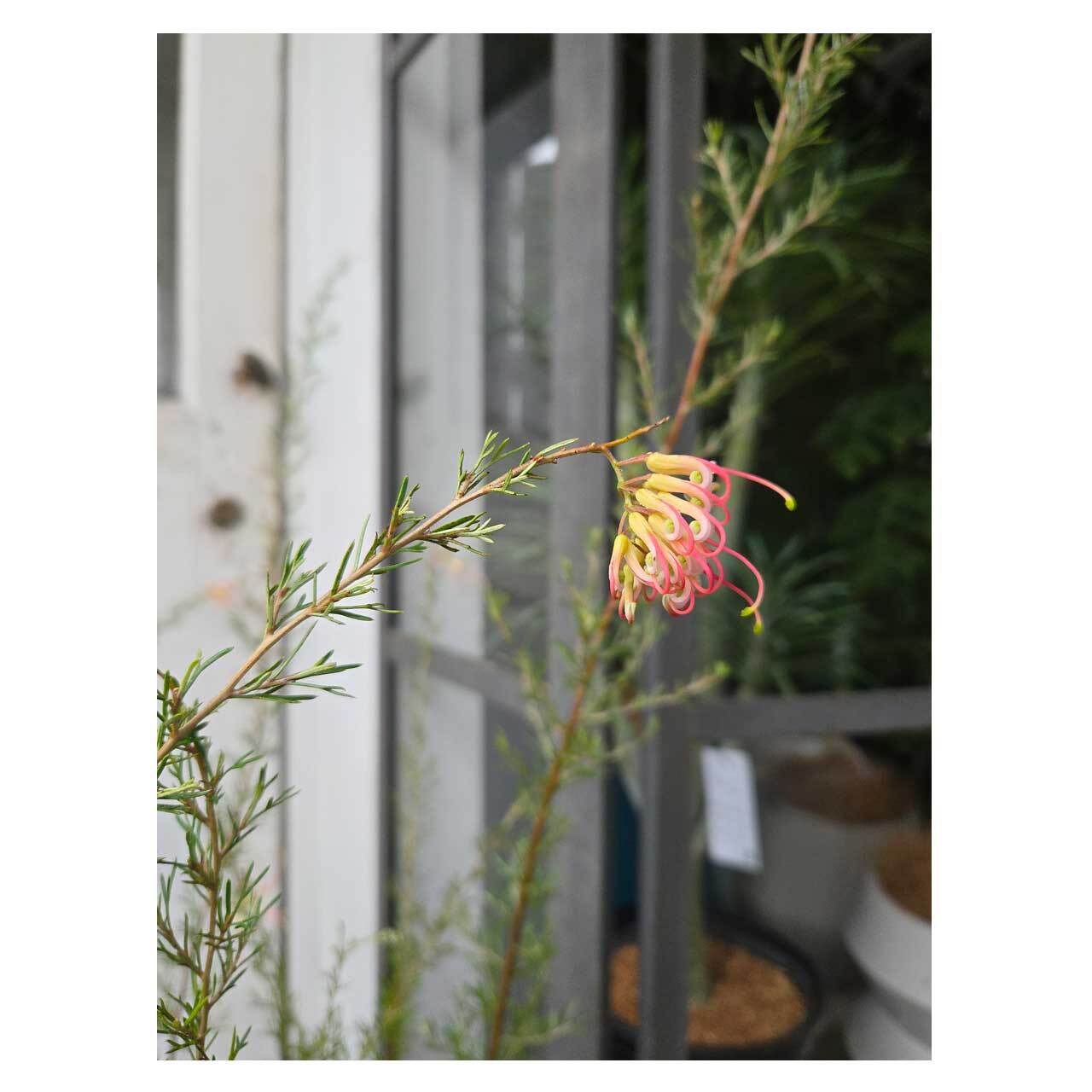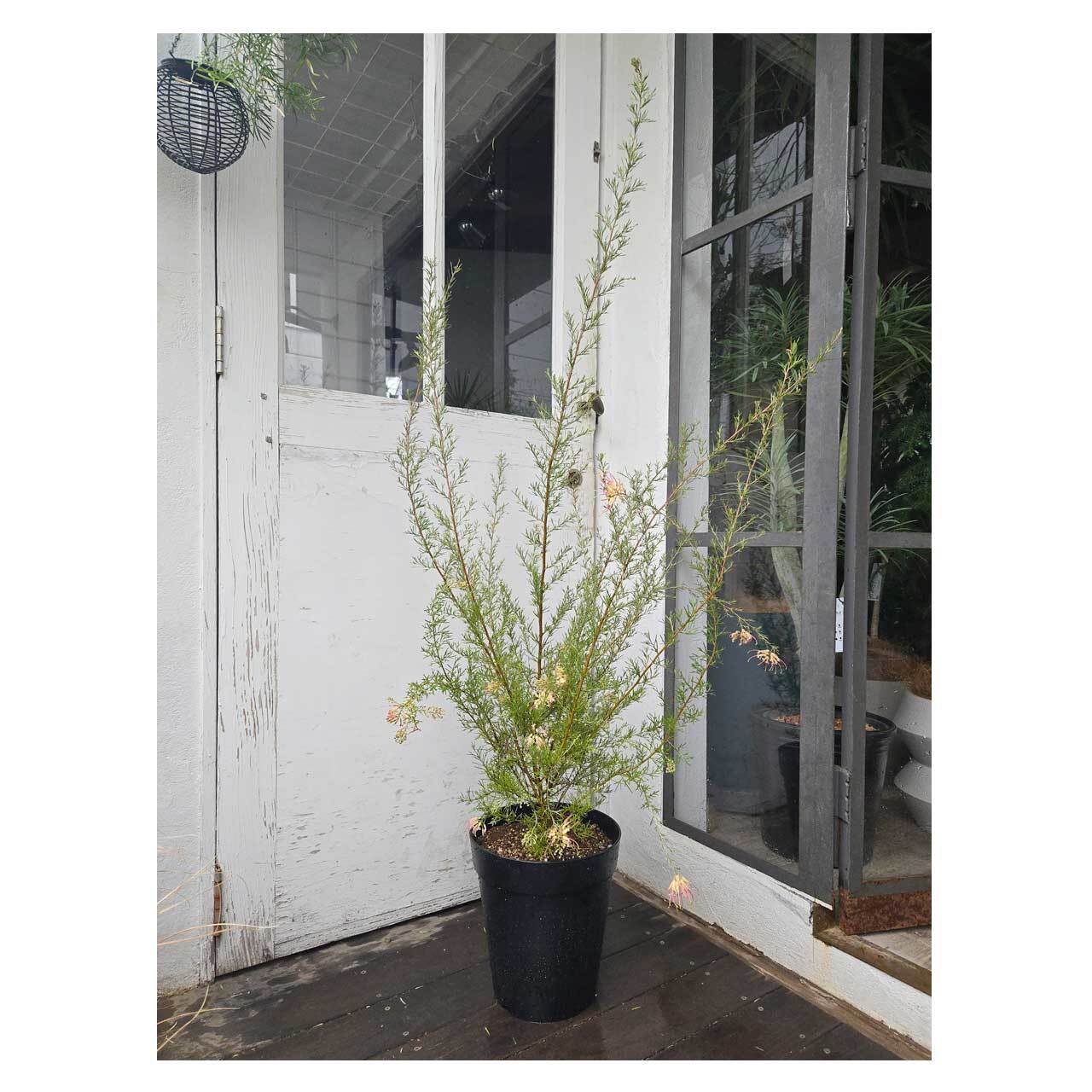 オーストラリアを中心に250種ほどあるグレビレア。こちらはイギリスで作られた園芸種で四季咲きの常緑低木です。葉は細かいながらも切れ込みが入った形で、ライトグリーンと深い緑が入り混じった葉色も印象的です。地植えにするとボリューム感が出てしっかりとした骨格になる為、お庭でも存在感をはなってくれそうです。