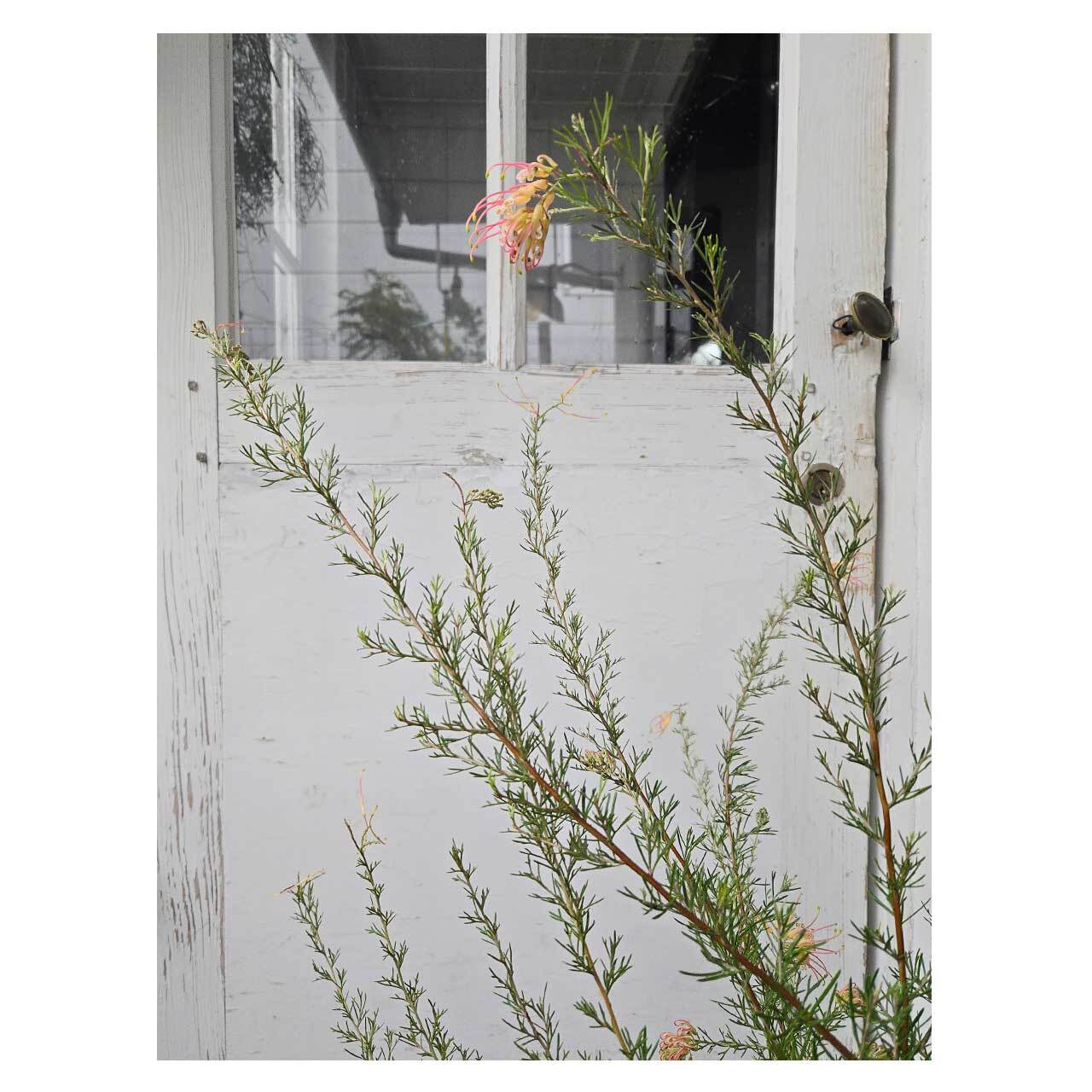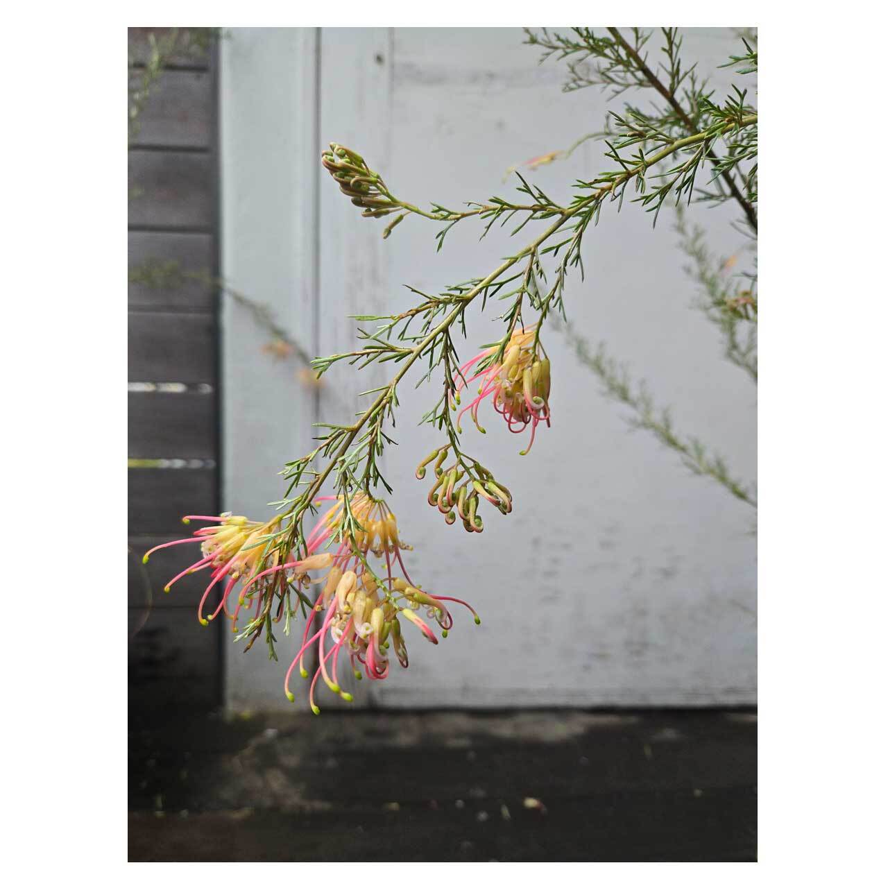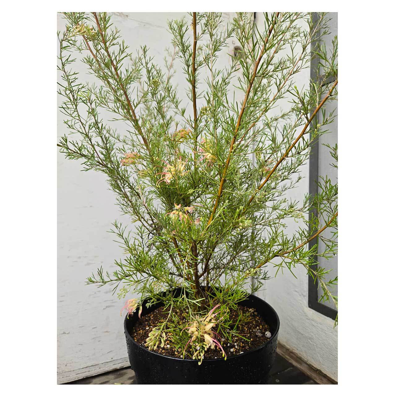 オーストラリアを中心に250種ほどあるグレビレア。こちらはイギリスで作られた園芸種で四季咲きの常緑低木です。葉は細かいながらも切れ込みが入った形で、ライトグリーンと深い緑が入り混じった葉色も印象的です。地植えにするとボリューム感が出てしっかりとした骨格になる為、お庭でも存在感をはなってくれそうです。