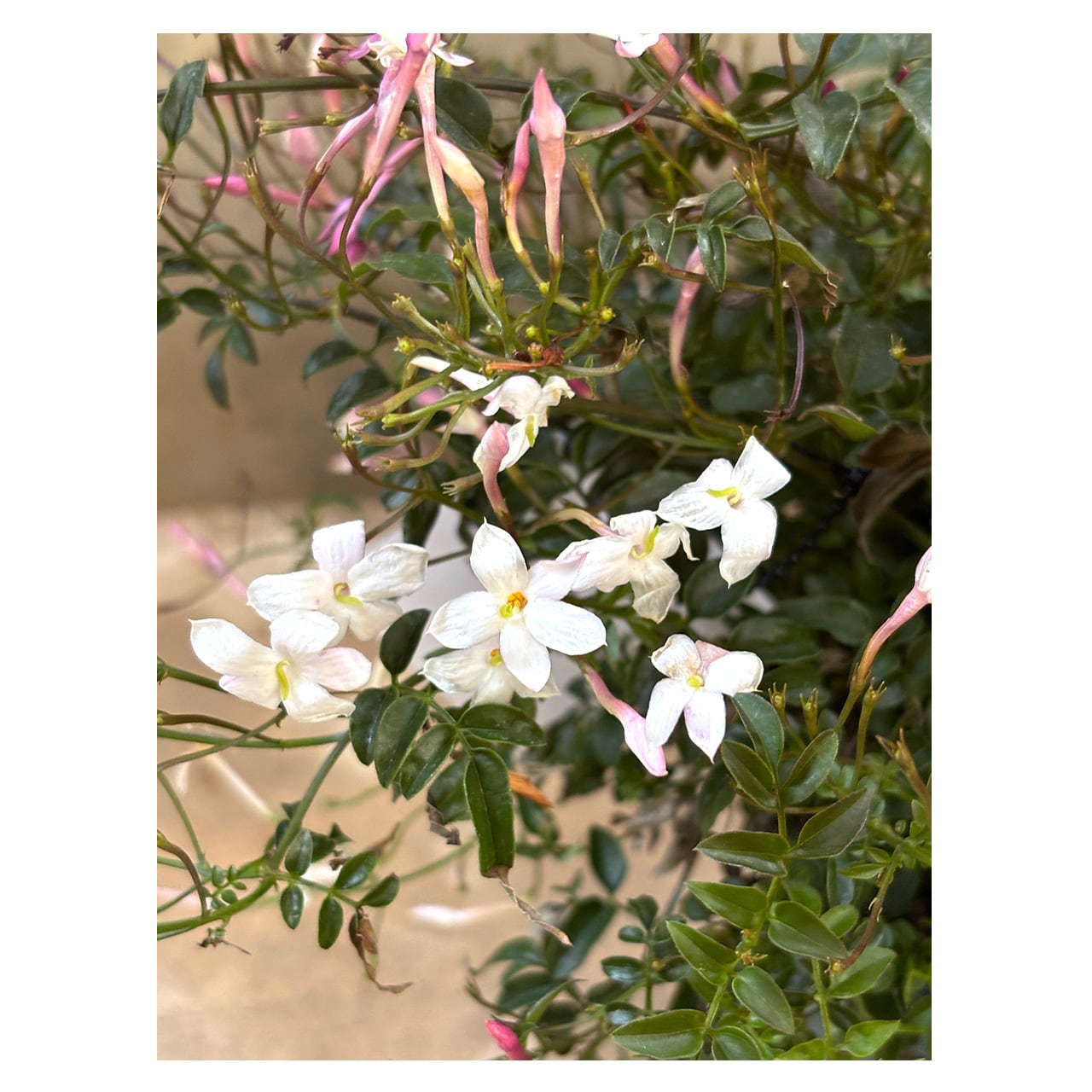 わさわさっとした蔓葉の中から伸びたピンクの蕾が愛らしい、ハゴロモジャスミン。春に咲く花は白く、濃厚な甘い香りで人気です。