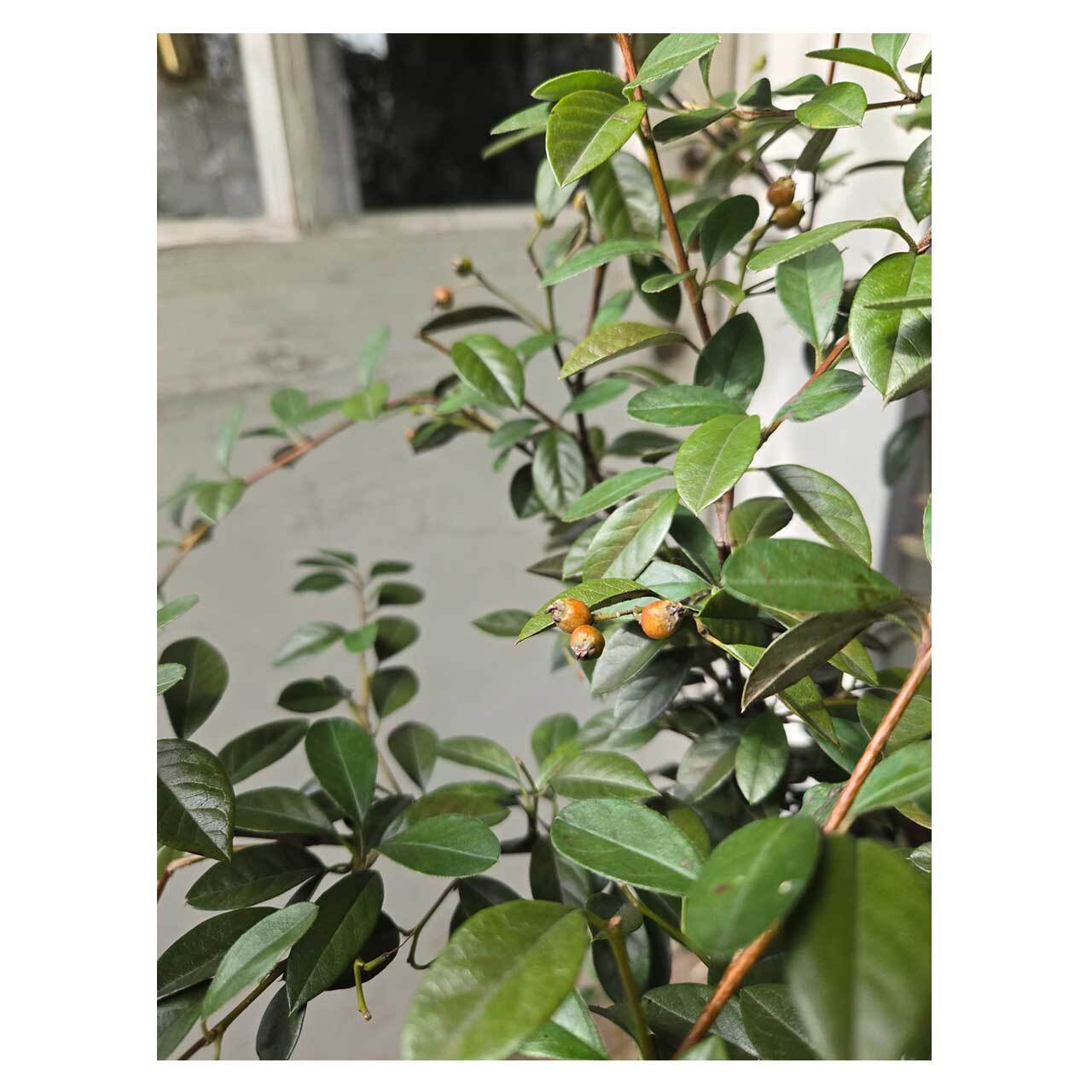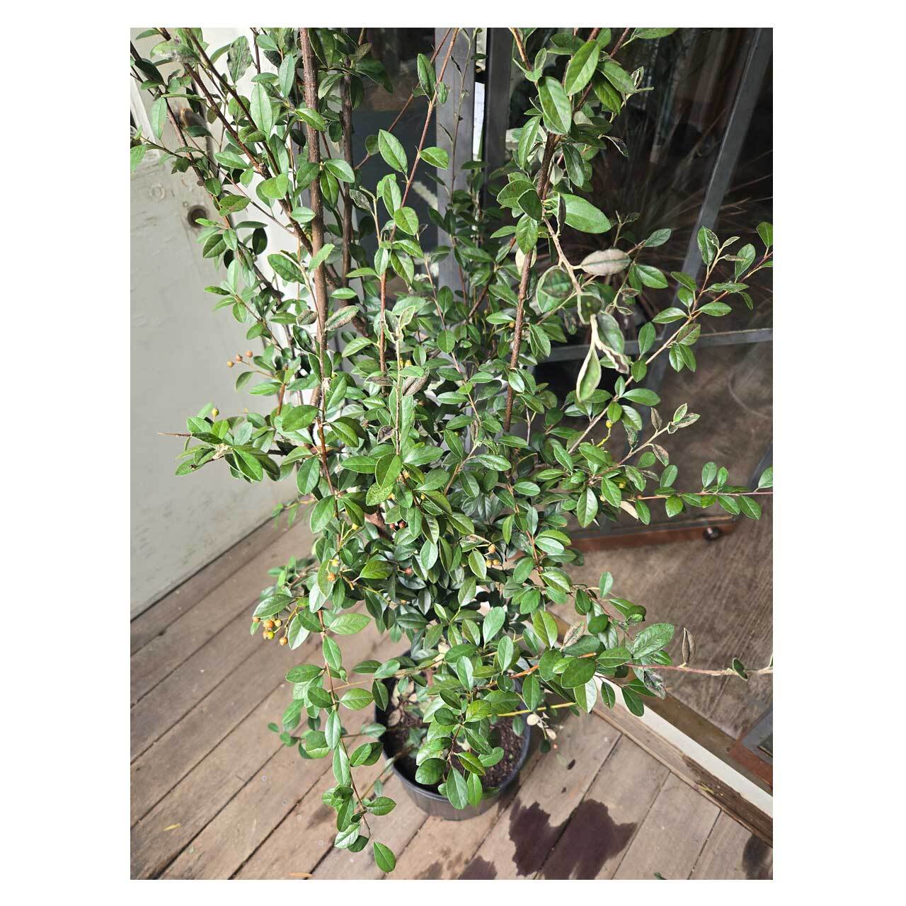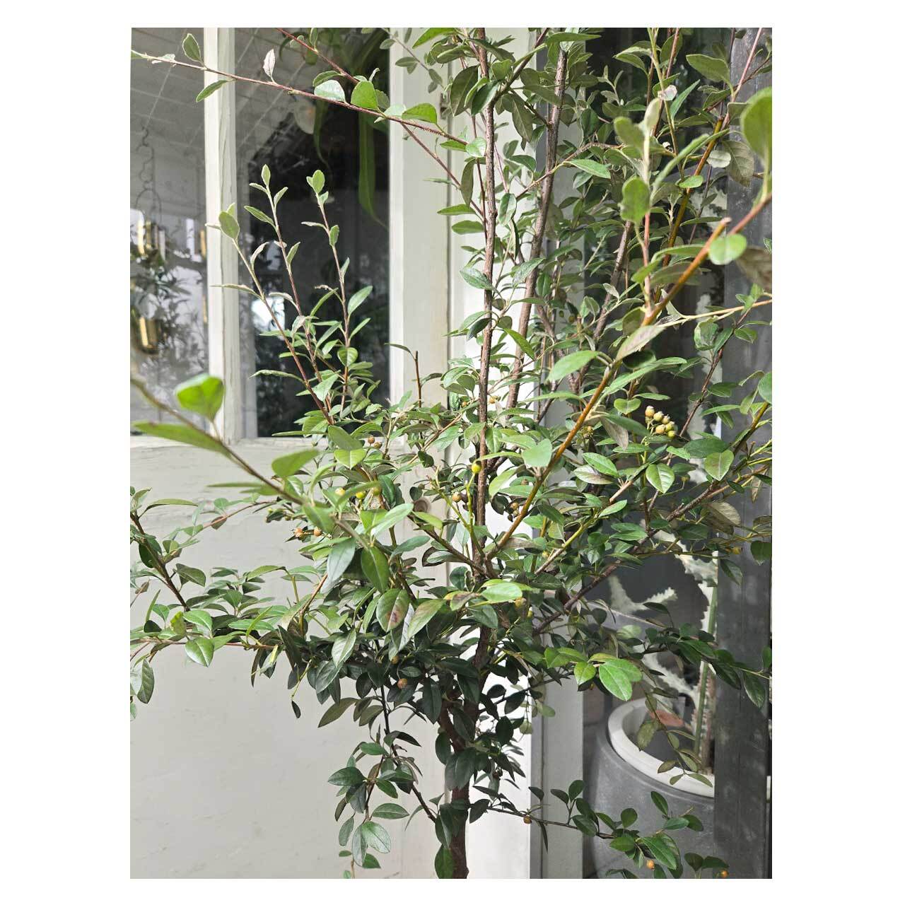 コトネアスターは中国・ヒマラヤ原産で、常緑/落葉種で50種ほどあるバラ科の植物。こちらのフランケッティは常緑でややシルバーがかった葉をしており、2m前後の高さも出るので、お庭では骨格や生垣として活用できます。
