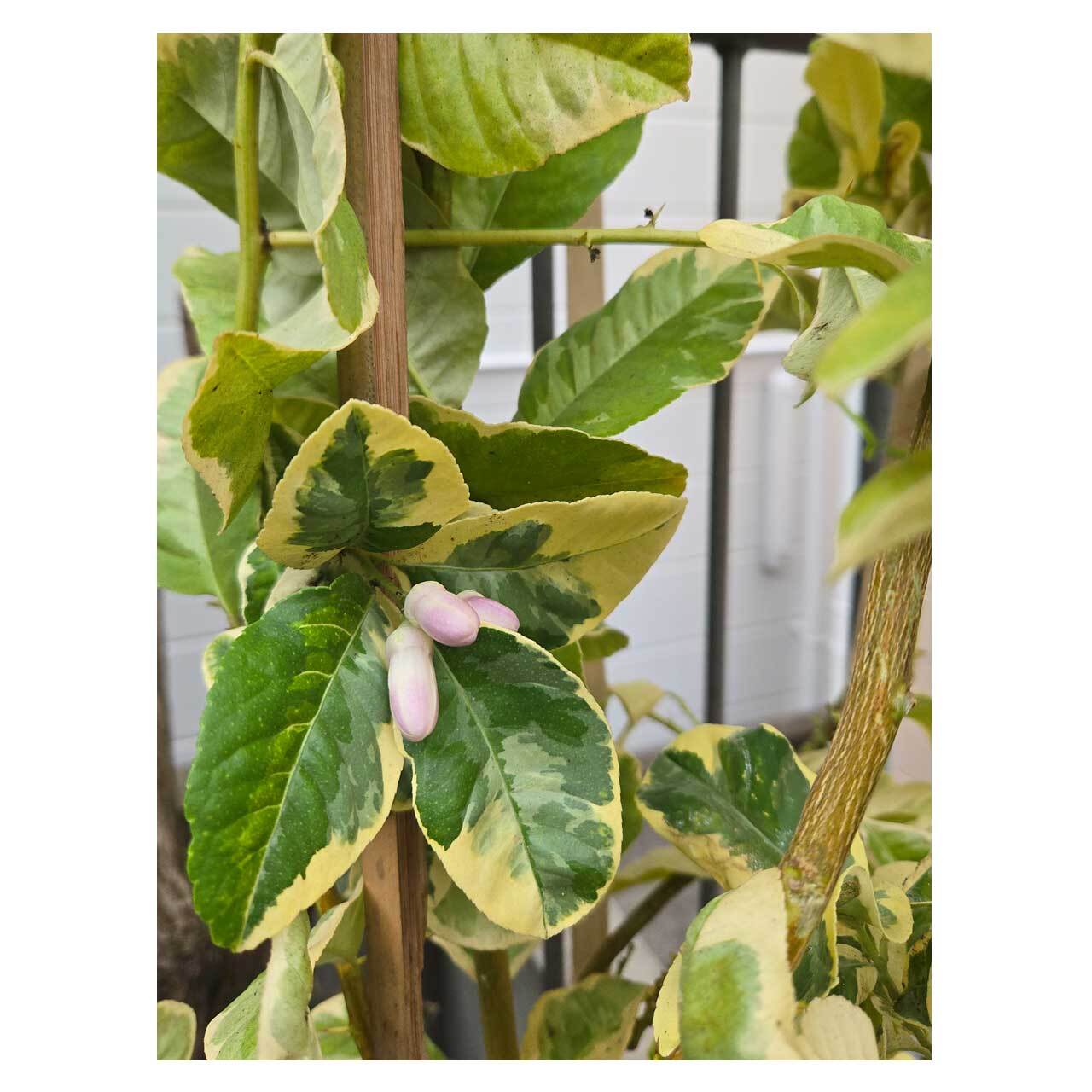 斑入りの葉は新芽のころはライトなグリーンで、生長するにつれ濃い緑と黄色のコントラストが鮮やかになっていきます。果実はその逆で、若い実は緑色のストライプが濃く、だんだんと黄色くなりコントラストが目立たなくなります。
