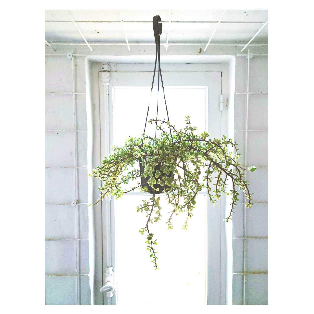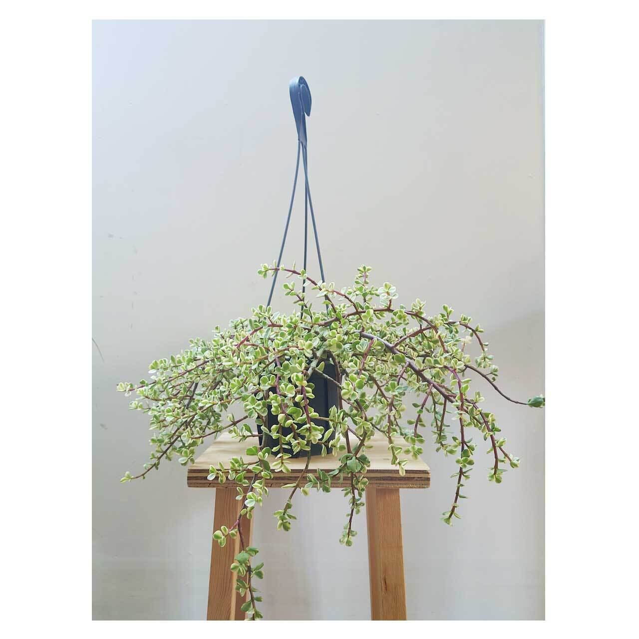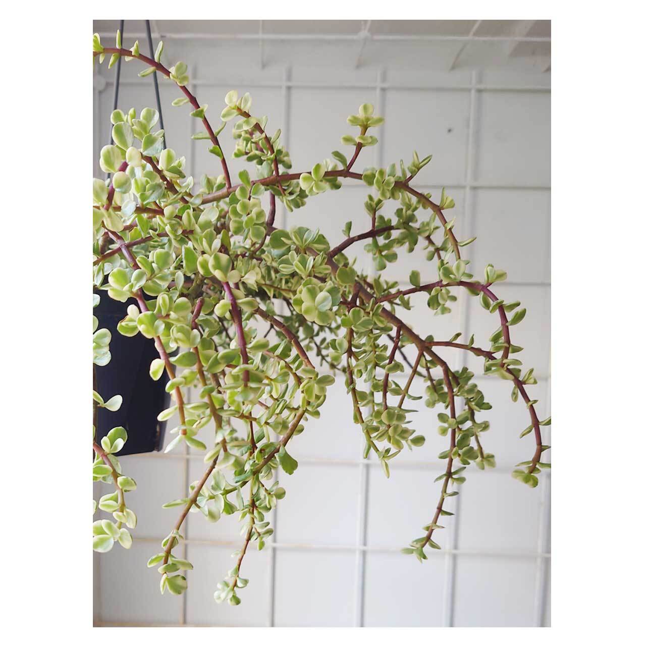 枝が横に這うように伸びて重みで垂れ下がるため、今回のようにハンギングタイプでも楽しめます。太めの枝はどこか和風な雰囲気もありつつ、明るい色あいなので他の観葉や多肉とあわせても目を惹く存在かなと思います。