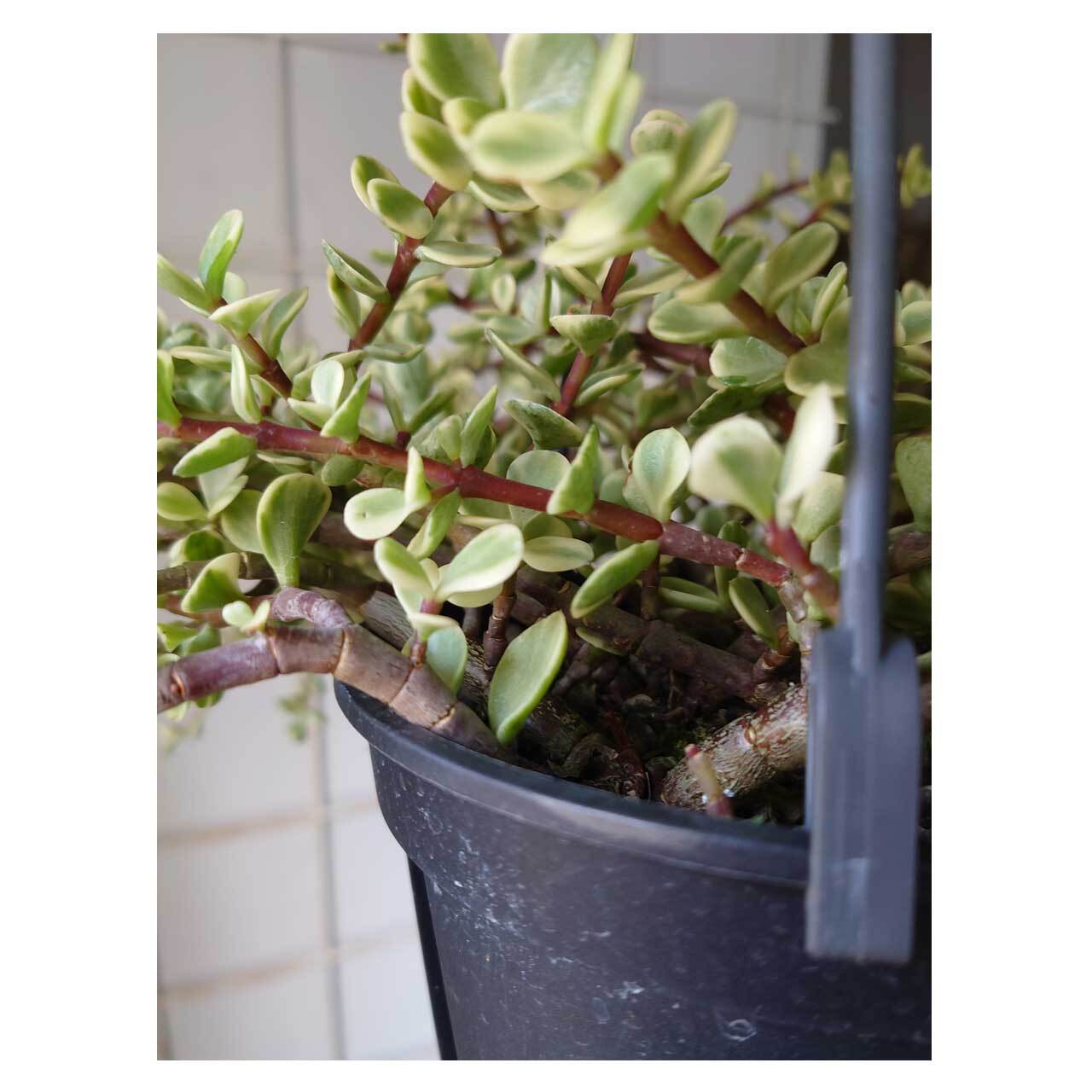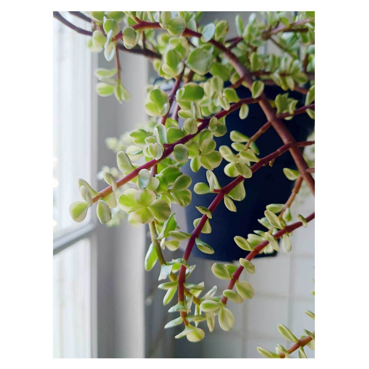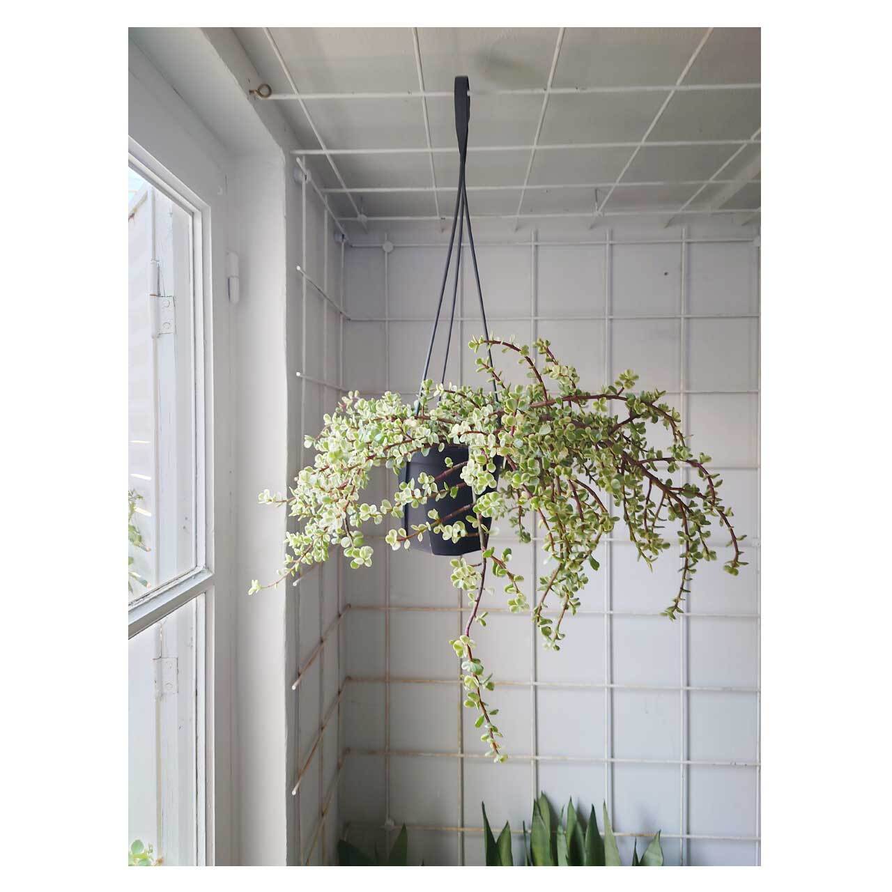 枝が横に這うように伸びて重みで垂れ下がるため、今回のようにハンギングタイプでも楽しめます。太めの枝はどこか和風な雰囲気もありつつ、明るい色あいなので他の観葉や多肉とあわせても目を惹く存在かなと思います。