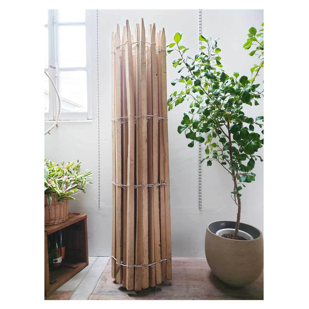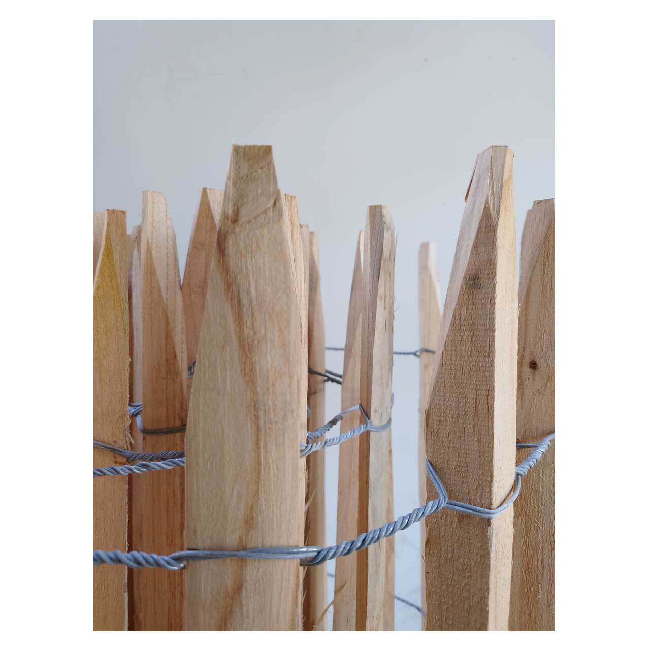 元々は防砂や防雪用に海岸沿いや山で利用されているもので、耐久性の高いヨーロッパ栗(Castanea sativa)の材を使用し、伝統的な製法で加工製作されています。現地フランスでは公園や公共/商業施設はもちろん、庭の間仕切りやベランダの目隠しなどで、定番アイテムとして幅広く使われています。設置方法やメンテナンスの有無にもよりますが、現地では15~20年くらい、日本では10~15年の耐久性です。防腐剤を塗布することで、より長持ちさせることもできます。