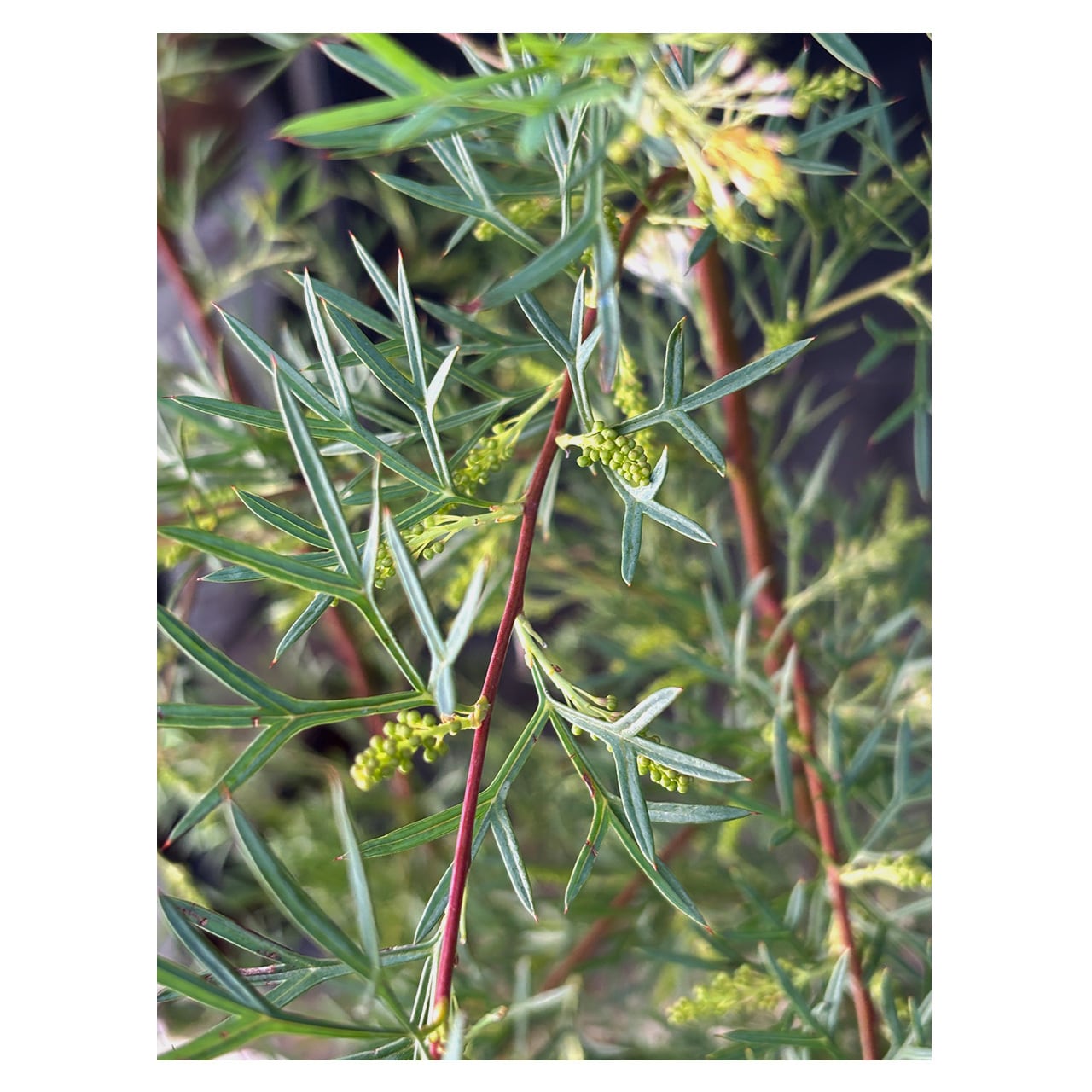 葉は深く切れ込みが入り、先端が鋭く尖っているため不意に触ると痛いので注意が必要ですが、流通が少なめの品種なので、ちょっと珍しいグレビレアをお探しの方や、派手な花は好まないけどグレビレアに興味がある方にもおすすめです。