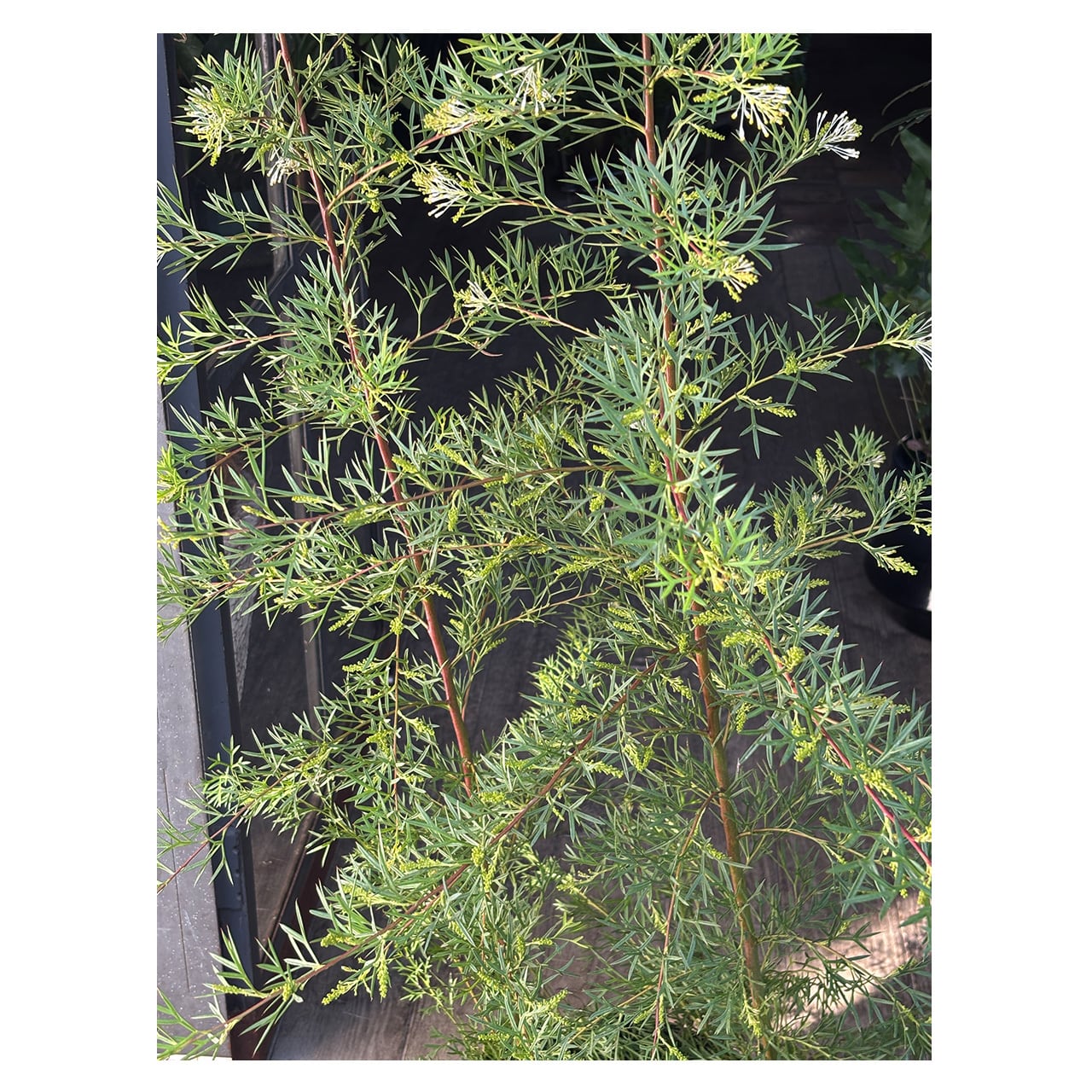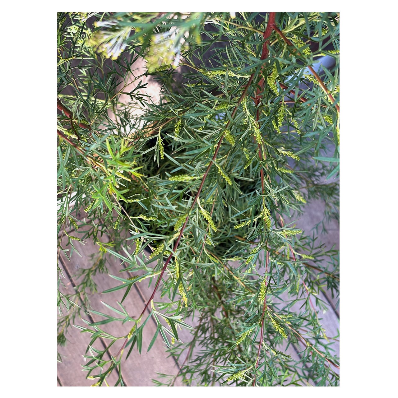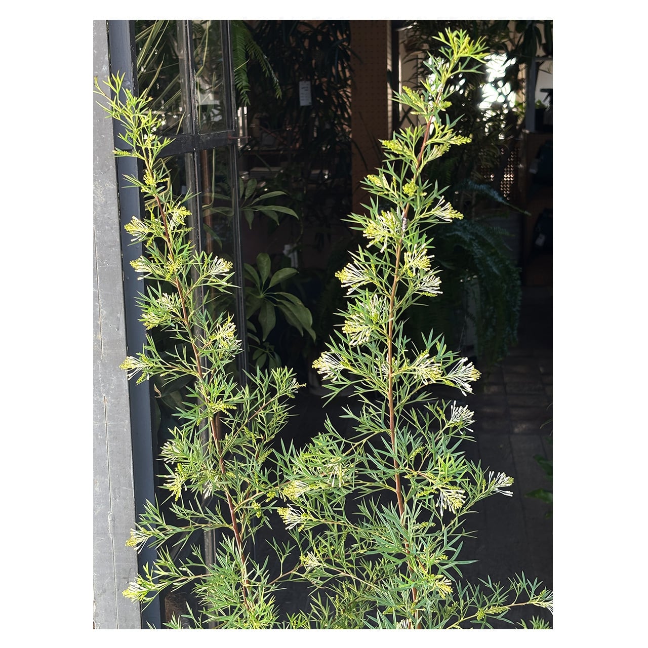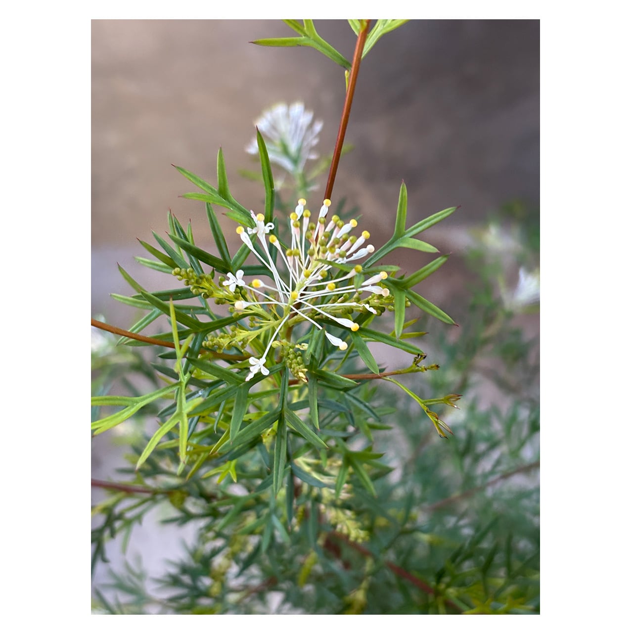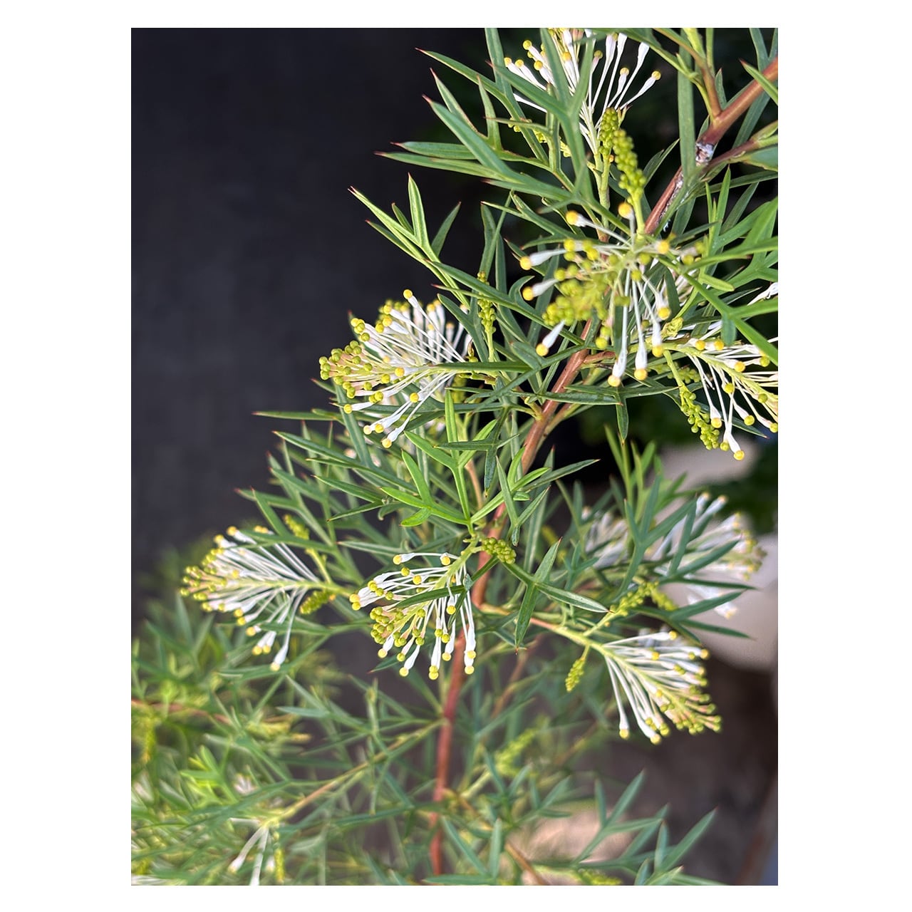 オーストラリアを中心に250種ほどが知られているグレビレア。グレビレアといえば花はエキゾチックな雰囲気で派手な色のものが多い印象ですが、こちらのホワイトウィングスの花は白い糸のような繊細な花です。