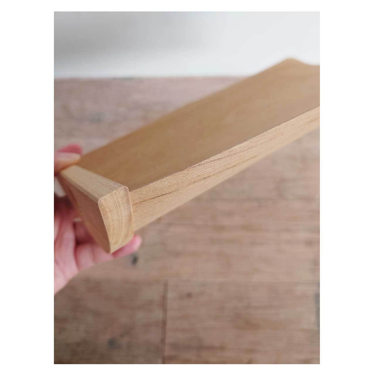 チリトリにしては薄すぎて割れそう…と思われますが、薄くスライスした木の間に特殊なシートを挟んで3枚構造になっており、強度も保たれています。ゴミをすくう際には床面にフィットするので、細かなゴミも拾いやすいかと思います。