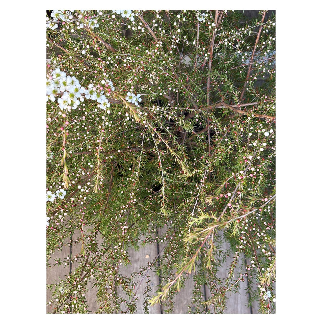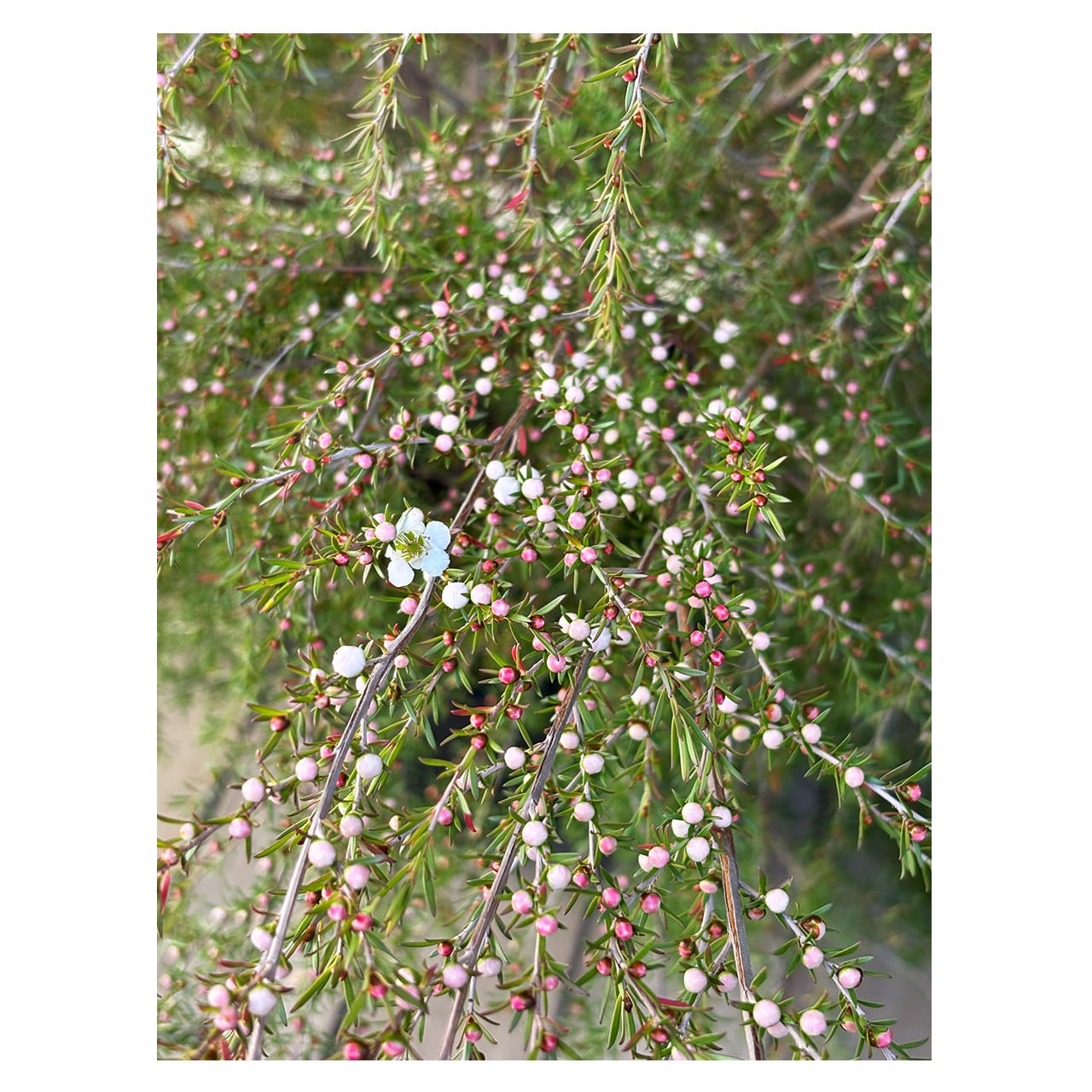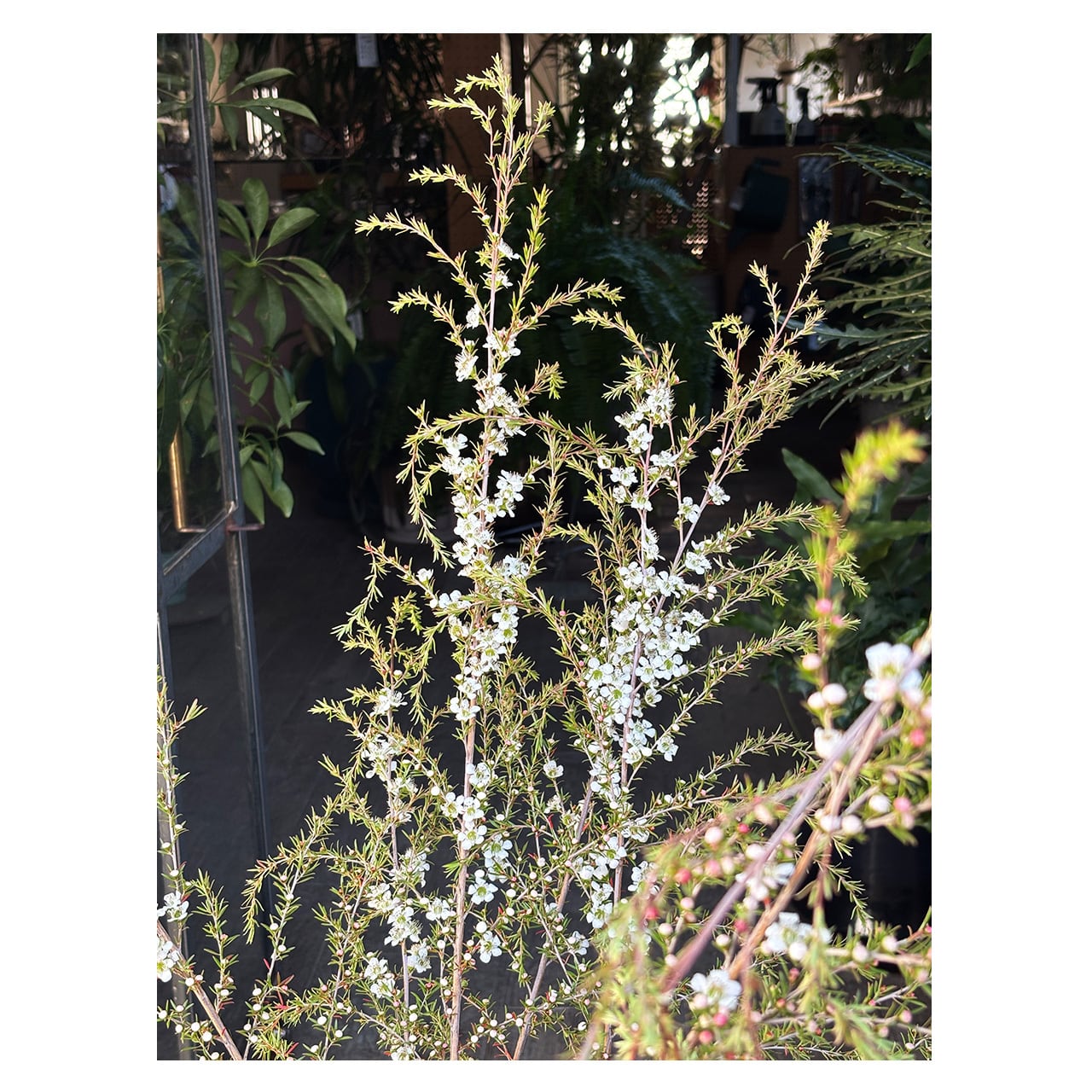 オーストラリア原産のフトモモ科の常緑低木で、レプトスペルマム=ギョリュウバイの仲間です。細かな葉は寒さに当たると紅葉し、春に梅の花に似た白い花をたくさんつけます。