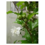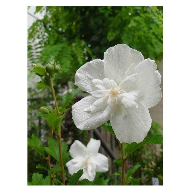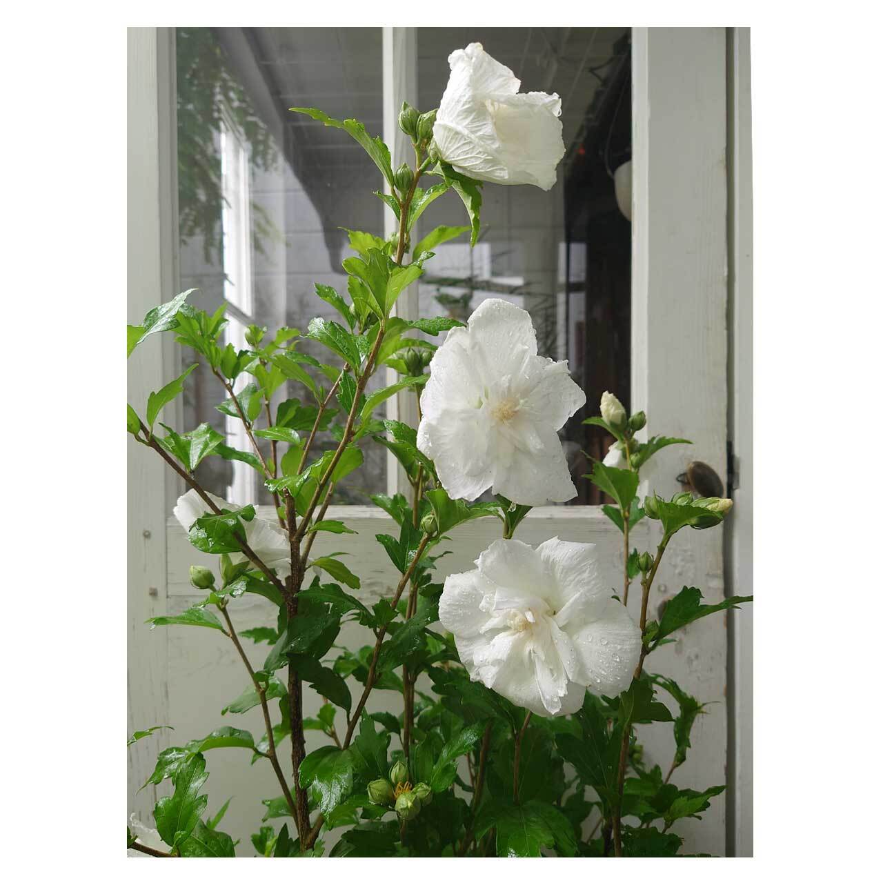 ムクゲは真夏に美しい大きな一日花を次々につける、ハイビスカスの仲間の落葉低木です。こちらのホワイトシフォンは、大きな花びらの中央に細く小さな花びらがレースのように折り重なっているのが特徴で、シフォンの名の通り柔らかな印象の花です。