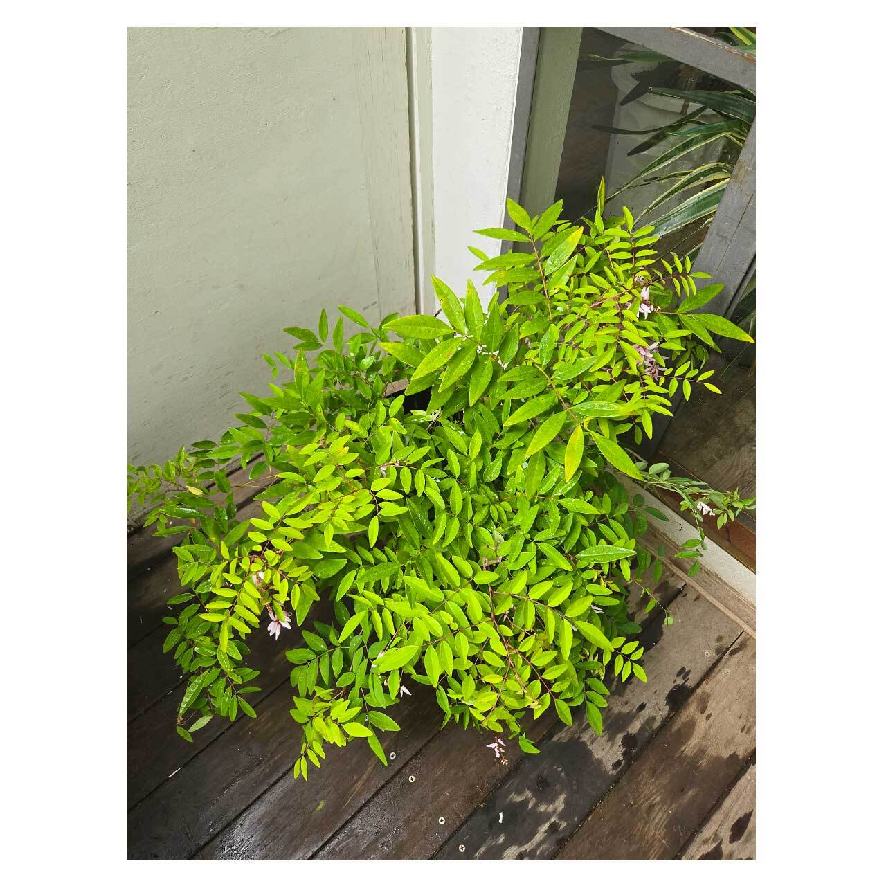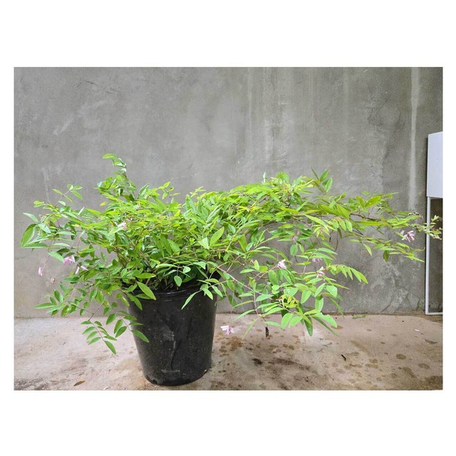 藤の花のようなフォルムの、白~ピンクの花がかわいらしい ニワフジ。ライトグリーンの葉も美しく明るい印象です。