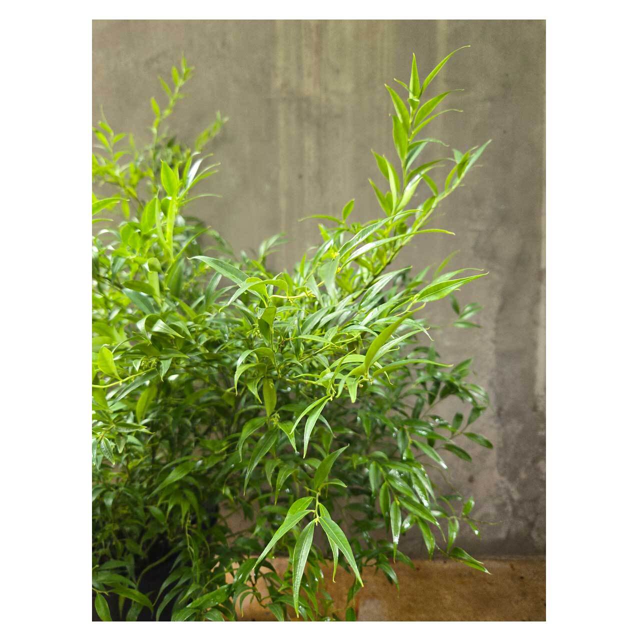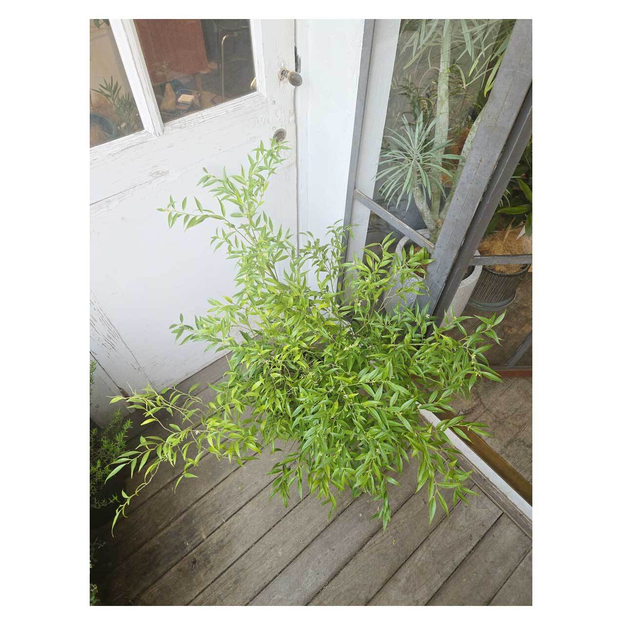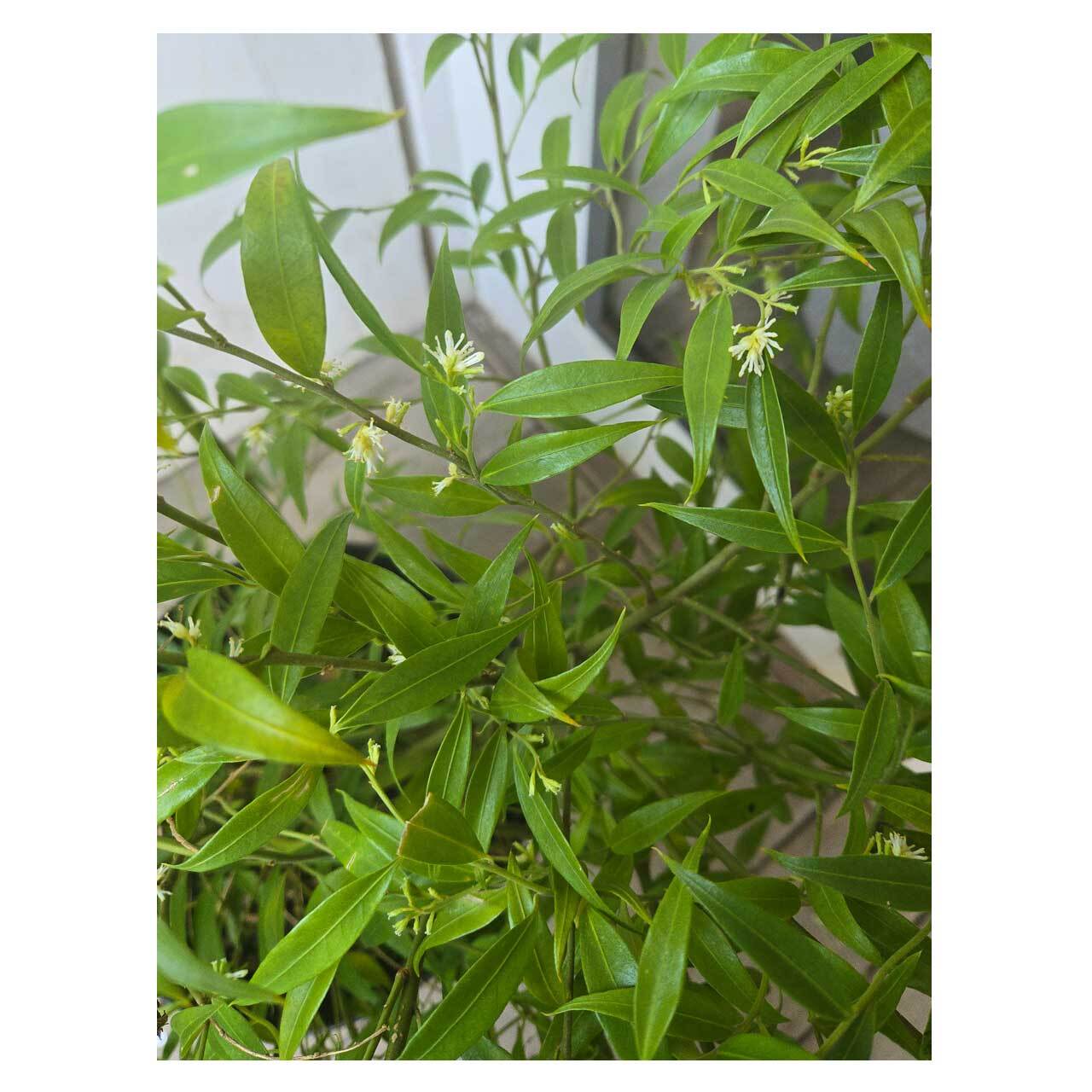 光沢のある濃い緑の葉がわさわさと茂る、細葉のサルココッカ フミリス。