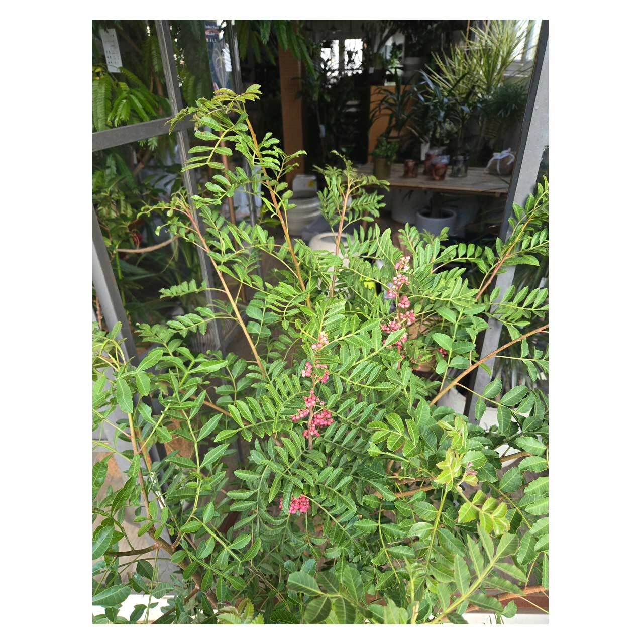 ウルシ科サンショウモドキ属、南米原産の常緑小高木で、サンショウモドキ、アカツユなど別名がたくさんあります。羽状複葉で、葉の縁はわずかにギザギザしています。雌雄異株で初夏に白い花が咲き、雌木はその後に赤い実をつけます。都内では地植えでも越冬しますが、寒さが厳しいと落葉します。